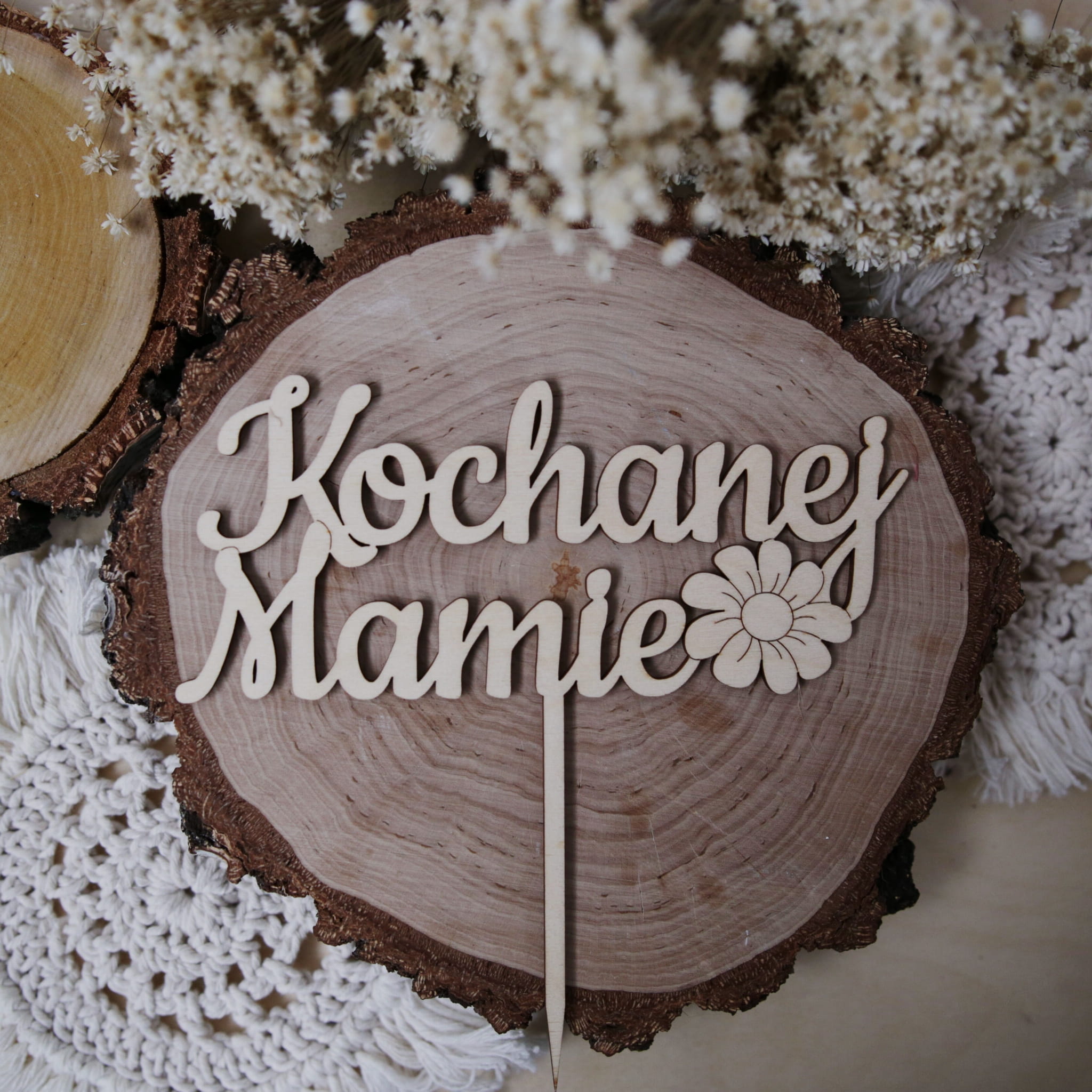 Drewniany topper z napisem "Kochanej mamie" z kwiatkiem