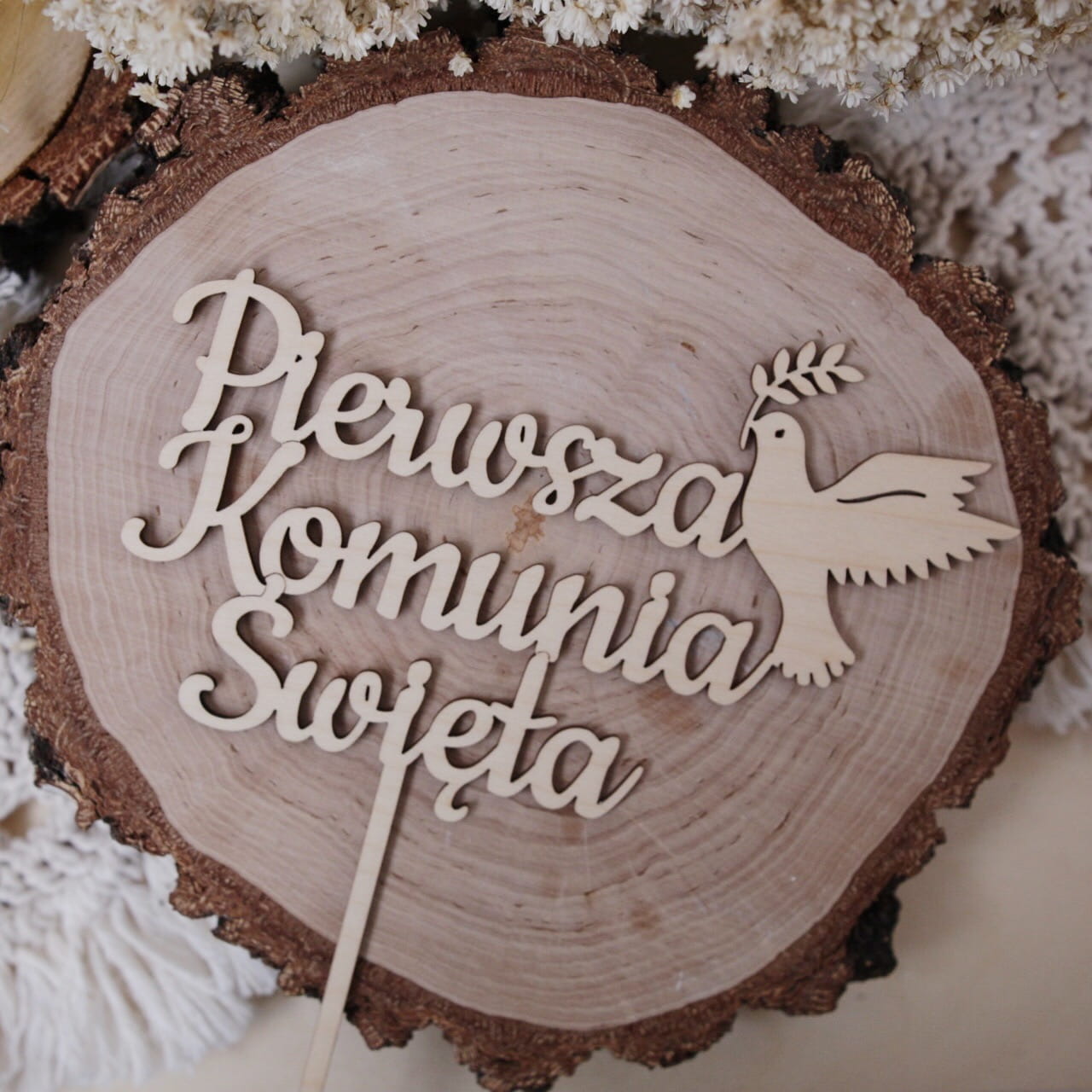 Drewniany topper z napisem "Pierwsza Komunia Święta"