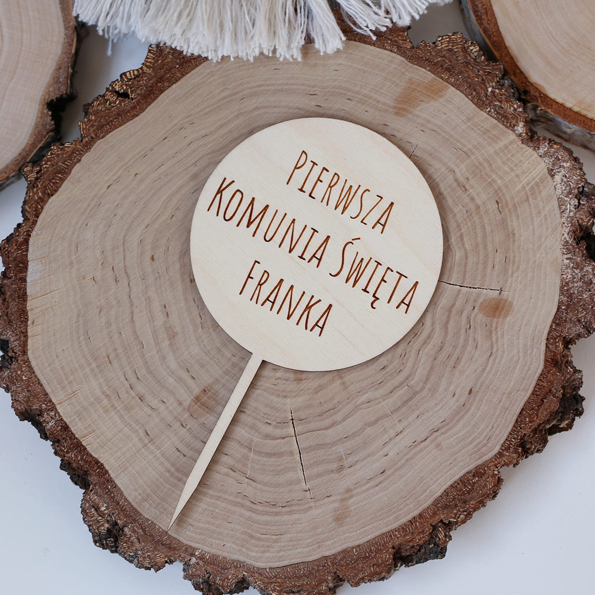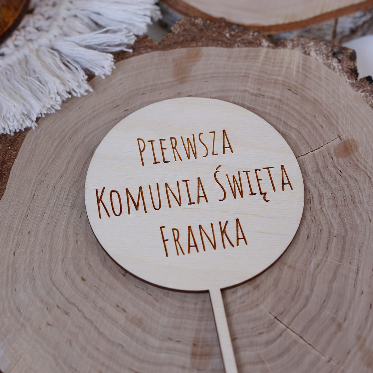 Drewniany topper z grawerowanym napisem: PIERWSZA KOMUNIA ŚWIĘTA FRANKA