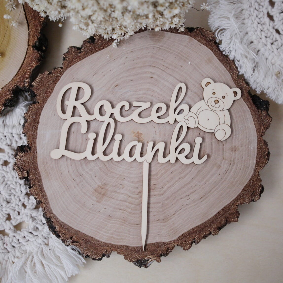 Drewniany topper z napisem "Roczek Lilianki" z misiem