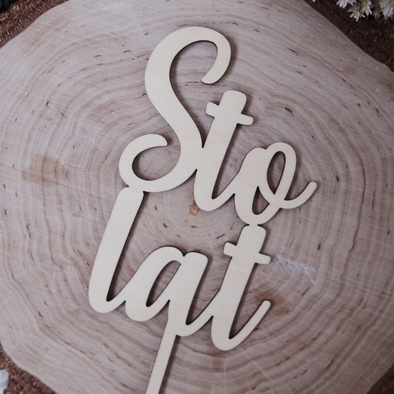 Drewniany topper z napisem "Sto lat"