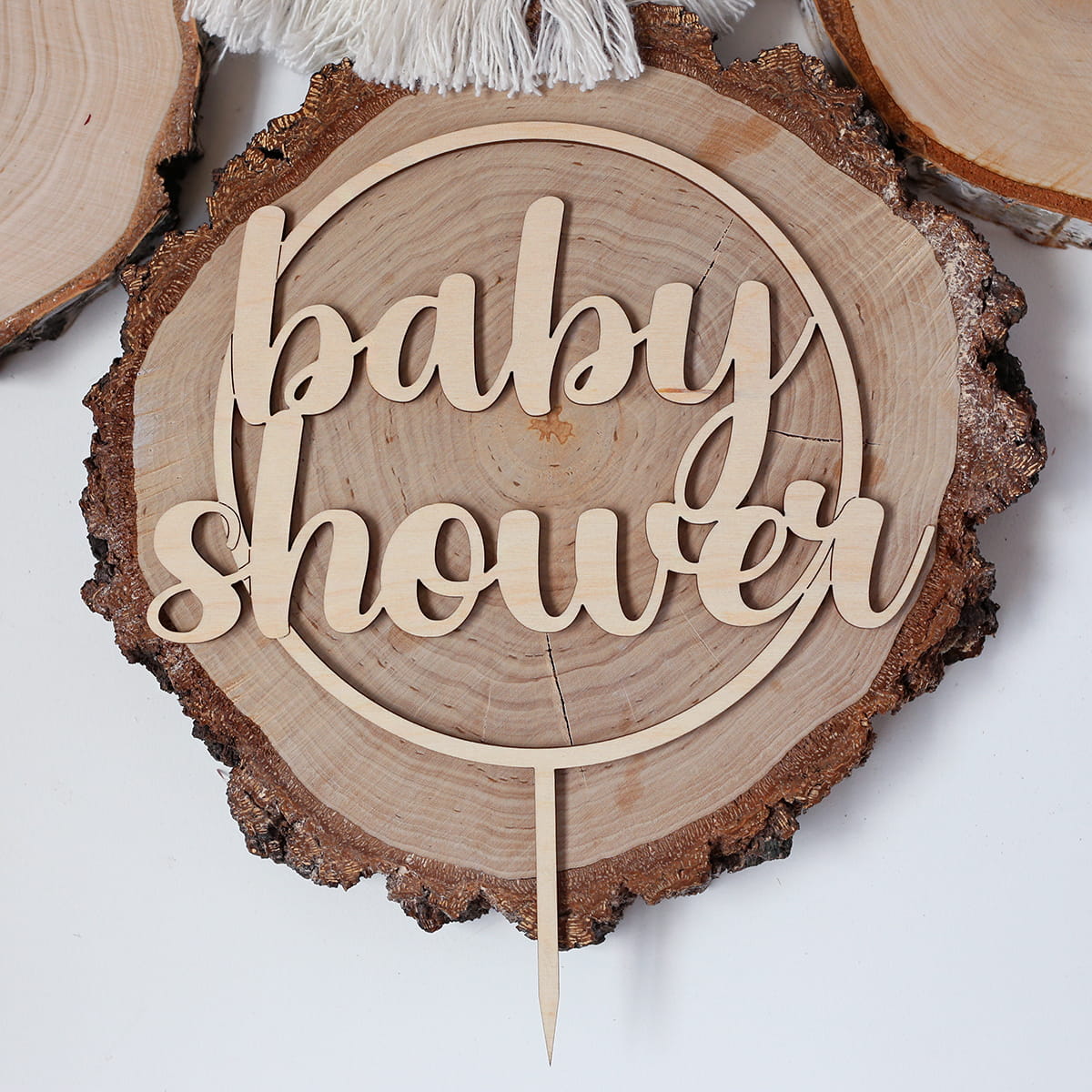 Drewniany topper z napisem "baby shower" w okręgu.