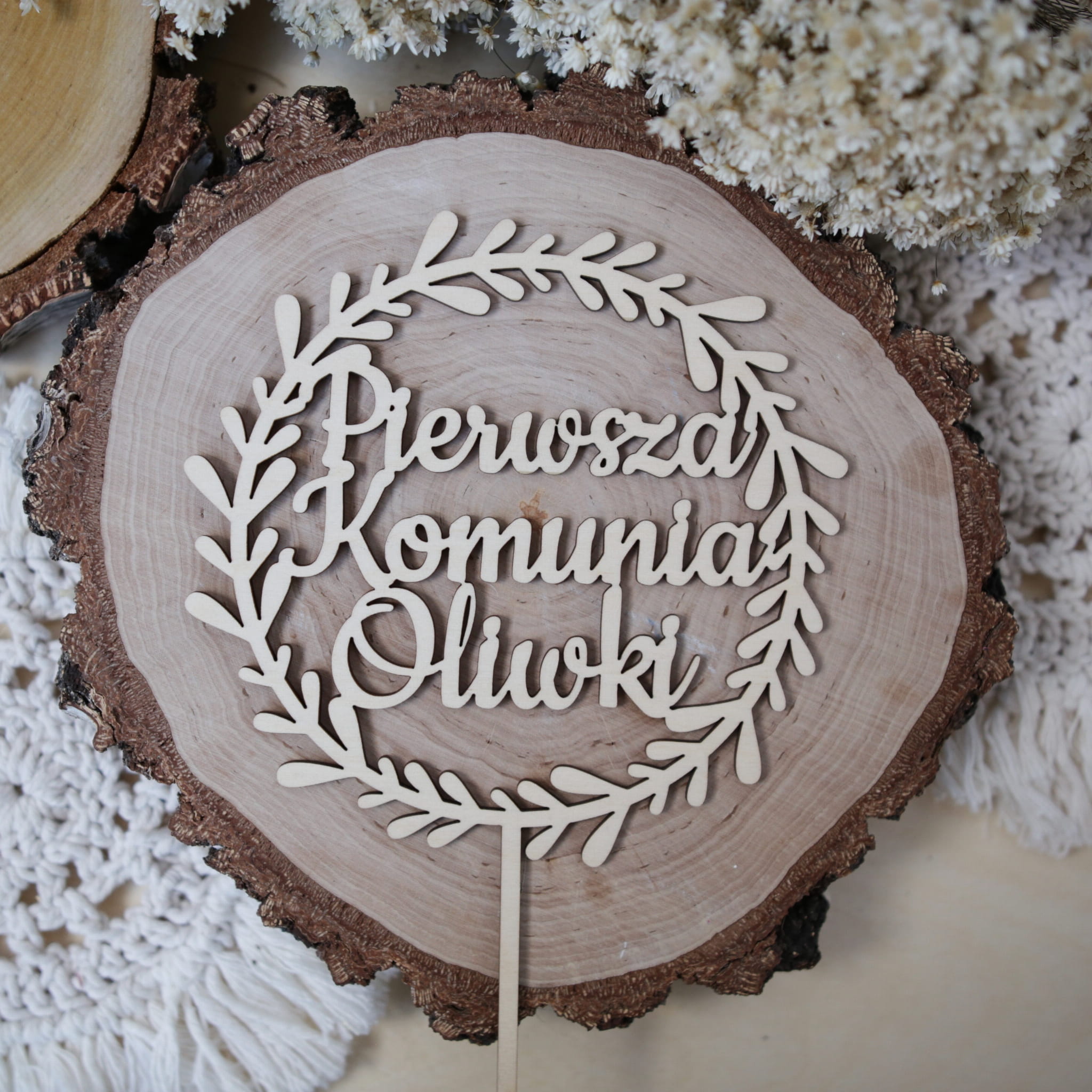 Drewniany topper z motywem roślinnym z napisem "Pierwsza Komunia Oliwki"