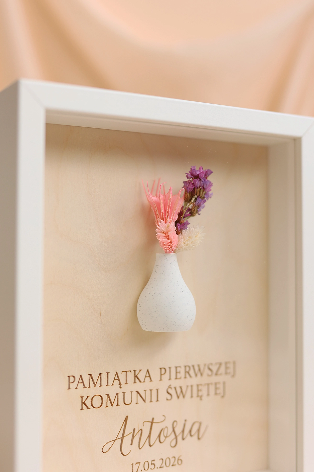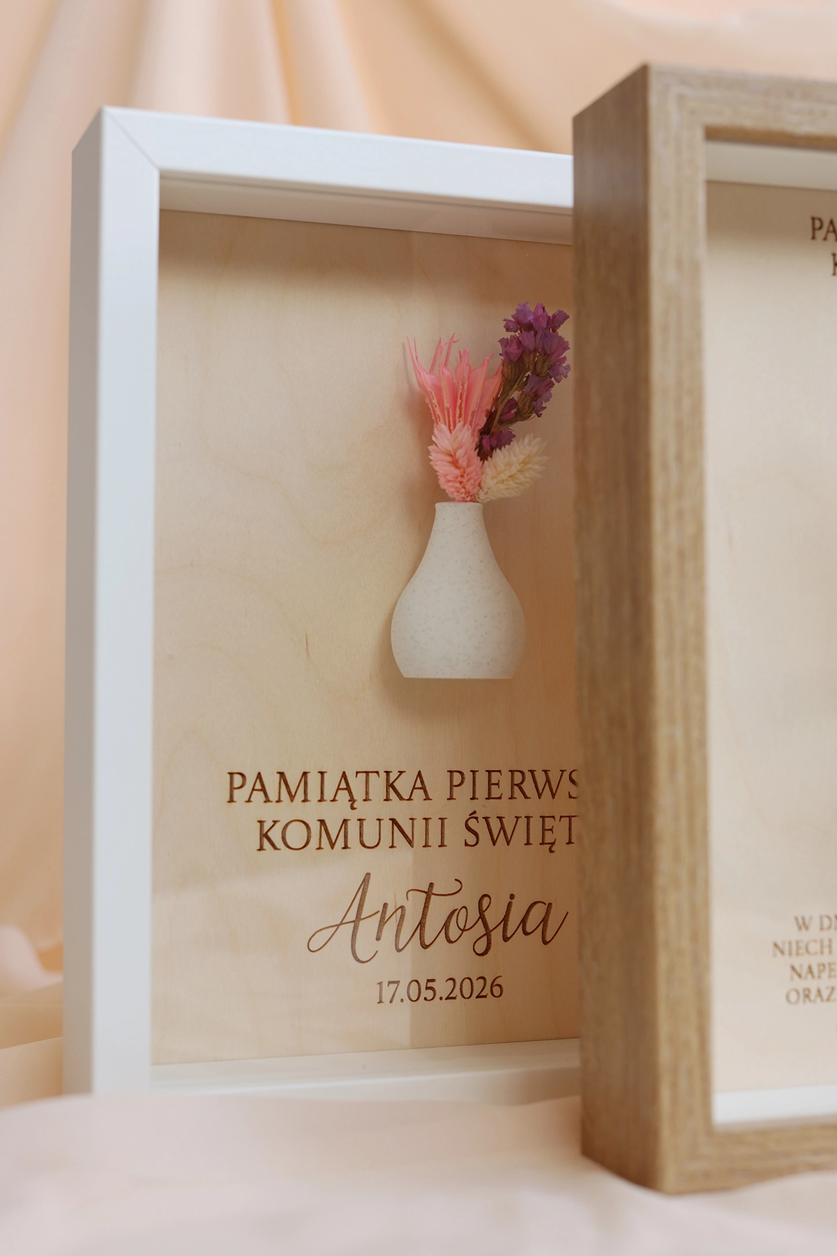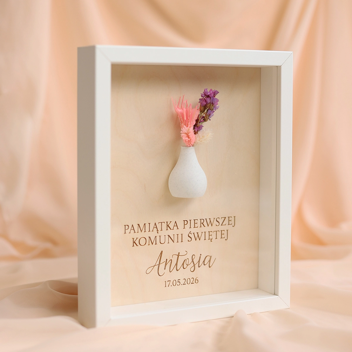 W ramce znajduje się krótka, personalizowana dedykacja, dzięki której prezent nabiera indywidualnego i wyjątkowego charakteru. Całość uzupełnia subtelny wazonik z suszonym bukiecikiem, który dodaje dekoracji naturalnego uroku i lekkości.