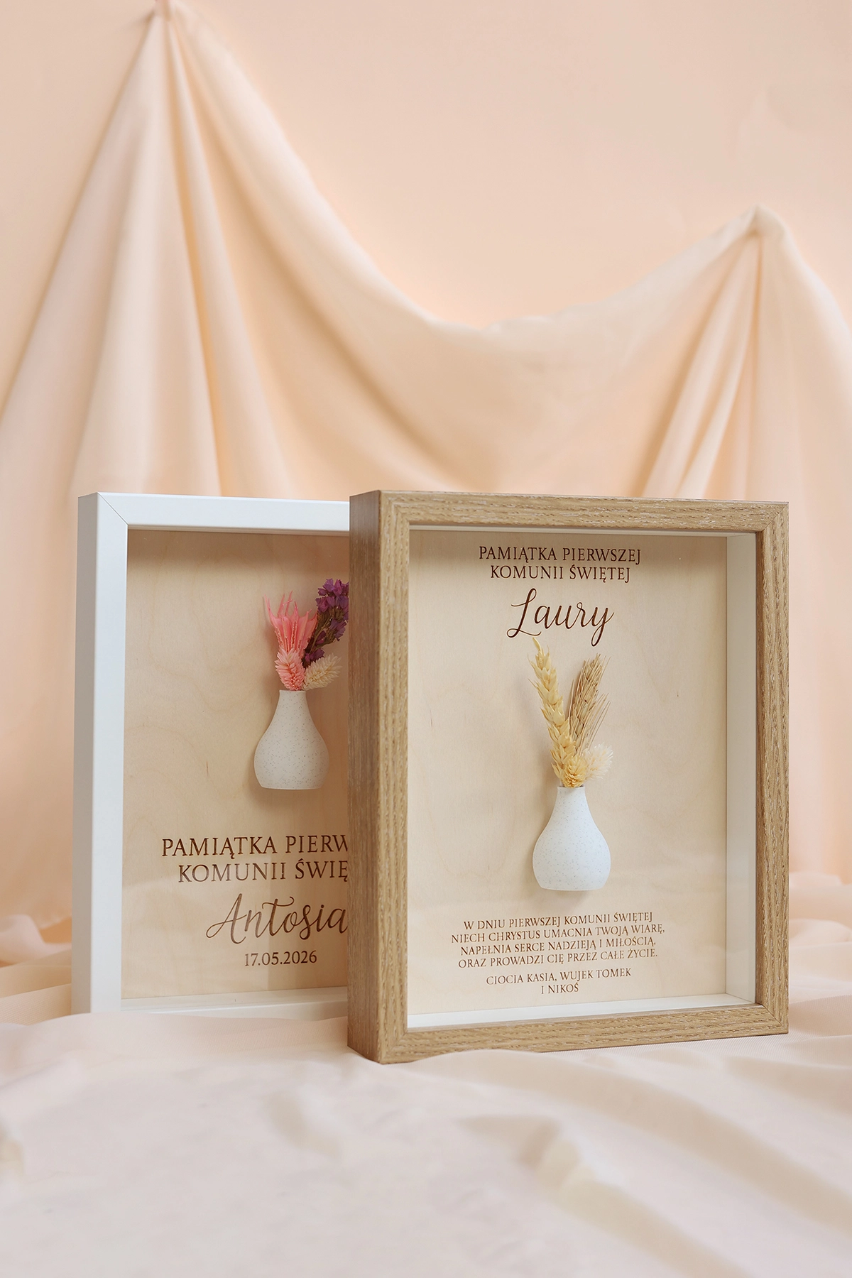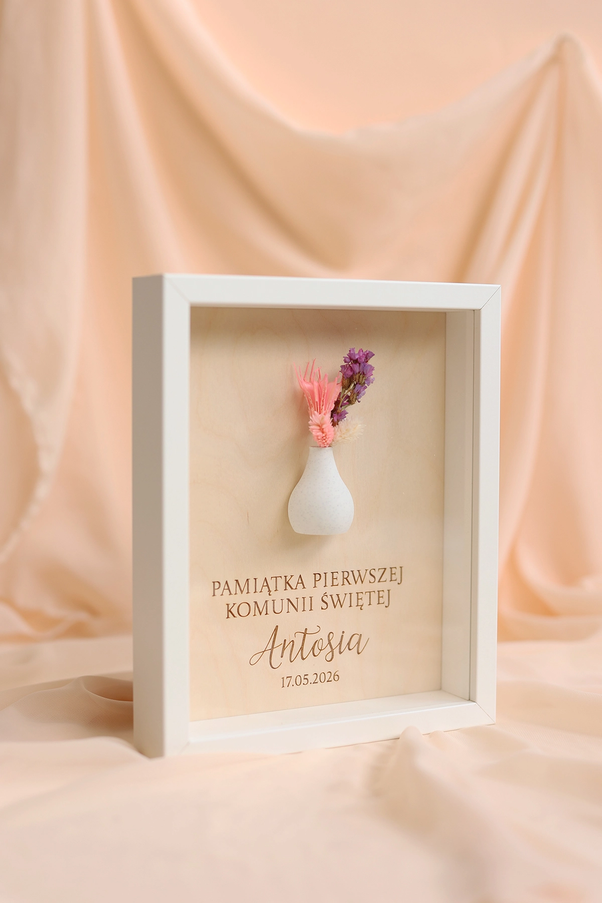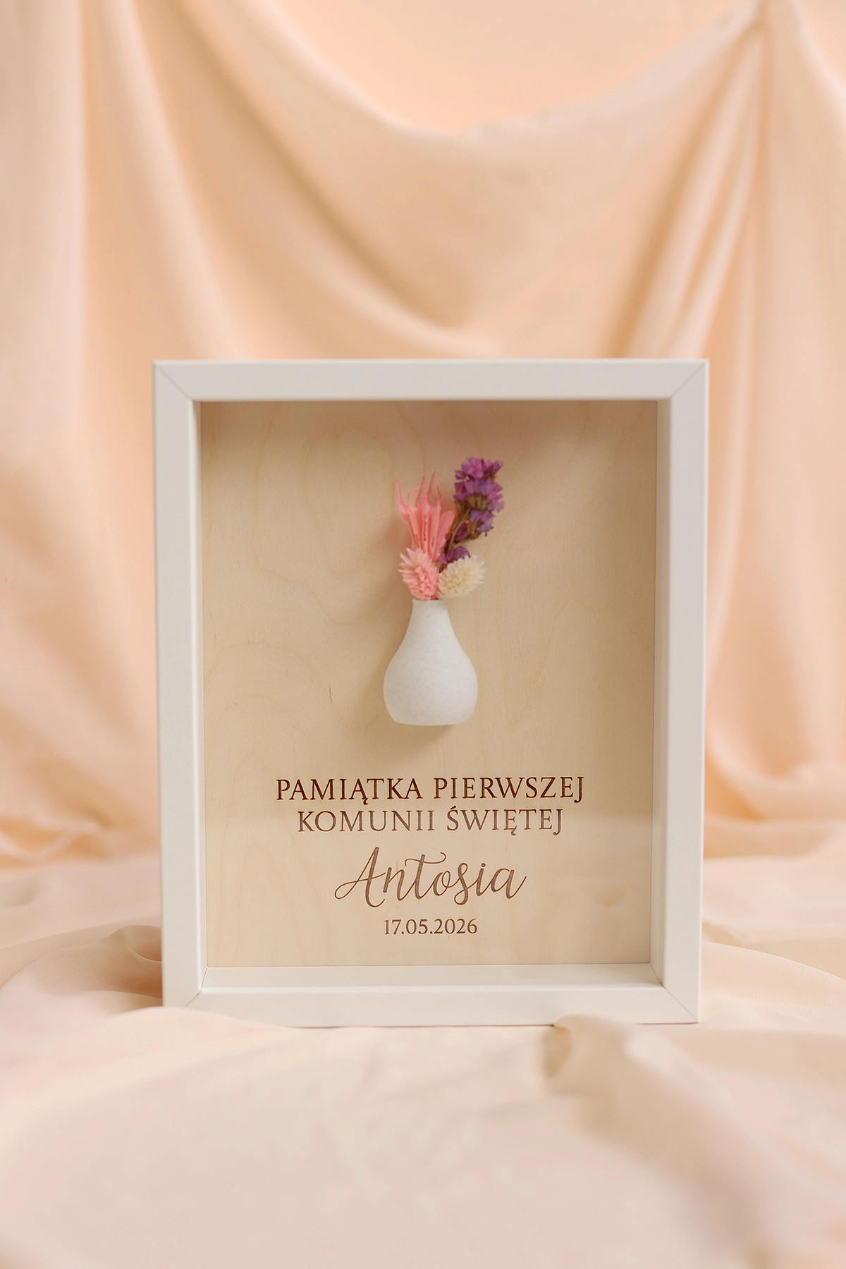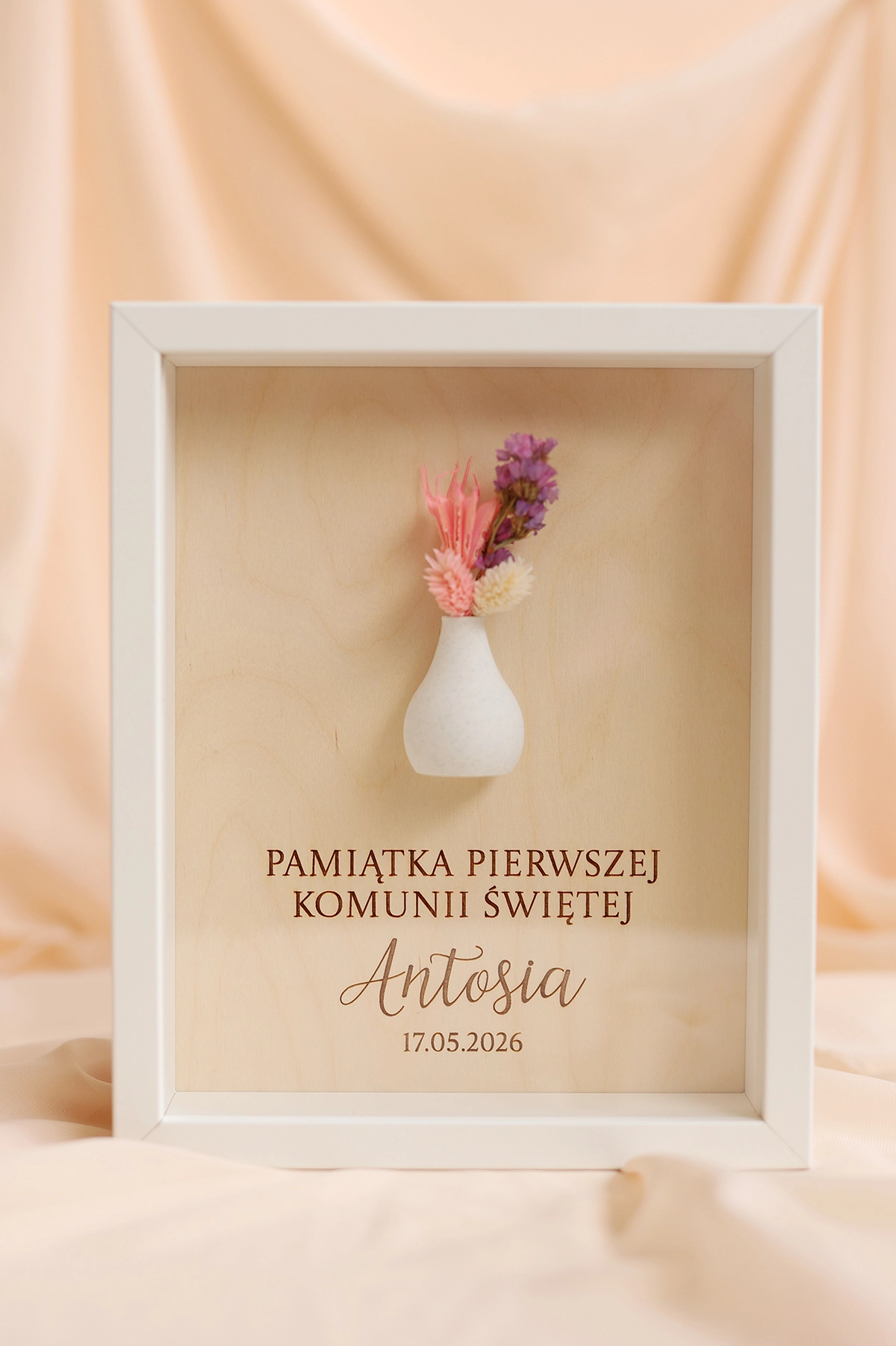 W ramce znajduje się krótka, personalizowana dedykacja, dzięki której prezent nabiera indywidualnego i wyjątkowego charakteru. Całość uzupełnia subtelny wazonik z suszonym bukiecikiem, który dodaje dekoracji naturalnego uroku i lekkości.