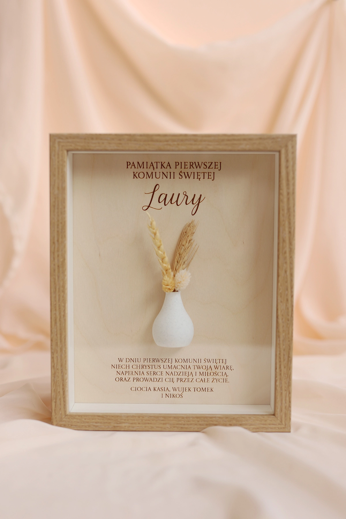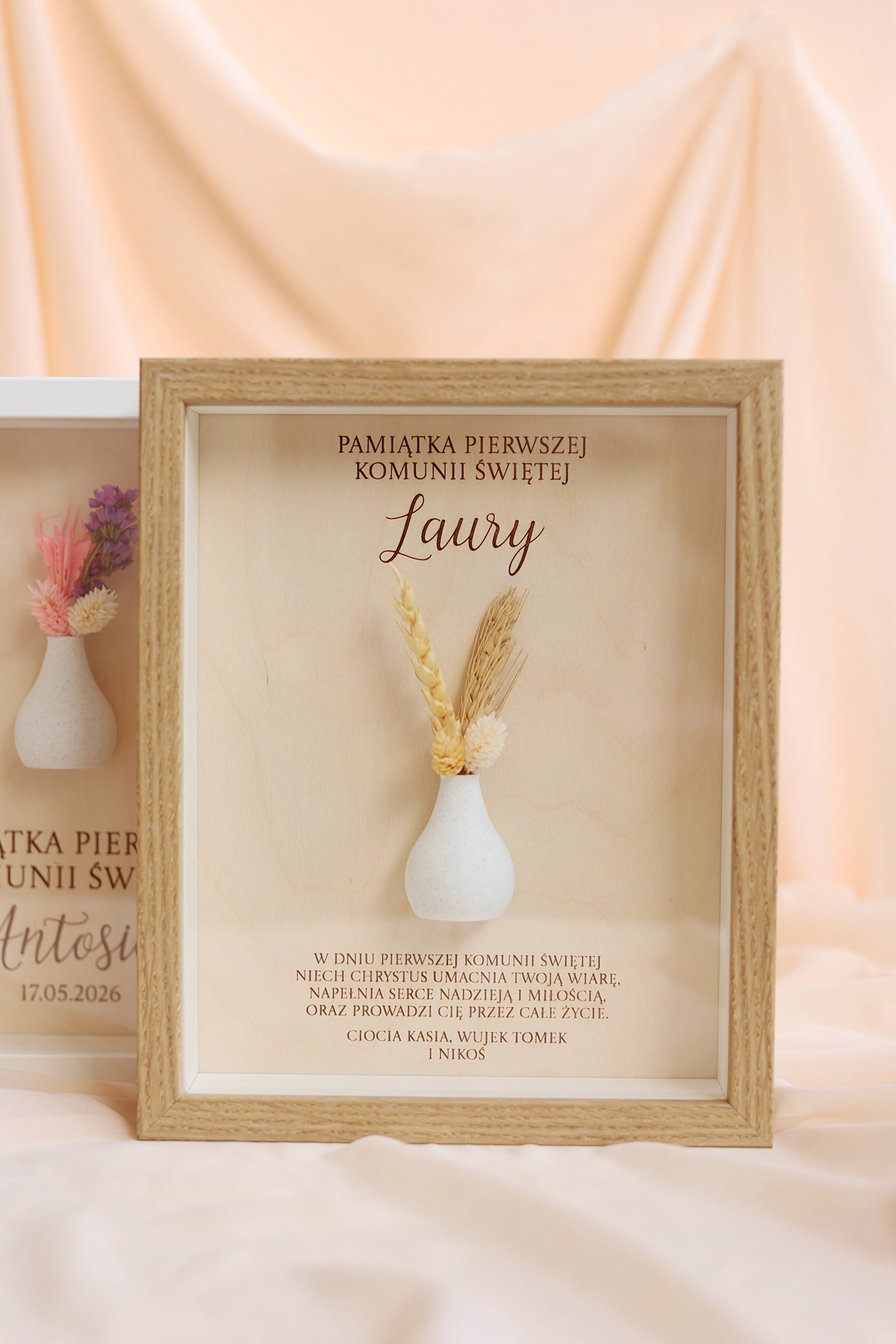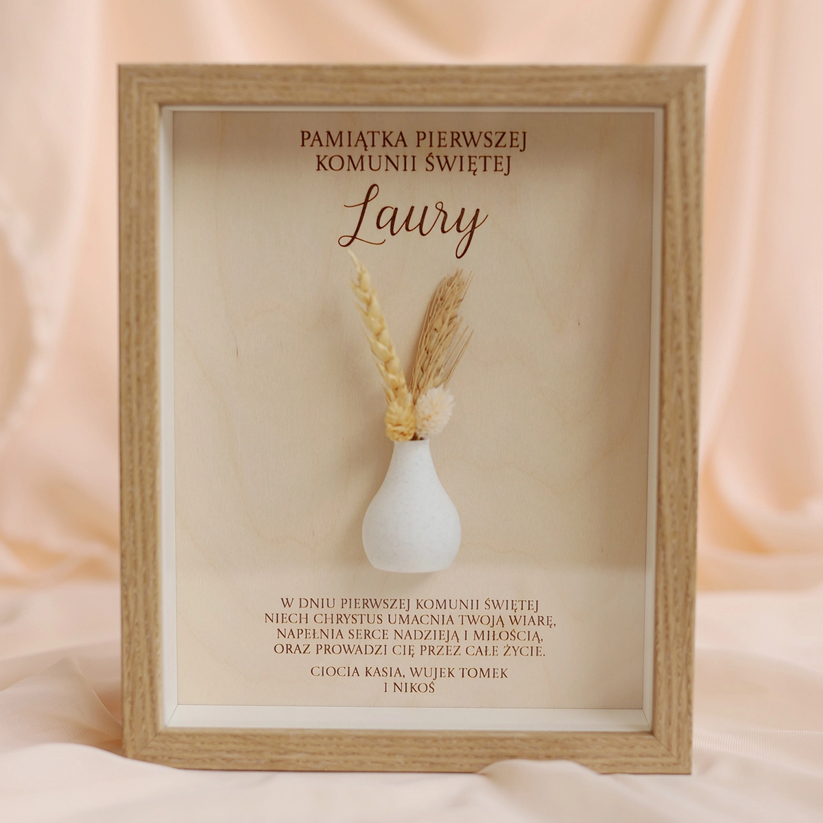 W ramce znajduje się personalizowana dedykacja oraz życzenia, które nadają całości indywidualnego charakteru. Dodatkowym elementem dekoracyjnym jest subtelny wazonik z suszonym bukiecikiem, który podkreśla wyjątkowość tej pamiątki i nadaje jej naturalnego uroku.