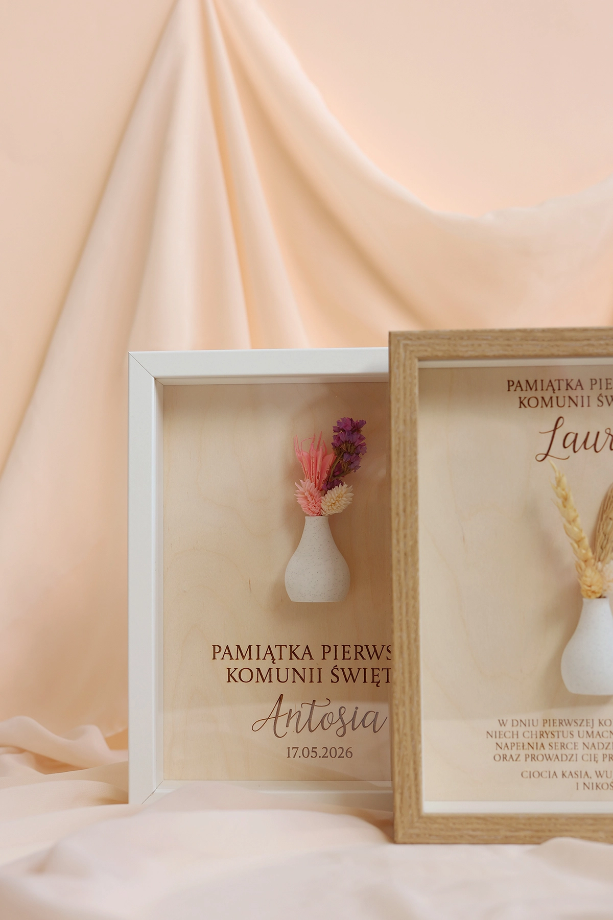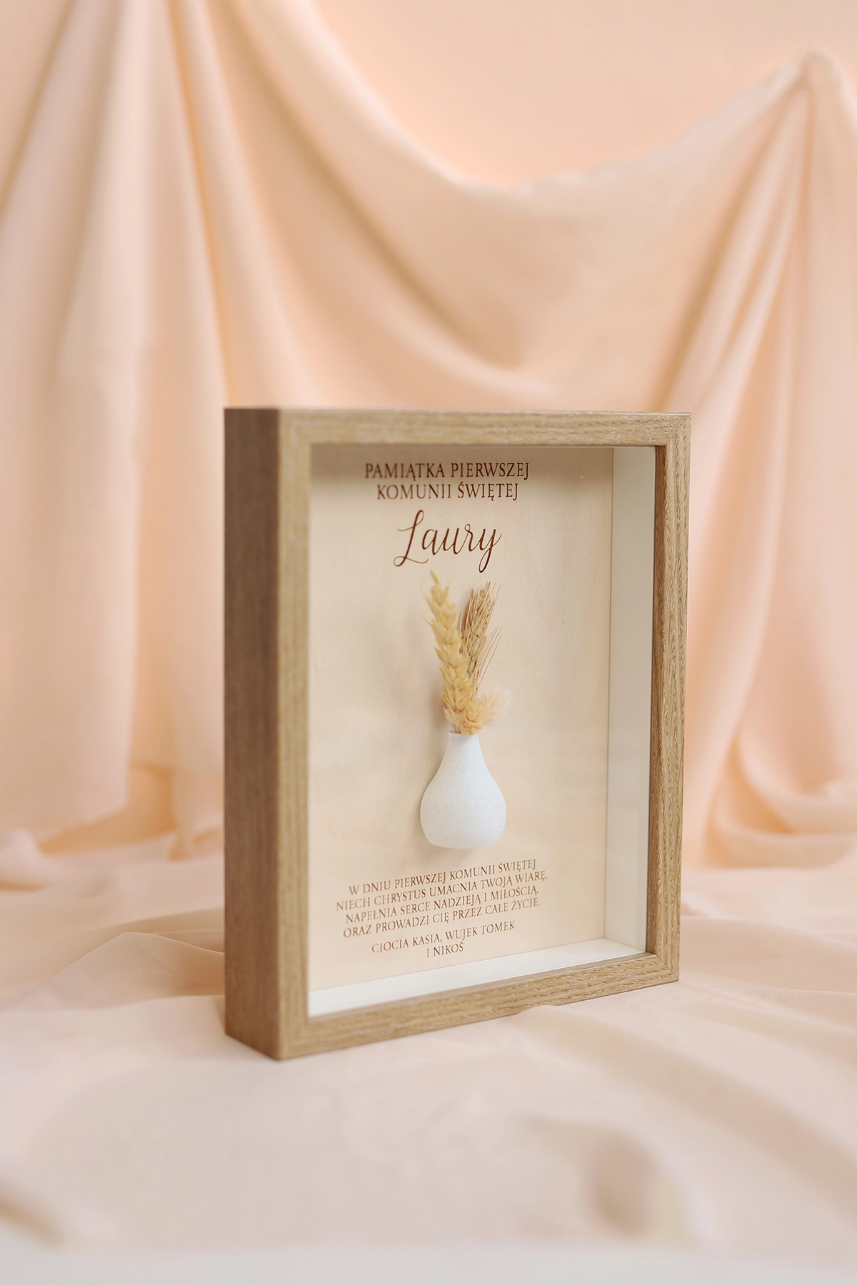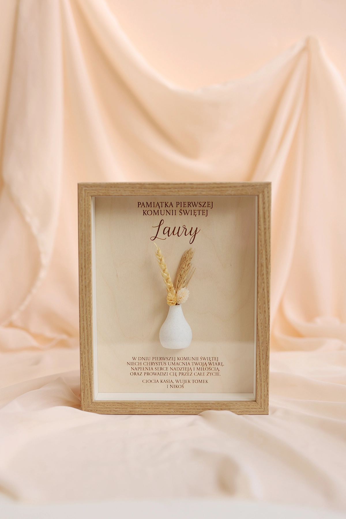 W ramce znajduje się personalizowana dedykacja oraz życzenia, które nadają całości indywidualnego charakteru. Dodatkowym elementem dekoracyjnym jest subtelny wazonik z suszonym bukiecikiem, który podkreśla wyjątkowość tej pamiątki i nadaje jej naturalnego uroku.