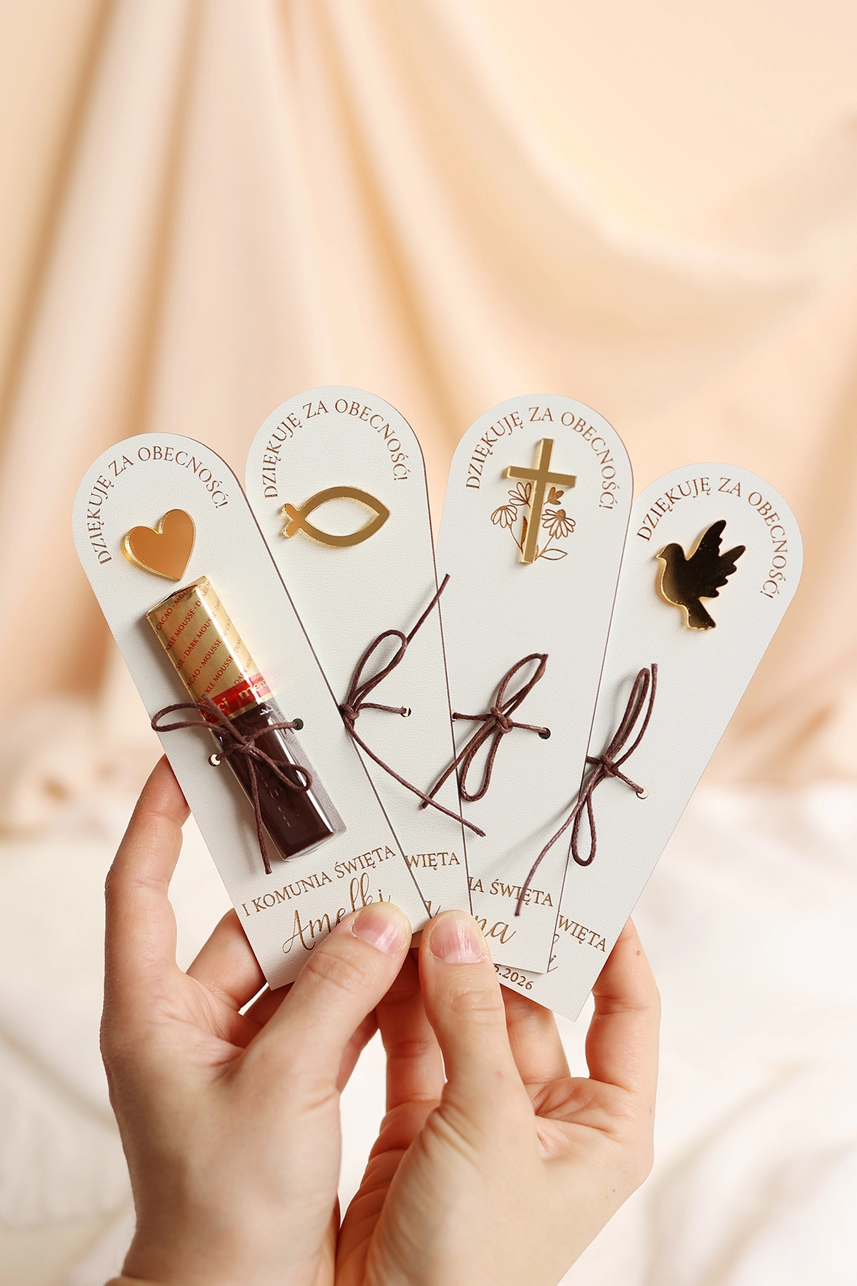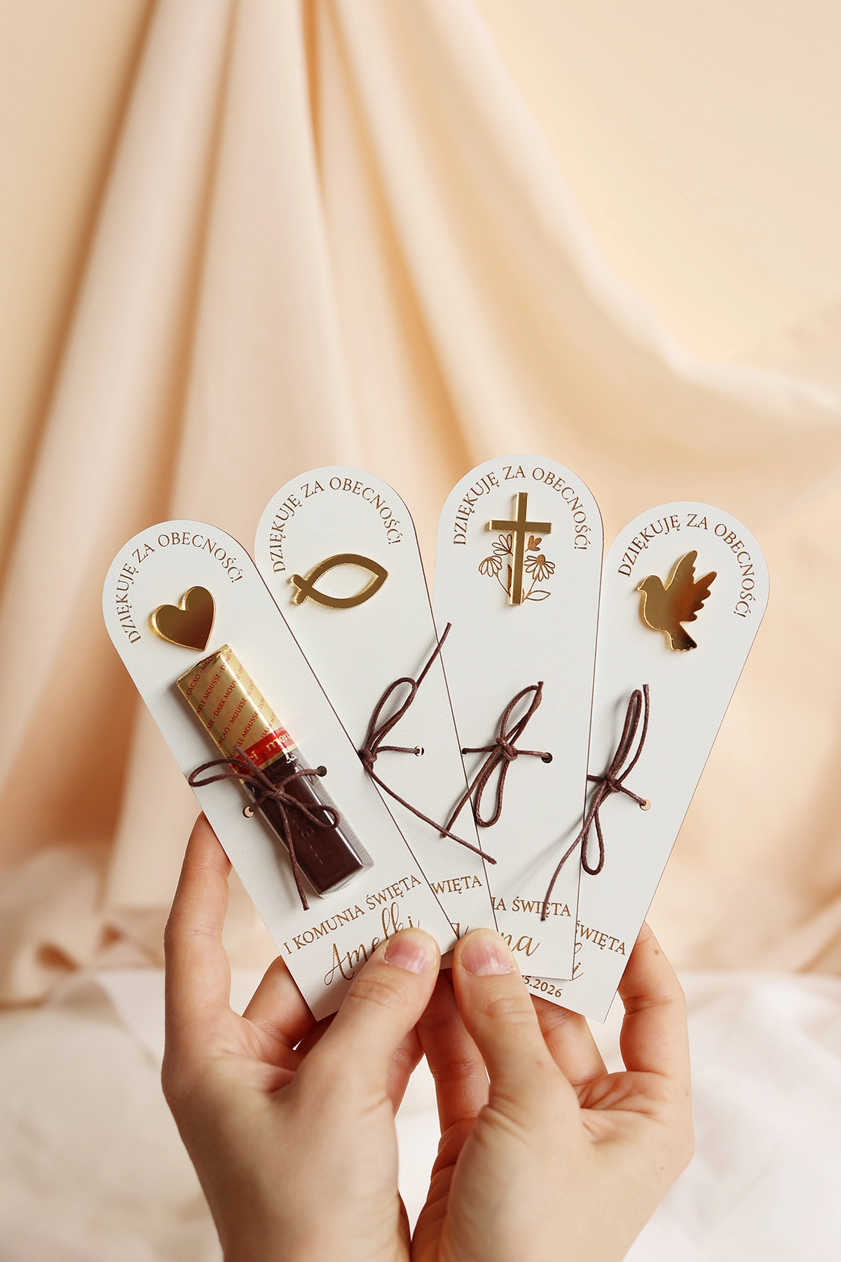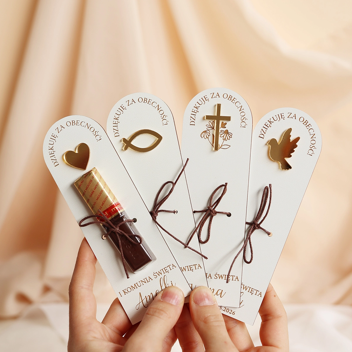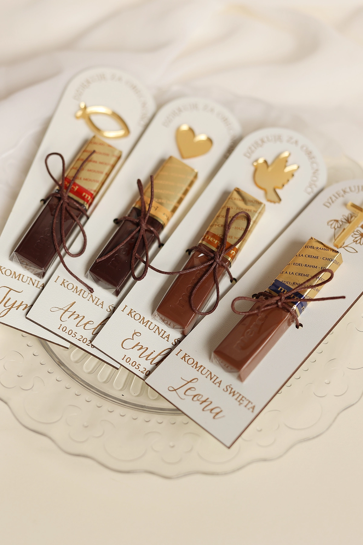 Tabliczki dostępne są w 4 wzorach ze złotymi elementami - serduszko, rybka, krzyżyk lub gołąb.