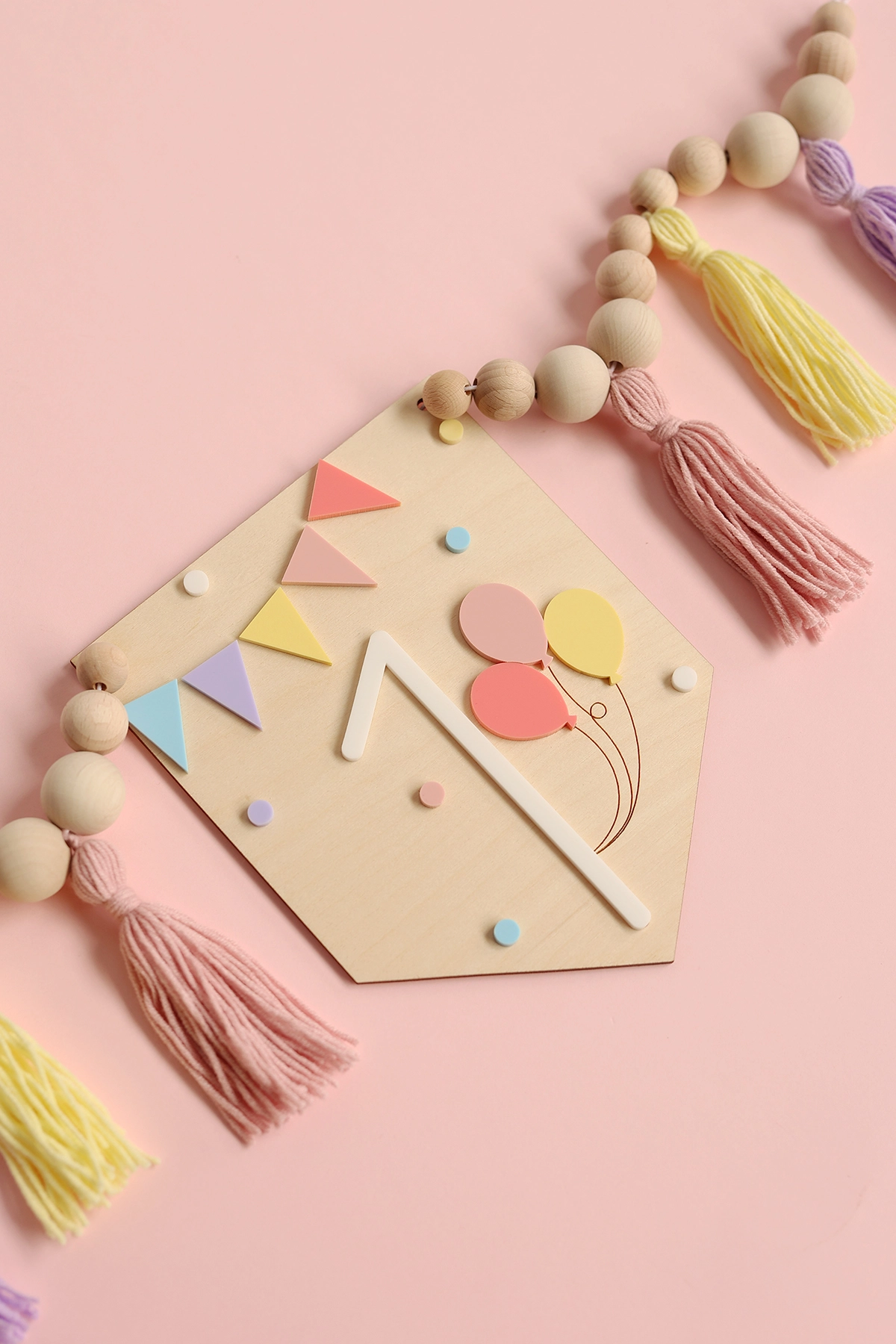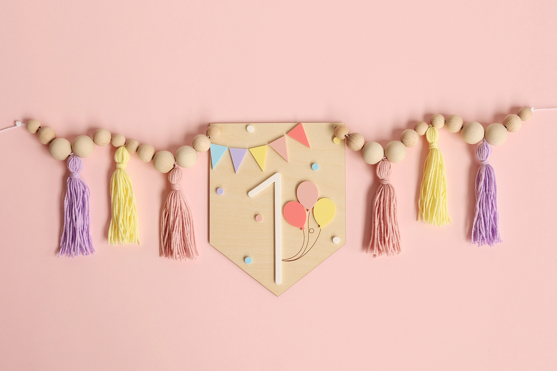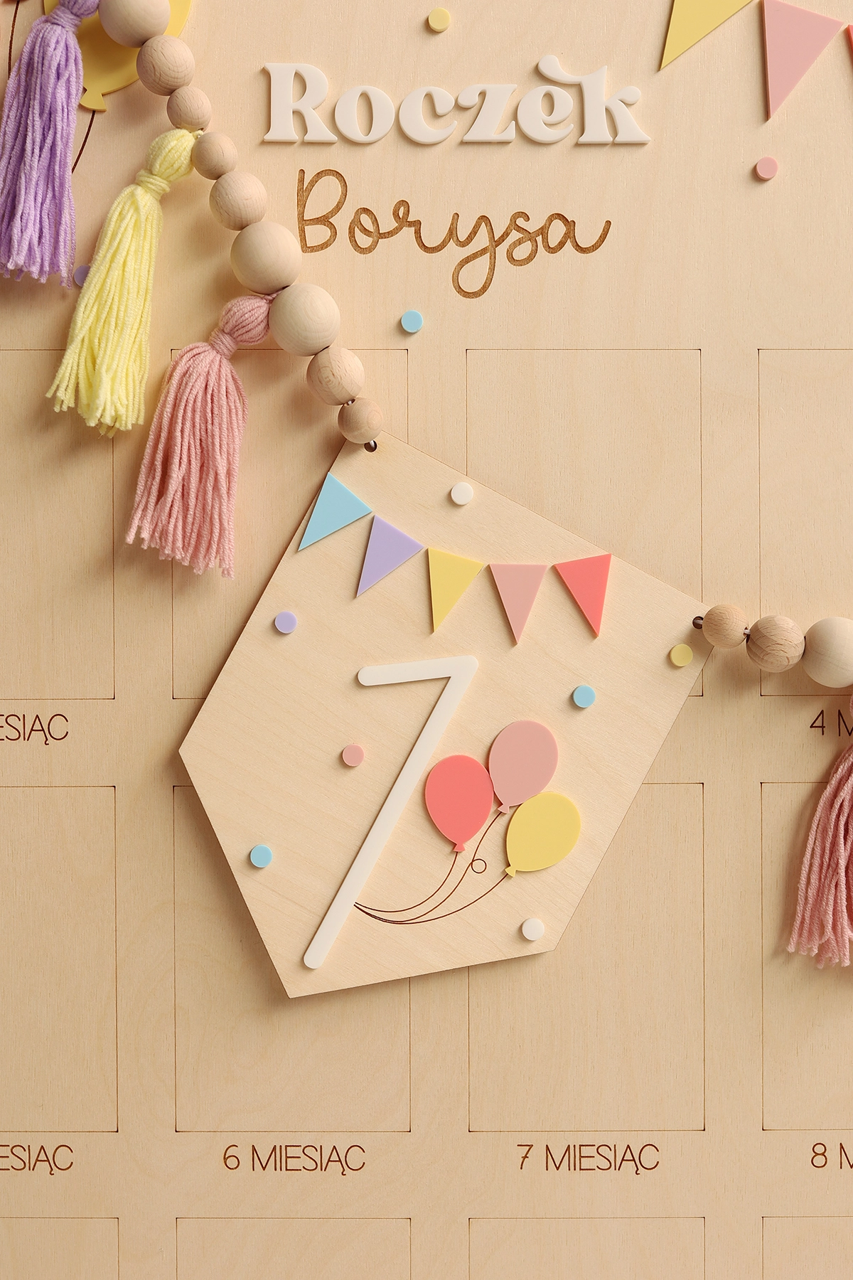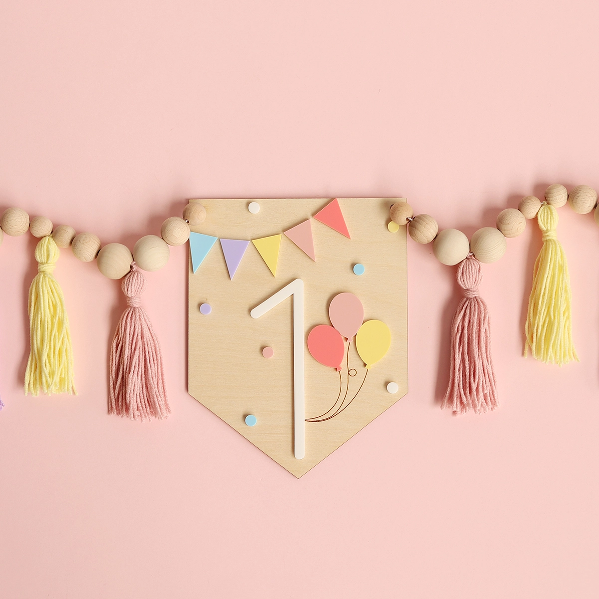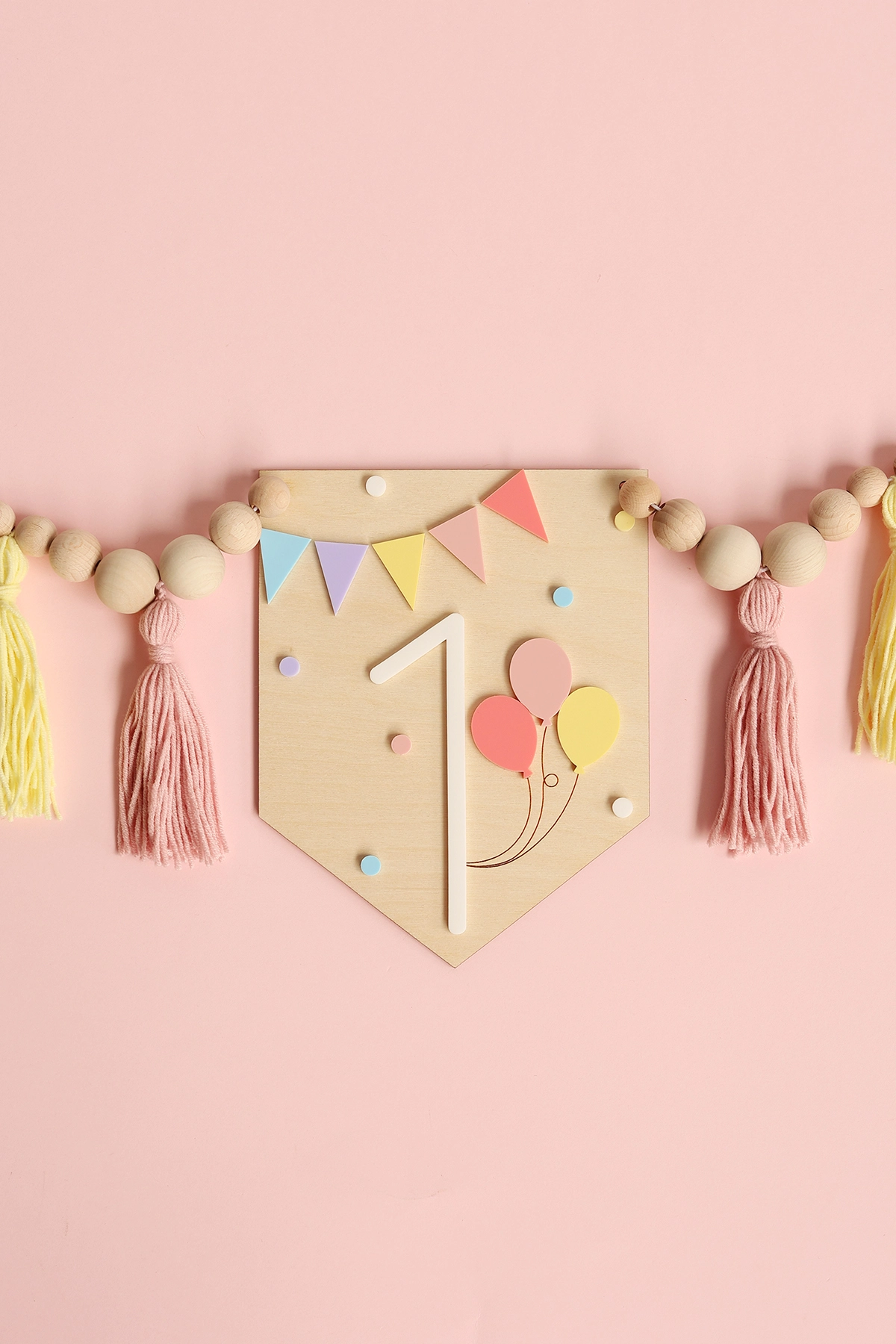 Ozdobny proporczyk z motywem baloników i girlandy oraz cyfrą 1 - idealny jako dekoracja krzesełka solenizanta na pierwszych urodzinach.