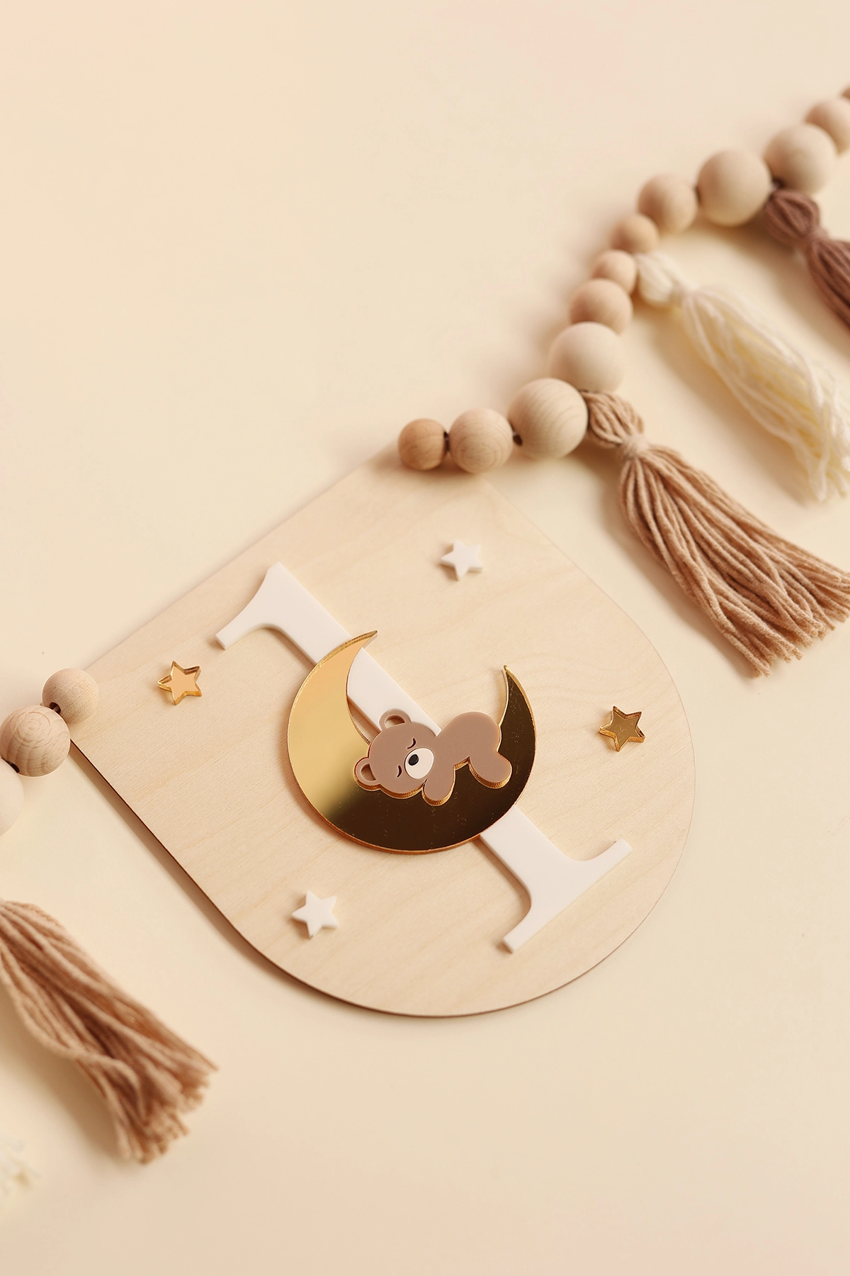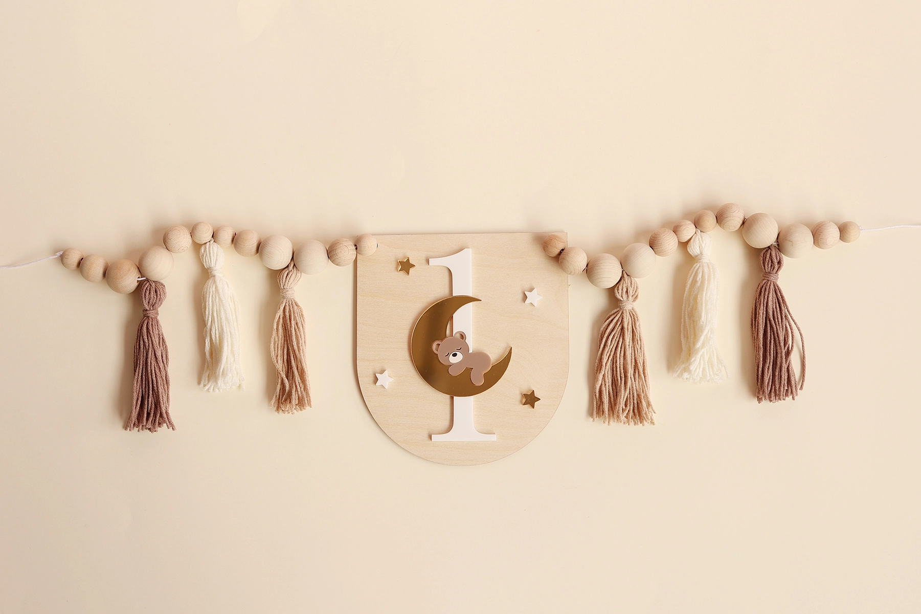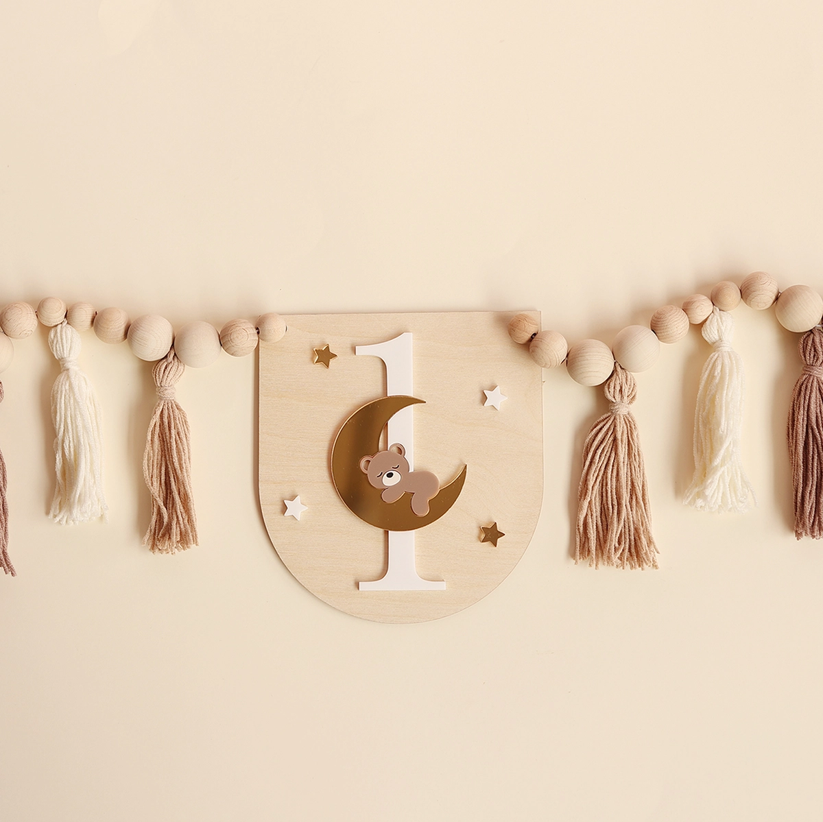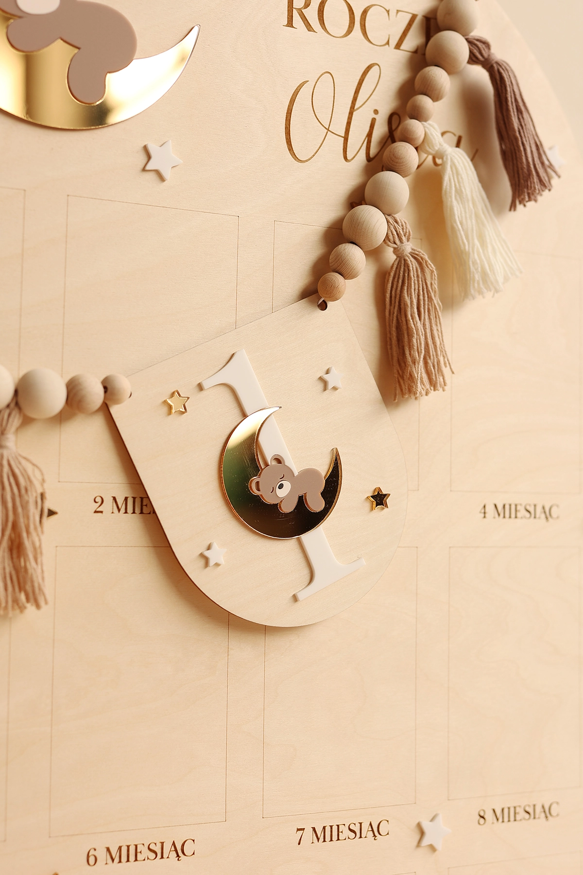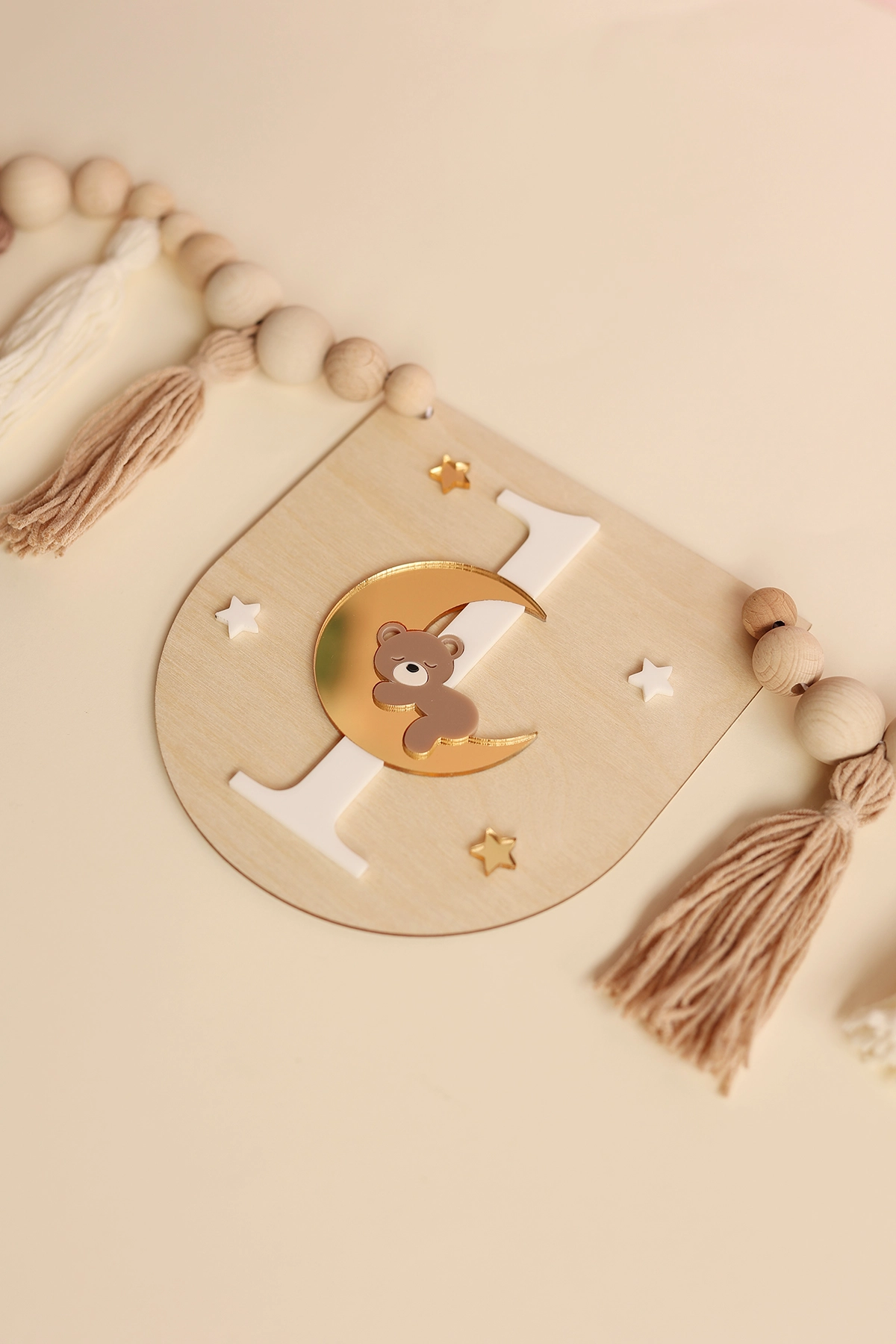 Ozdobny proporczyk z motywem misia na księżycu i cyfrą 1 - idealny jako dekoracja krzesełka jubilata na pierwszych urodzinach.