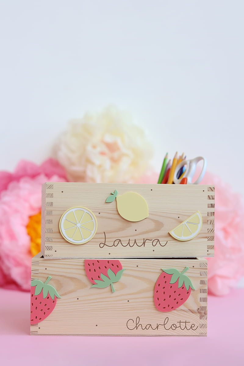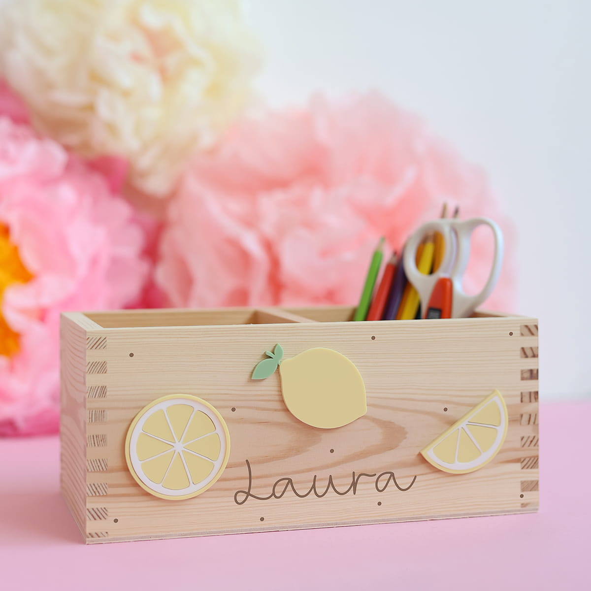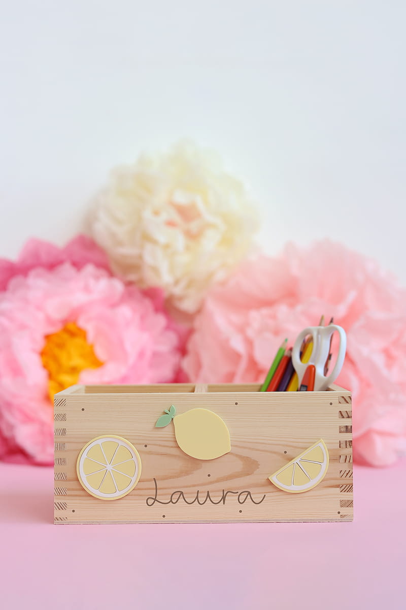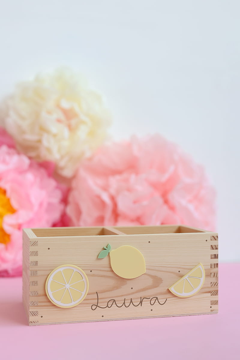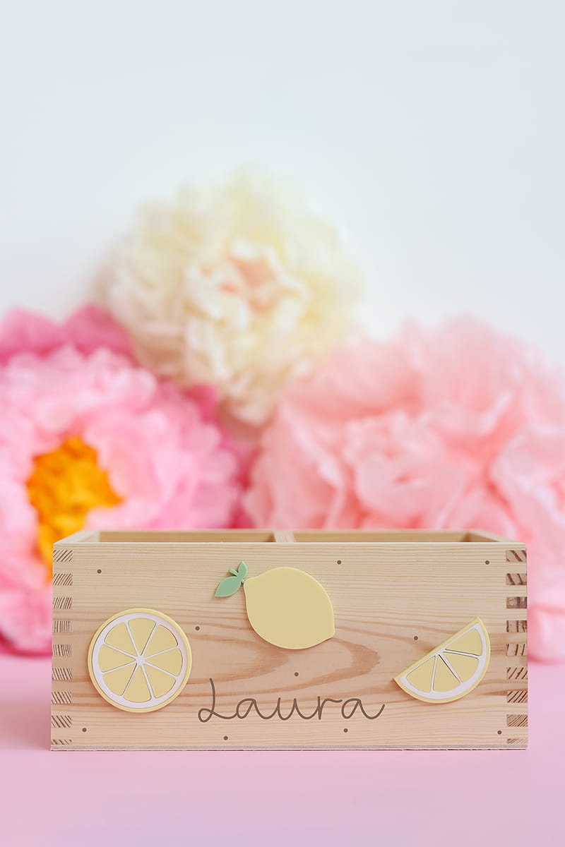 Dwukomorowe pudełko na przybory biurkowe z motywem cytrynek i dowolnym imieniem.