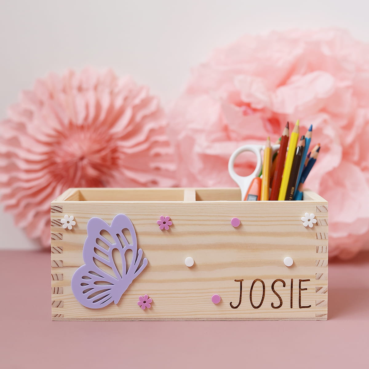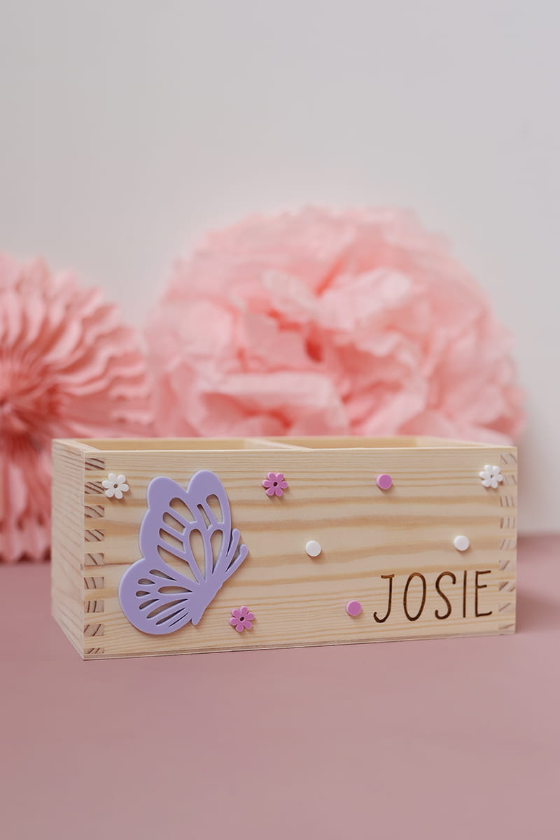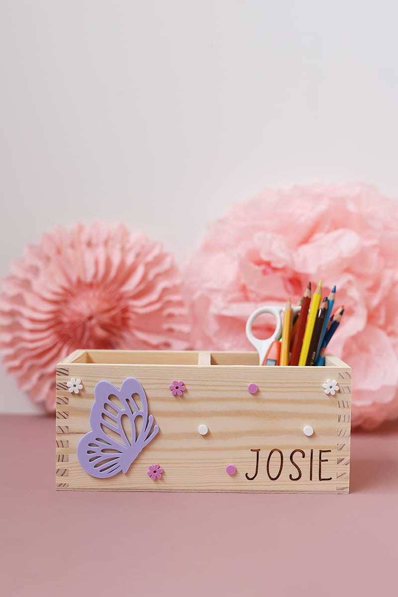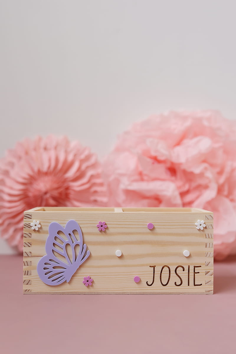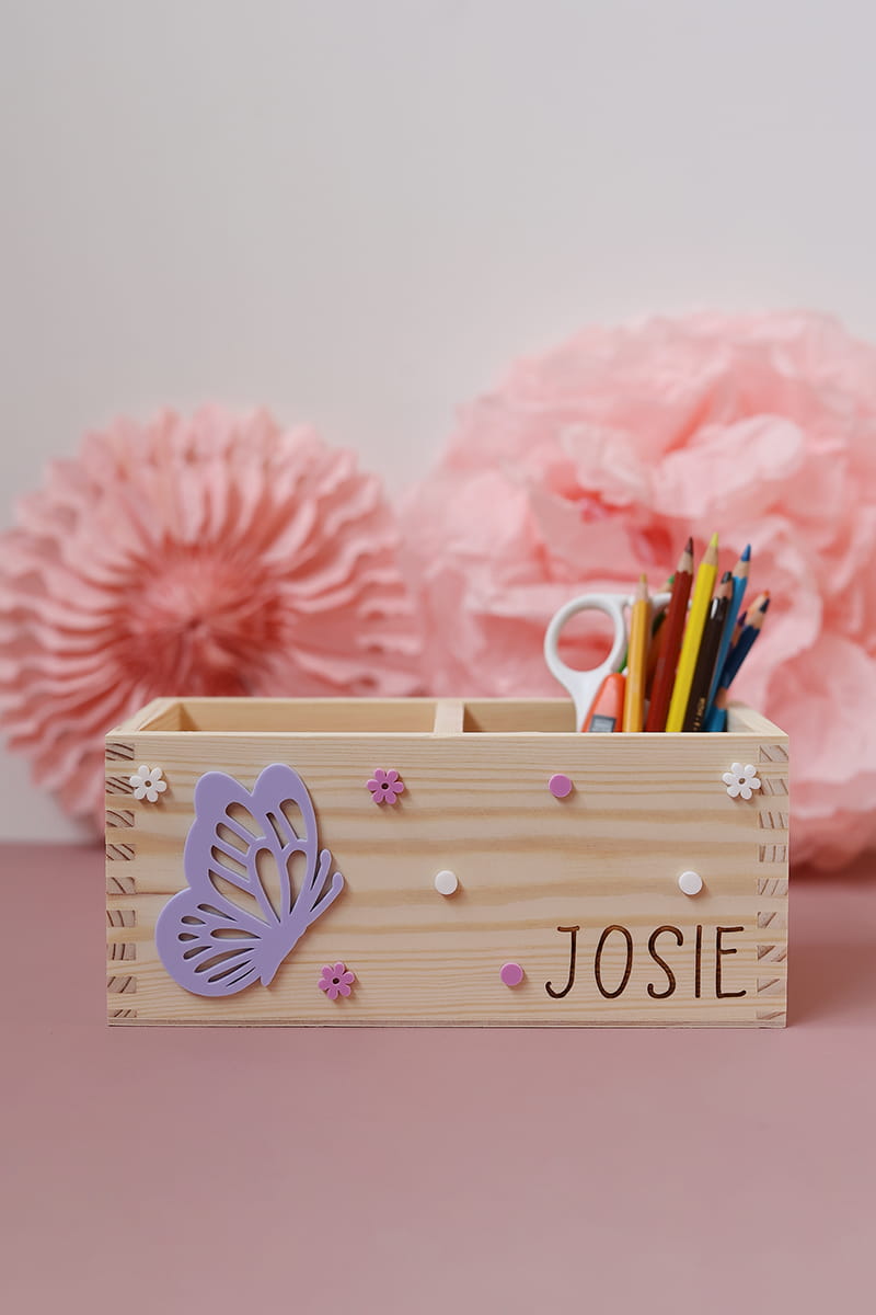 Dwukomorowe pudełko na przybory biurkowe z motywem fioletowego motylka i dowolnym imieniem.