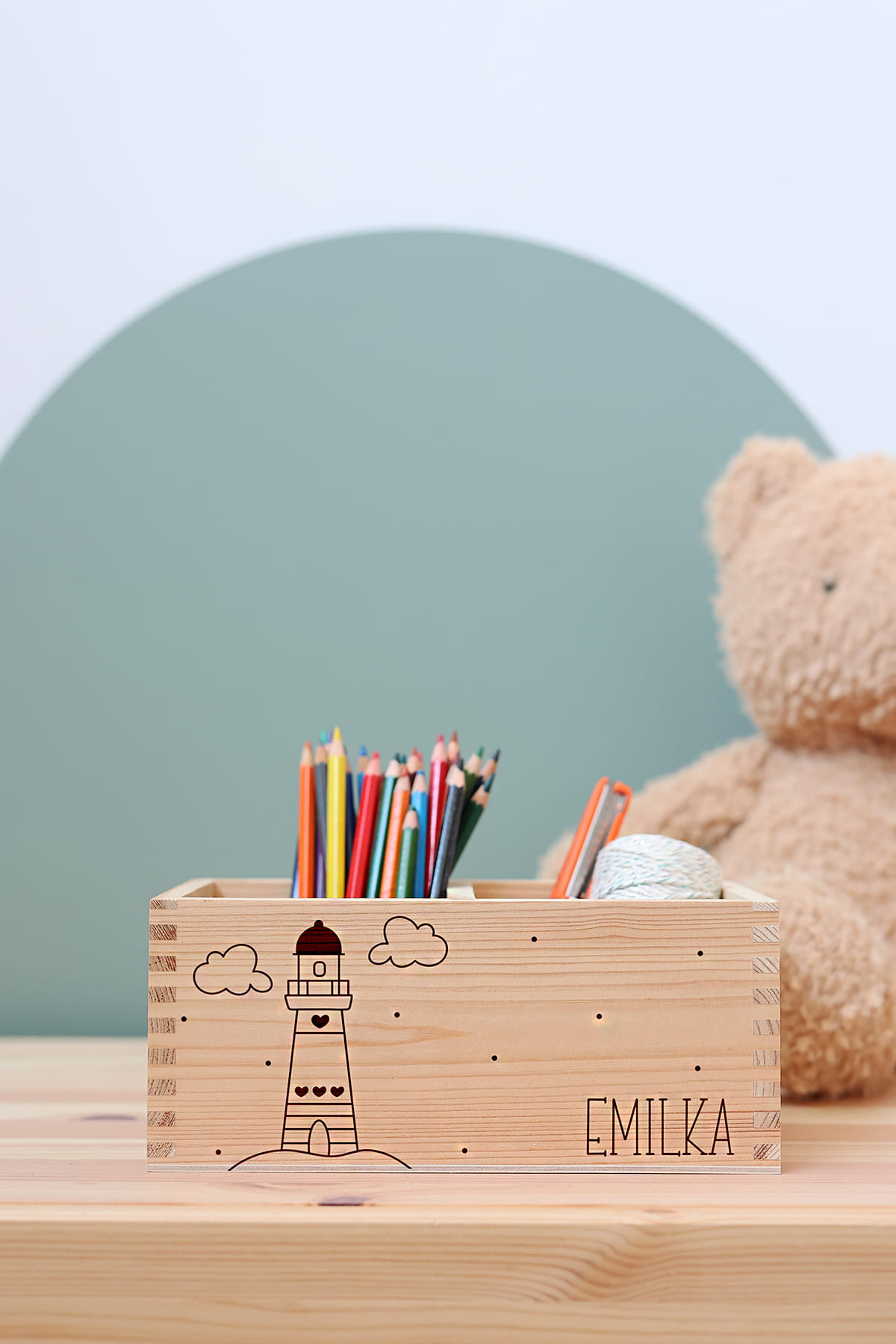 Dwukomorowe pudełko na przybory biurkowe z motywem latarni morskiej i dowolnym imieniem.