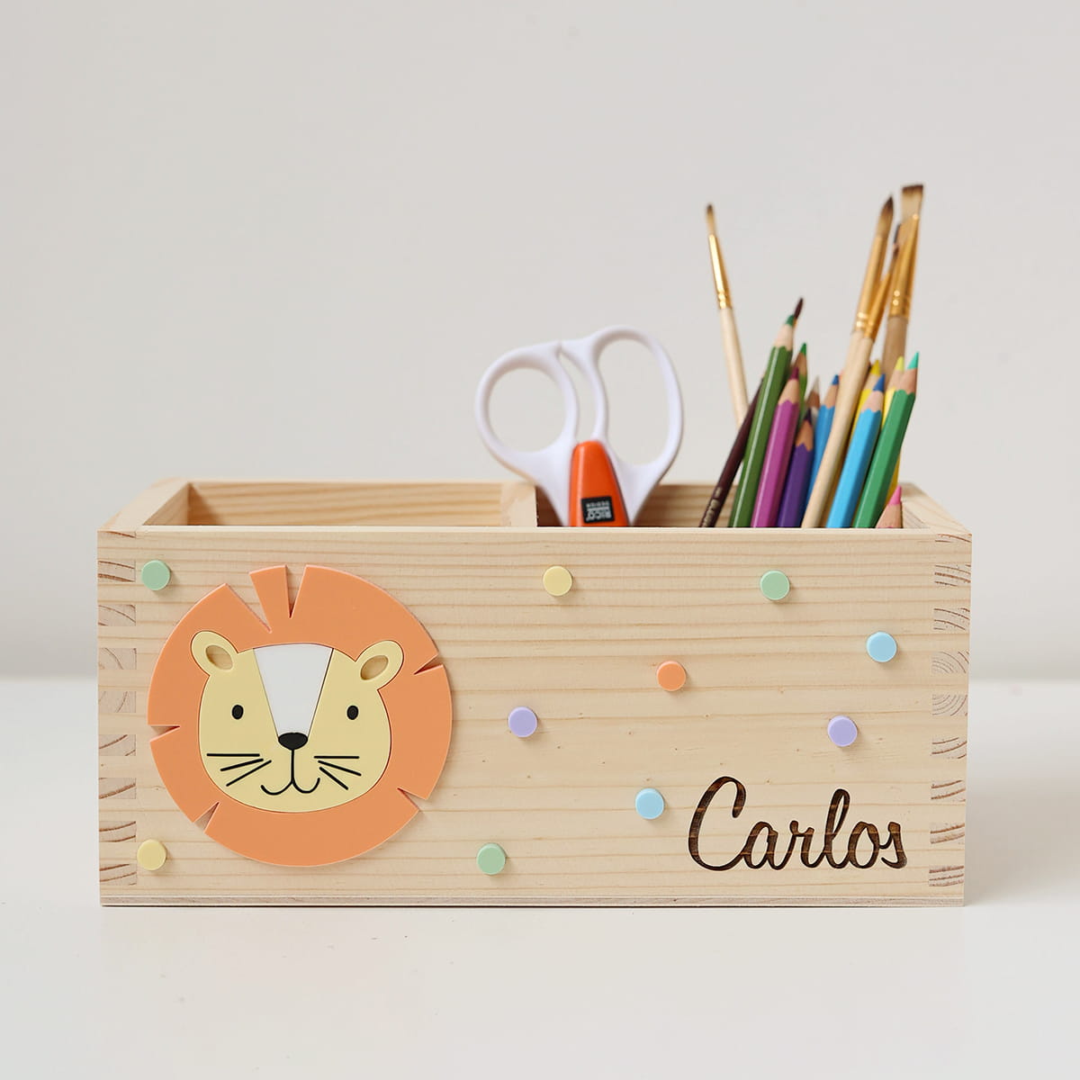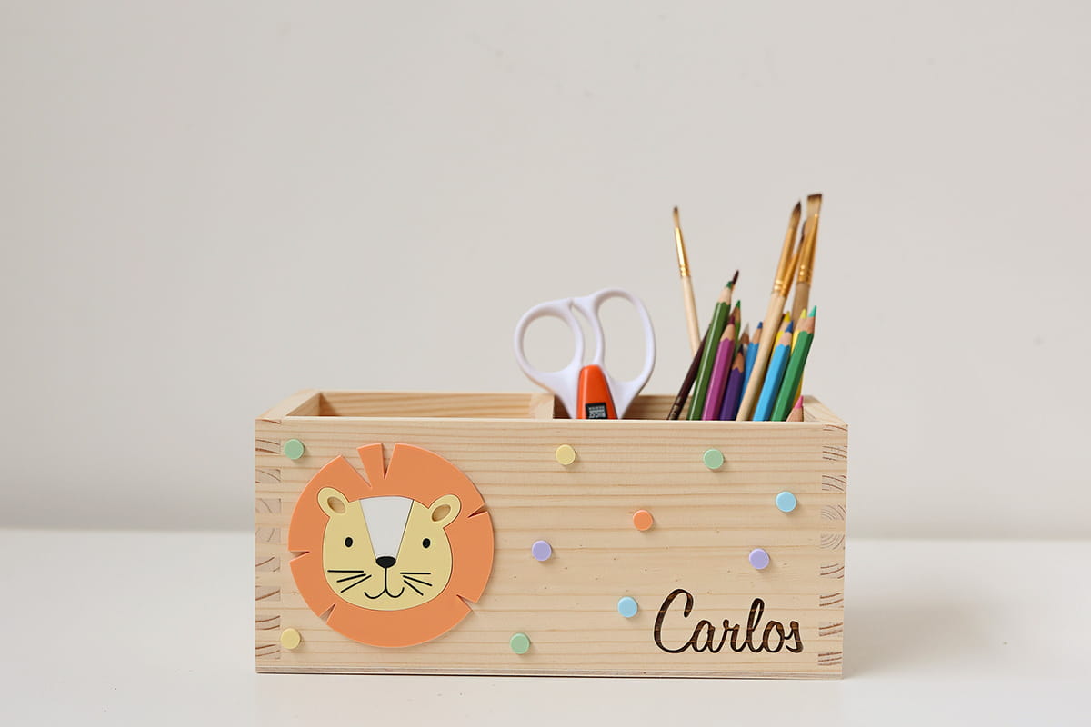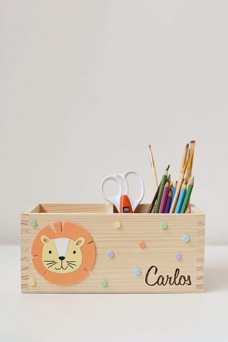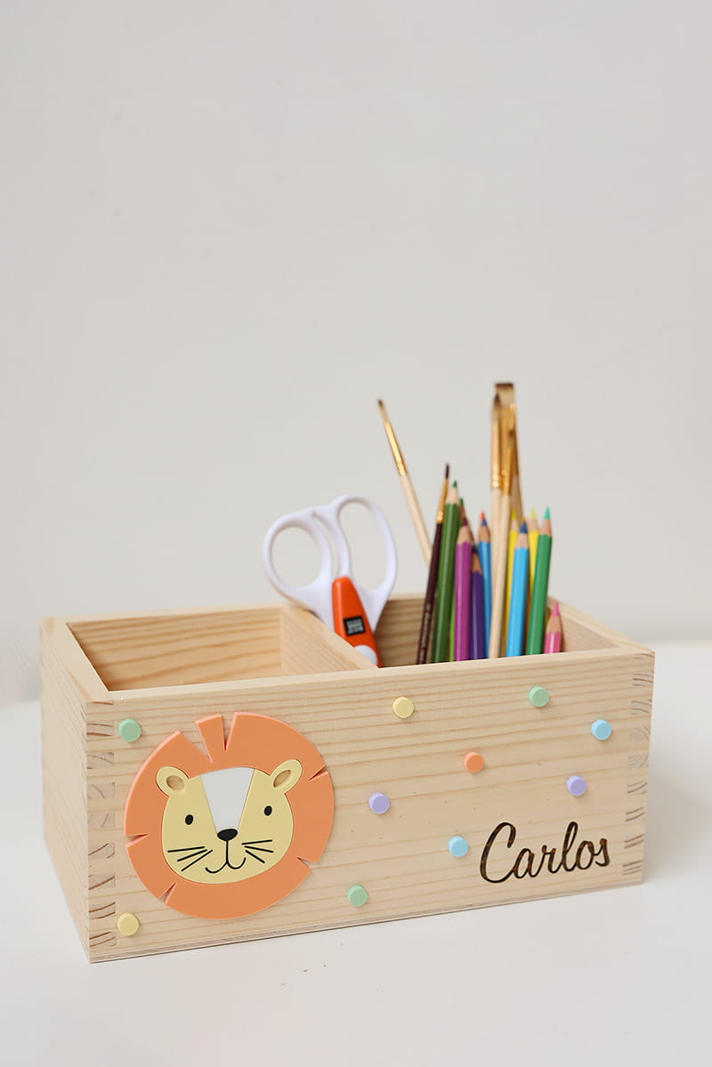 Dwukomorowe pudełko na przybory biurkowe z motywem lwa i dowolnym imieniem.