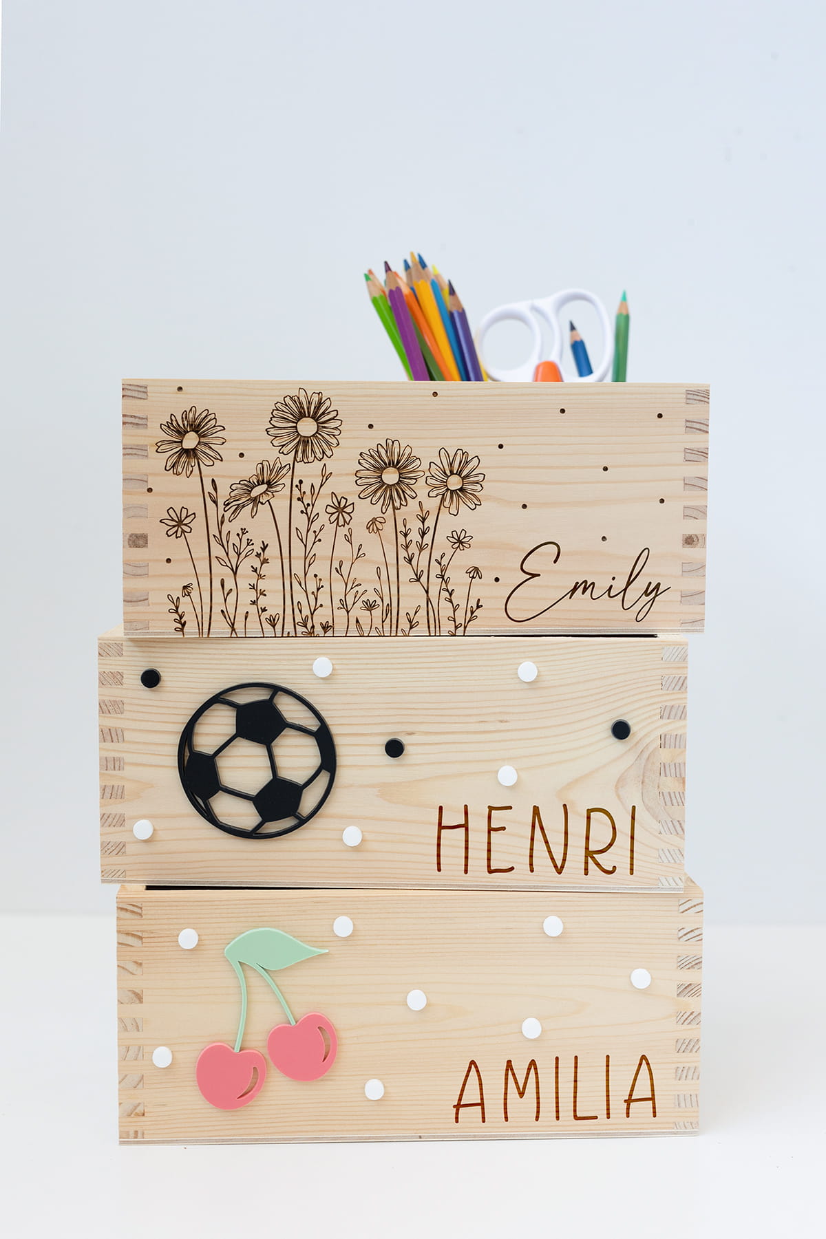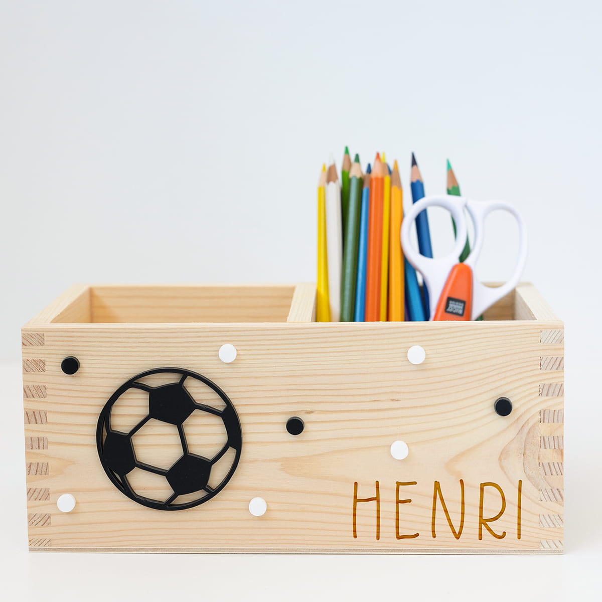Dwukomorowe pudełko na przybory biurkowe z motywem piłki nożnej i dowolnym imieniem.