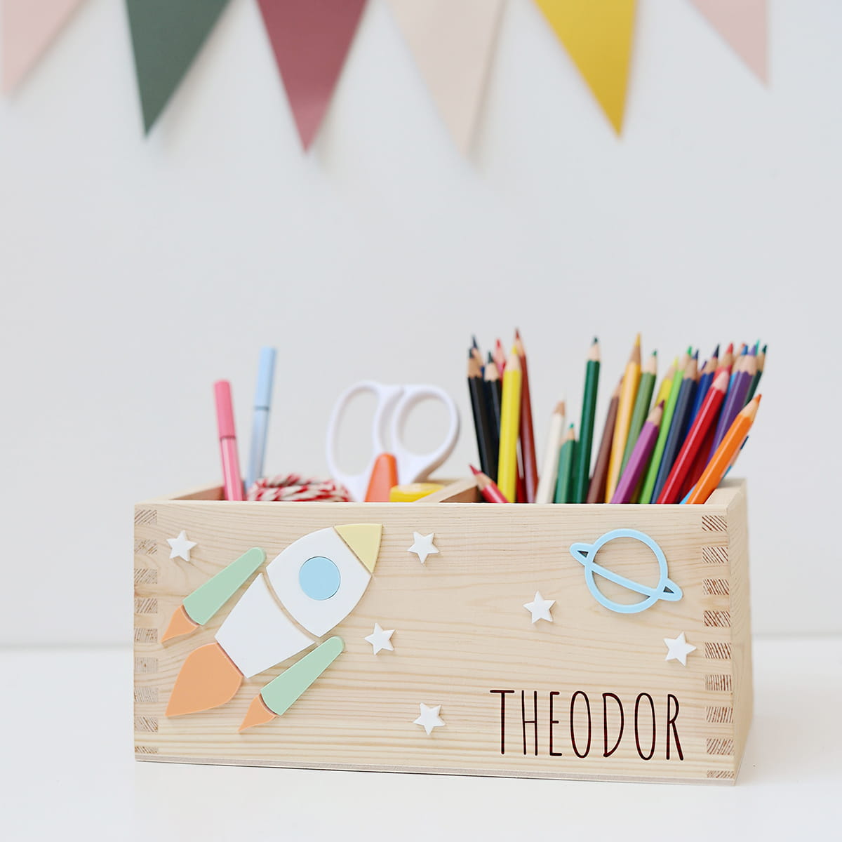 Dwukomorowe pudełko na przybory biurkowe z motywem kolorowej rakiety i dowolnym imieniem.