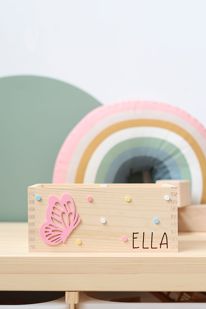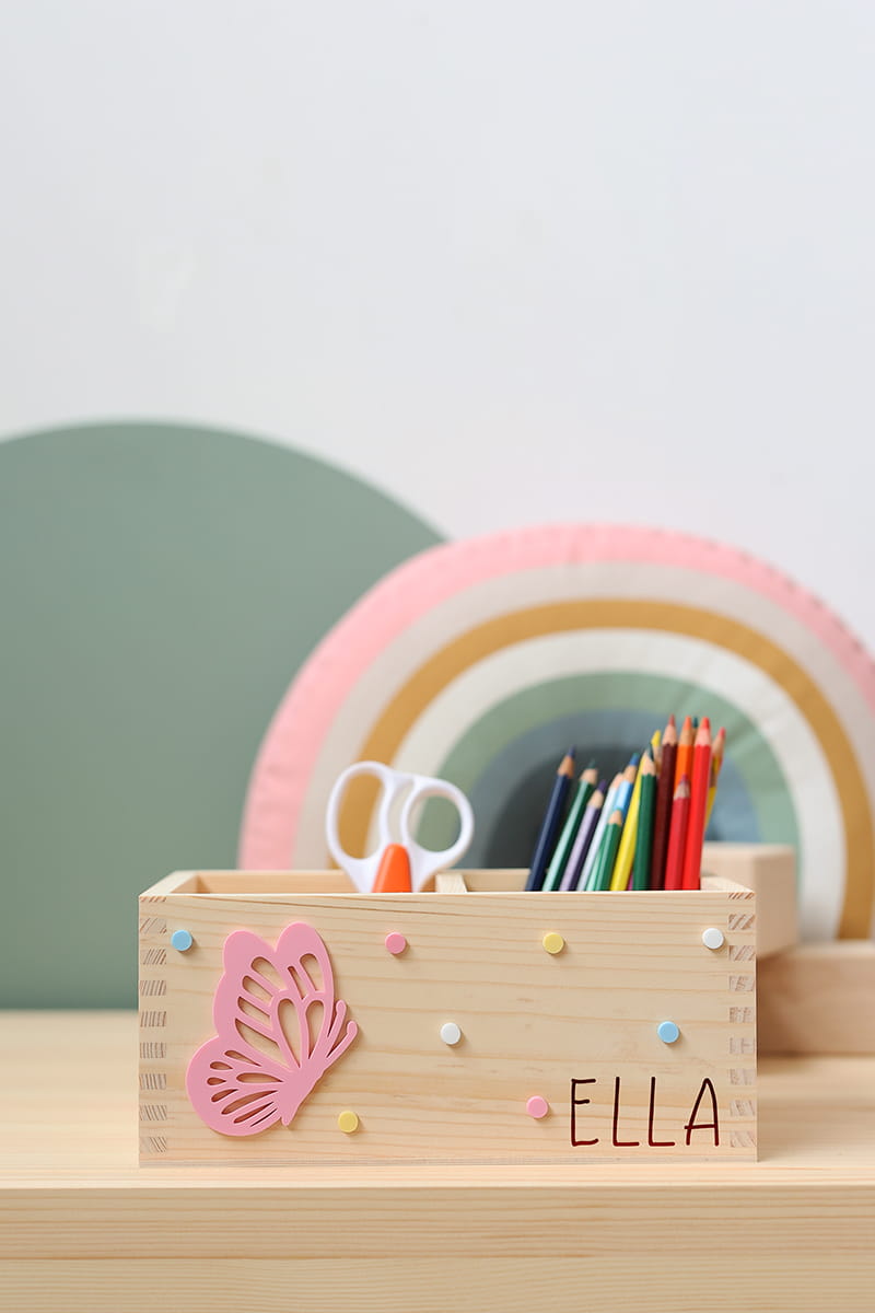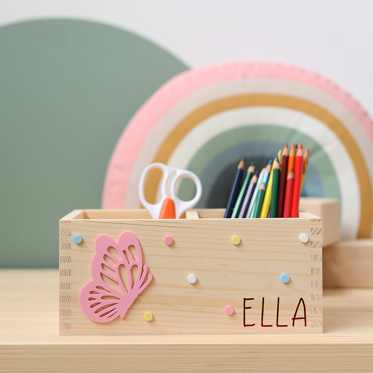 Dwukomorowe pudełko na przybory biurkowe z motywem różowego motylka i dowolnym imieniem.