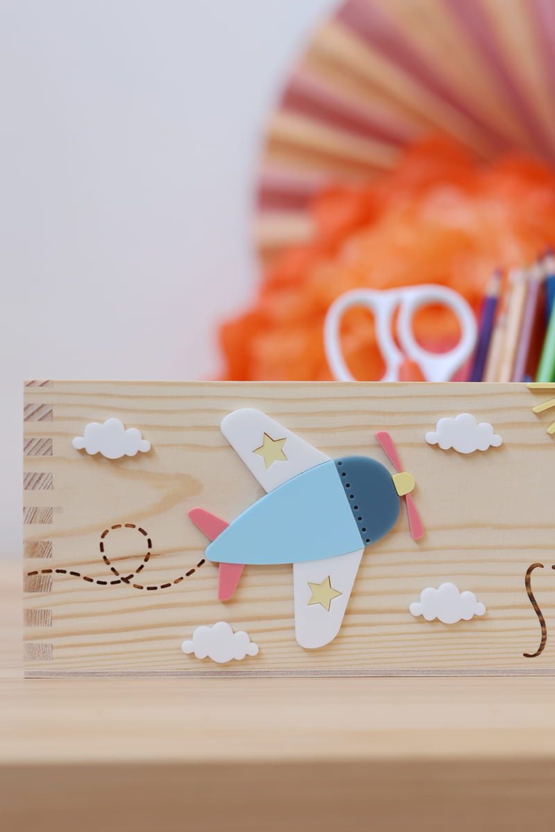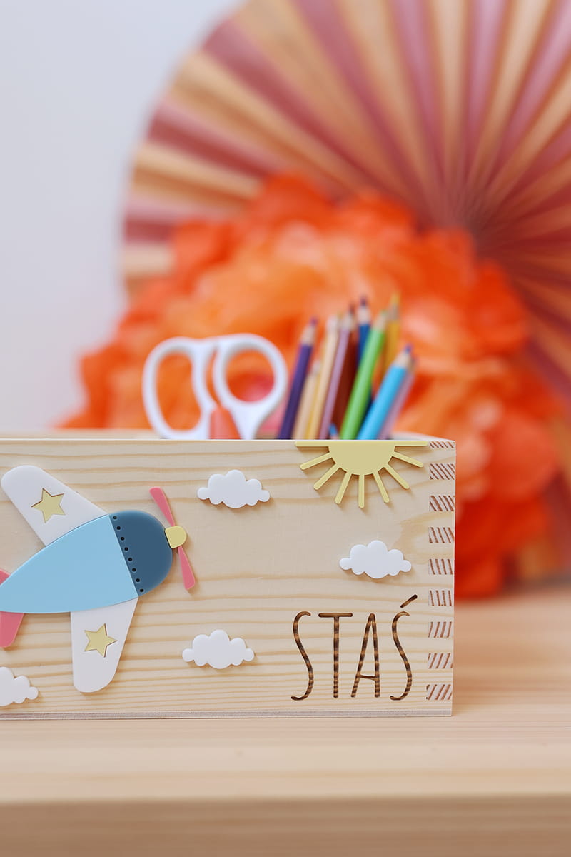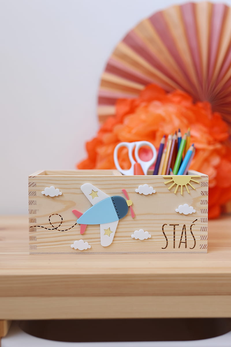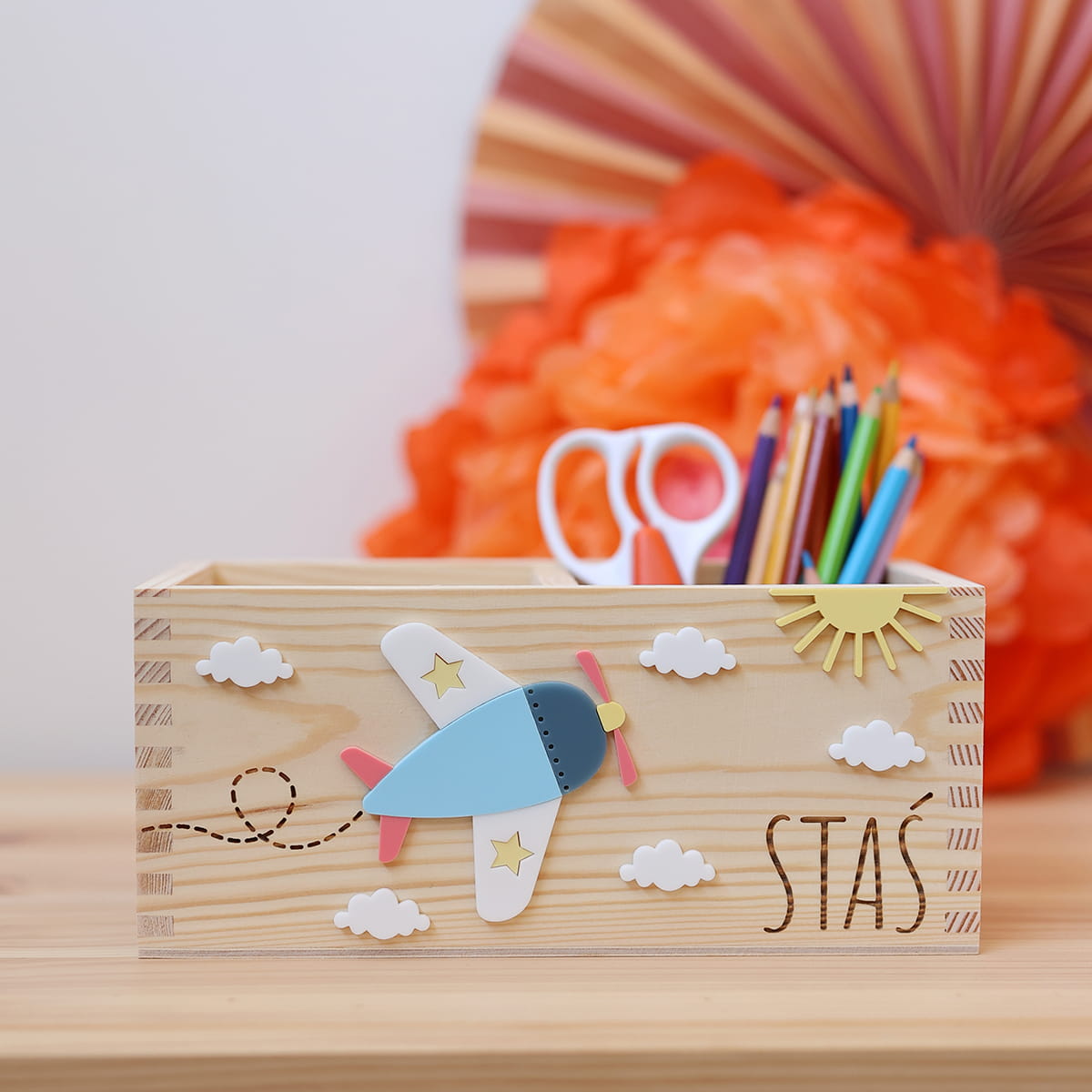 Dwukomorowe pudełko na przybory biurkowe z motywem samolotu i dowolnym imieniem.