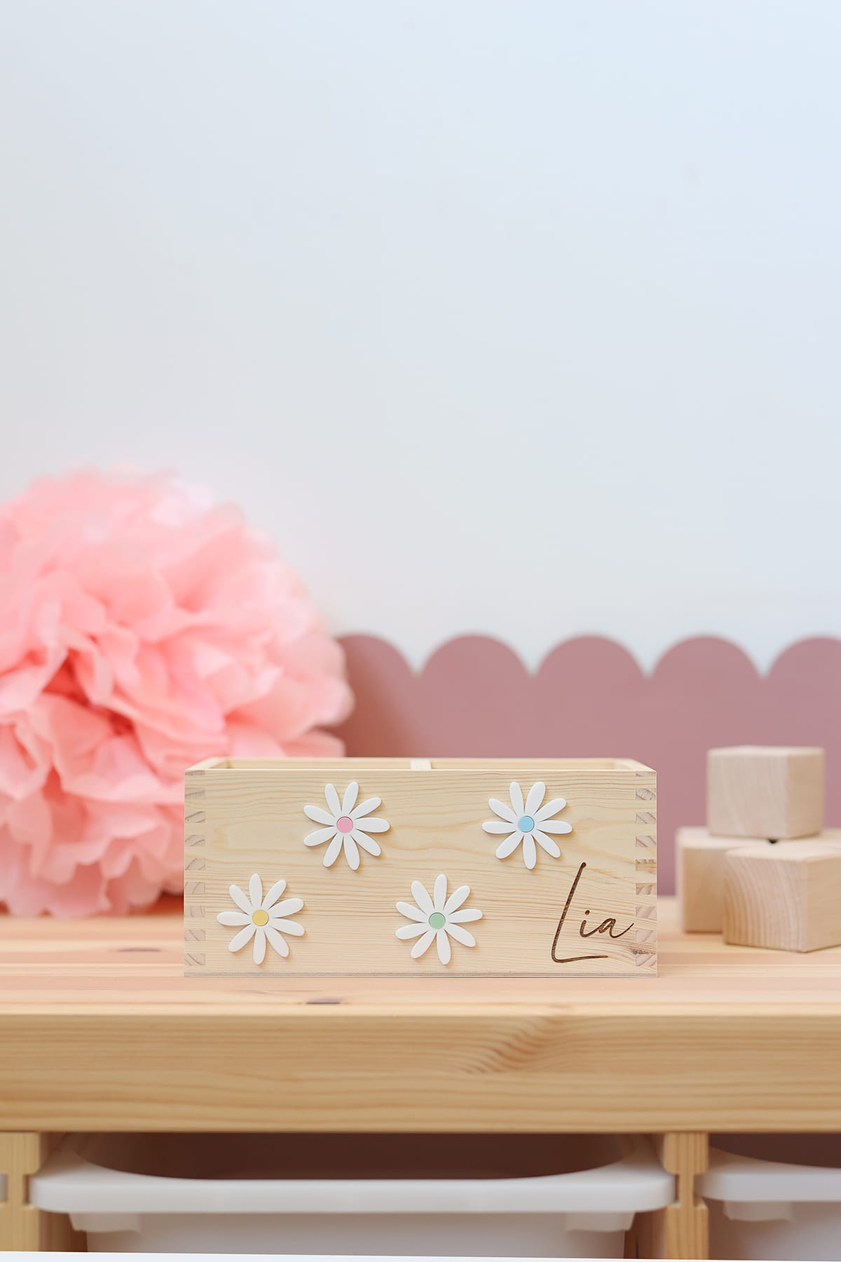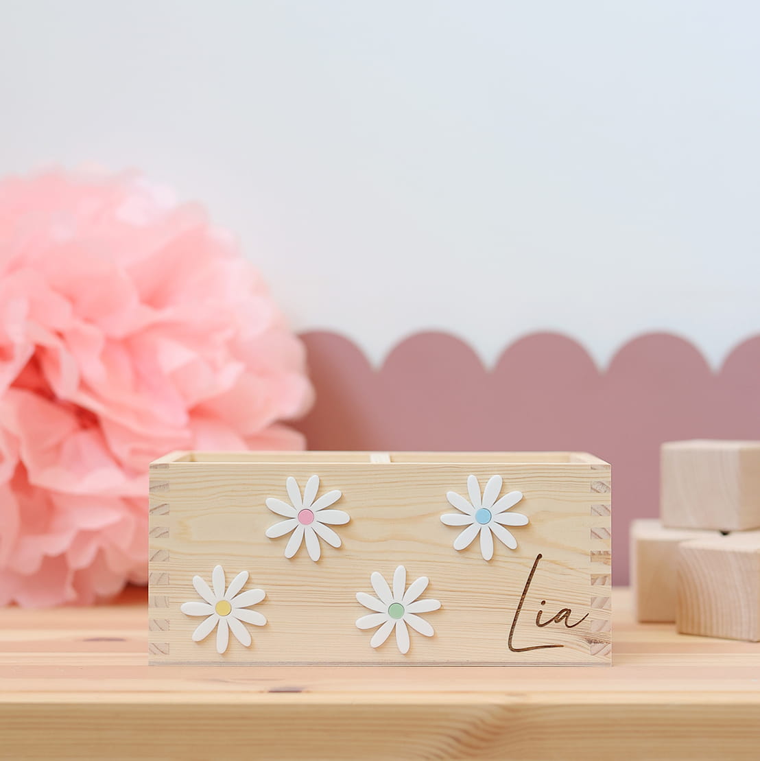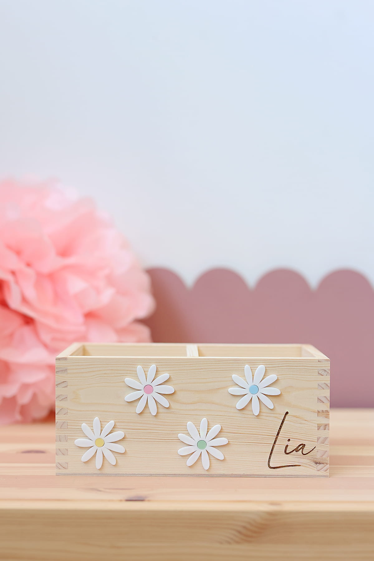 Dwukomorowe pudełko na przybory biurkowe z motywem stokrotek i dowolnym imieniem.