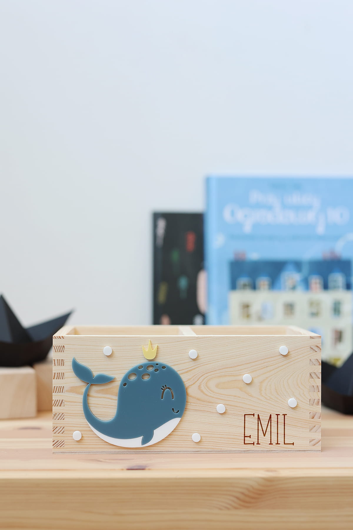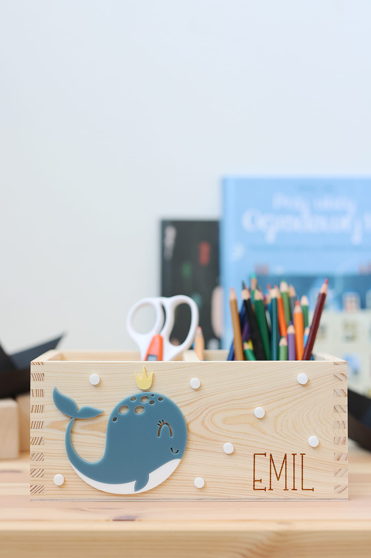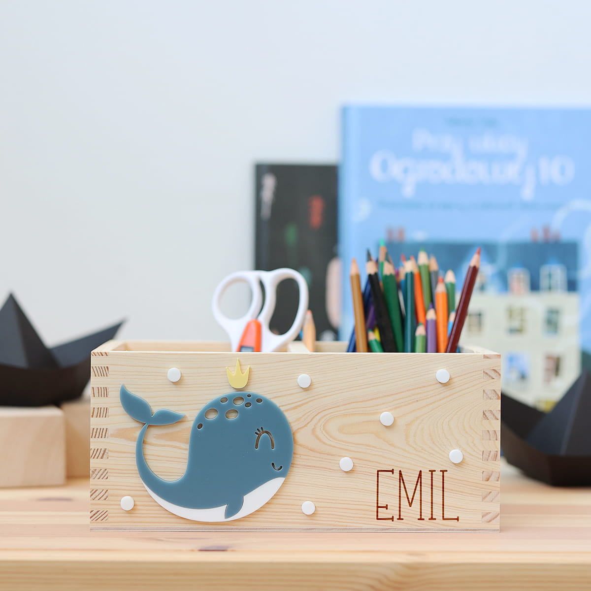 Dwukomorowe pudełko na przybory biurkowe z motywem wieloryba i dowolnym imieniem.