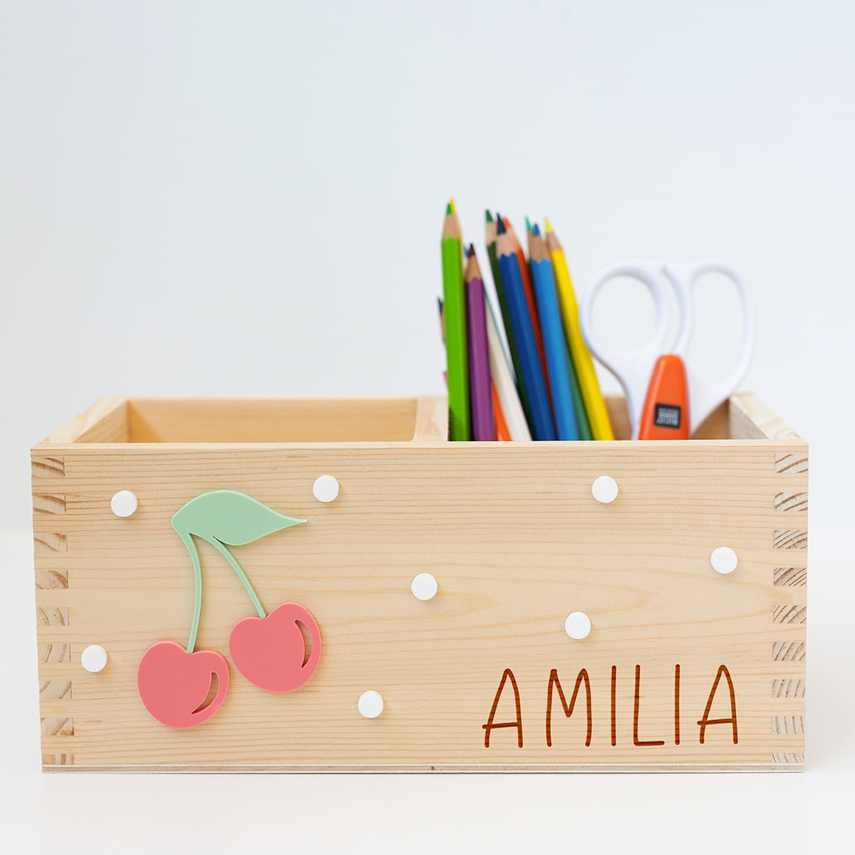 Dwukomorowe pudełko na przybory biurkowe z motywem wisienki i dowolnym imieniem.