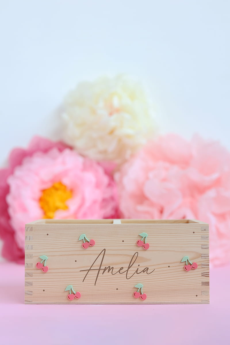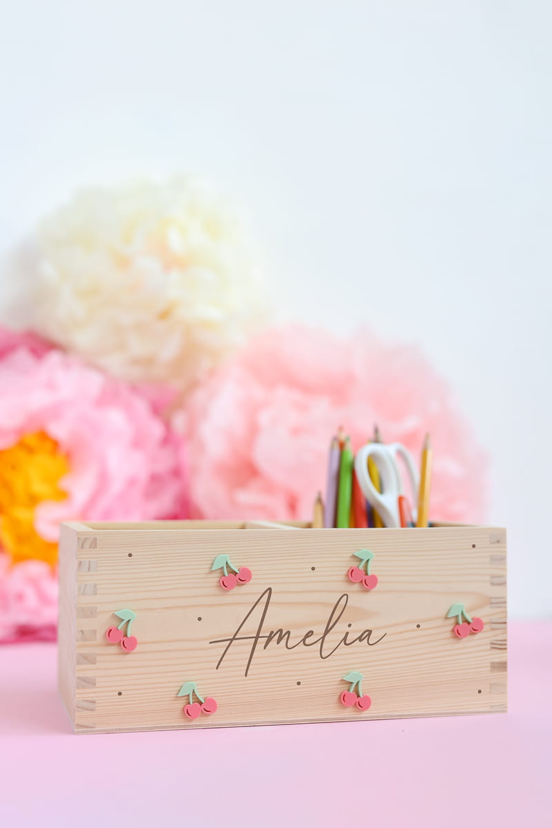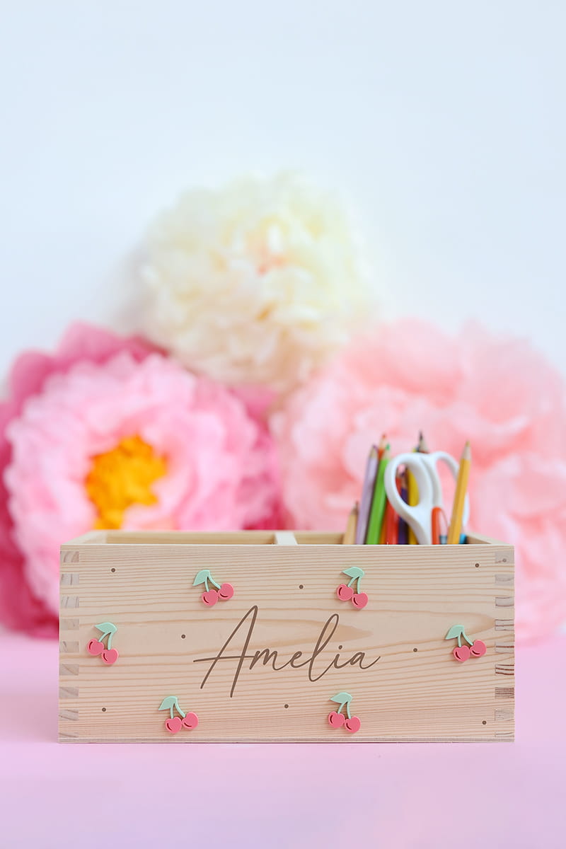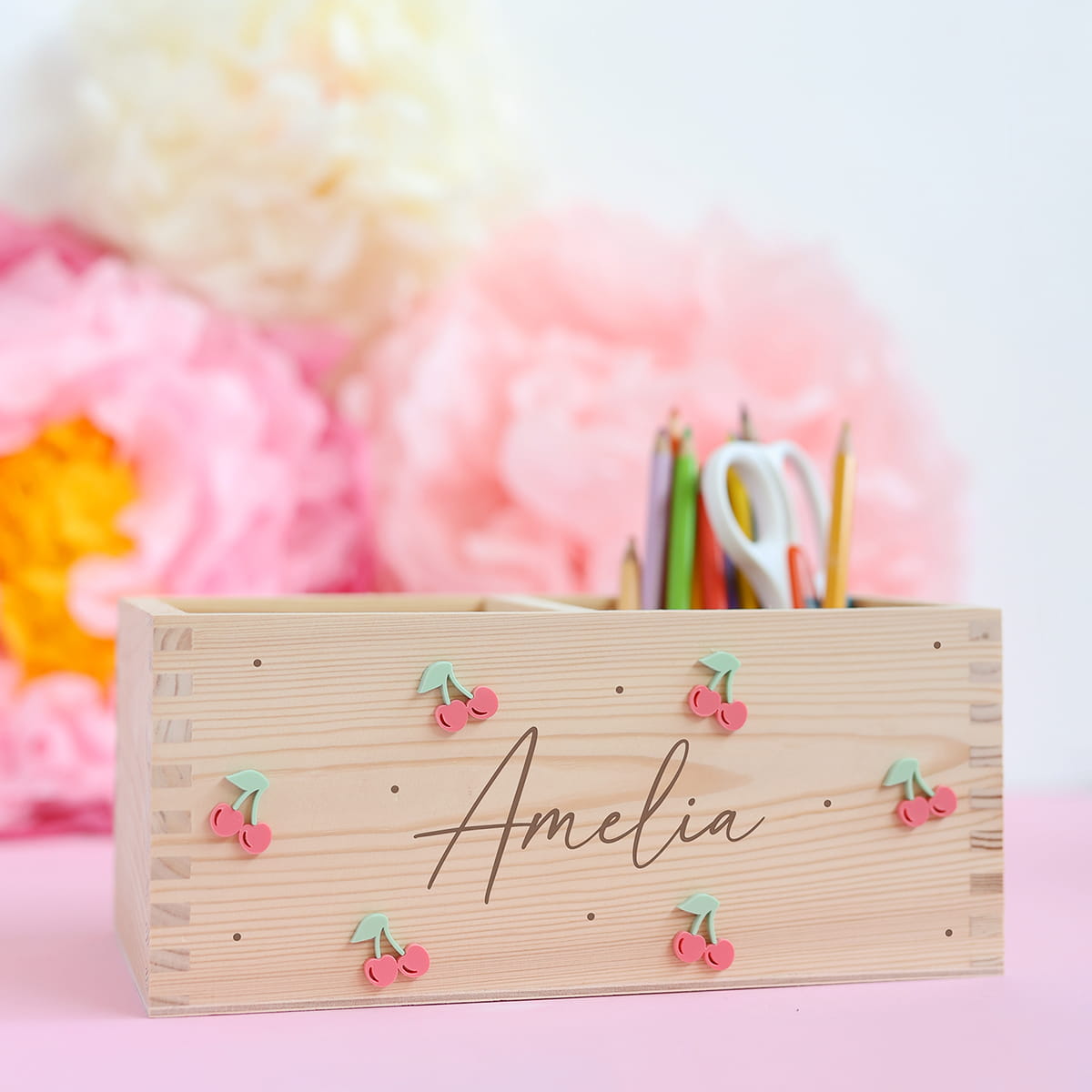 Dwukomorowe pudełko na przybory biurkowe z motywem małych wisienek i dowolnym imieniem.