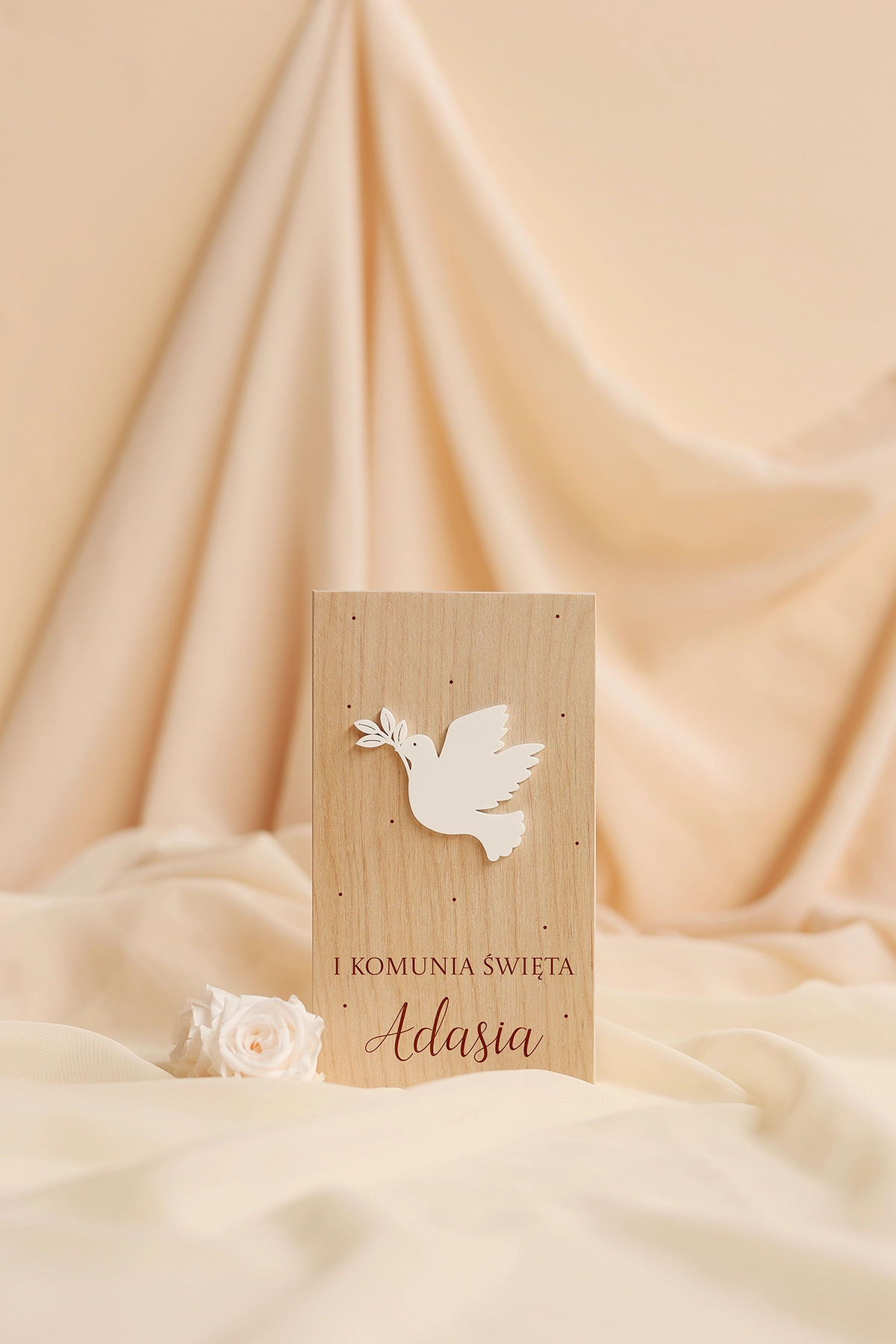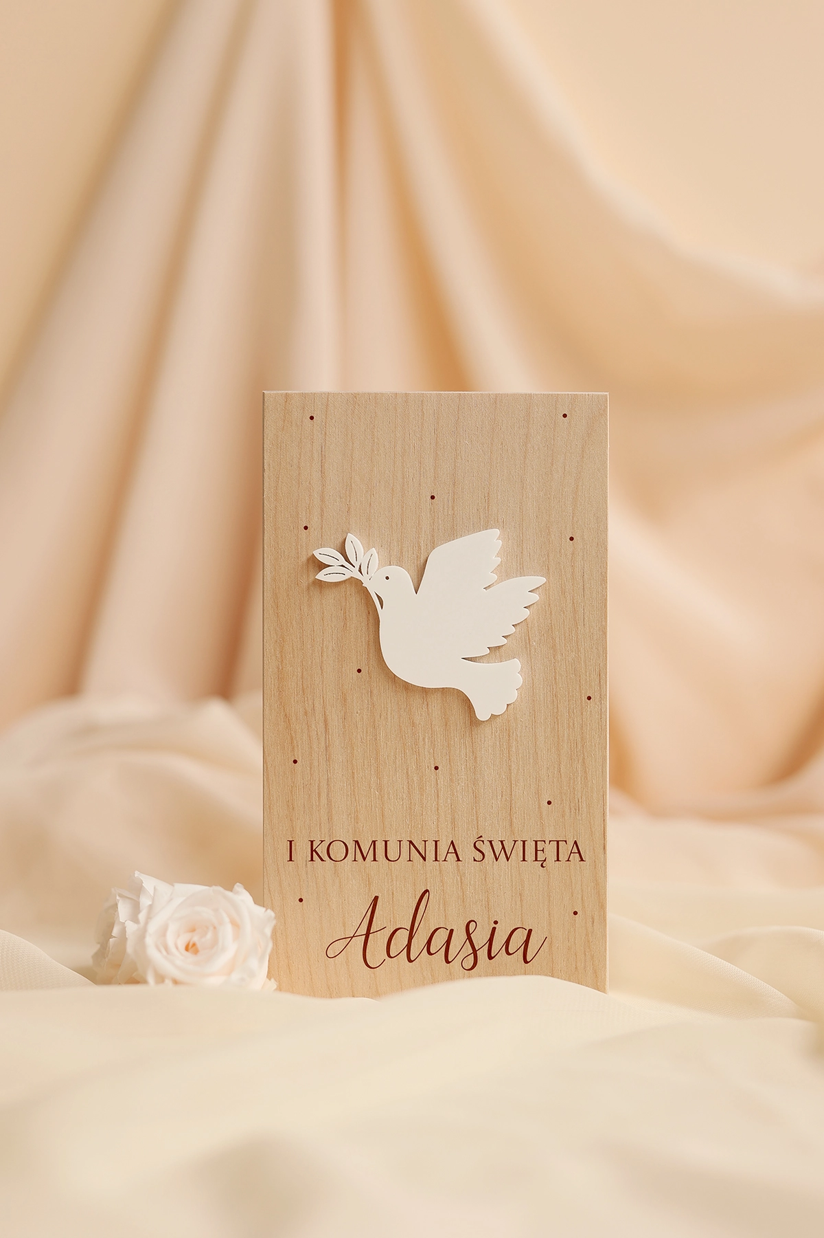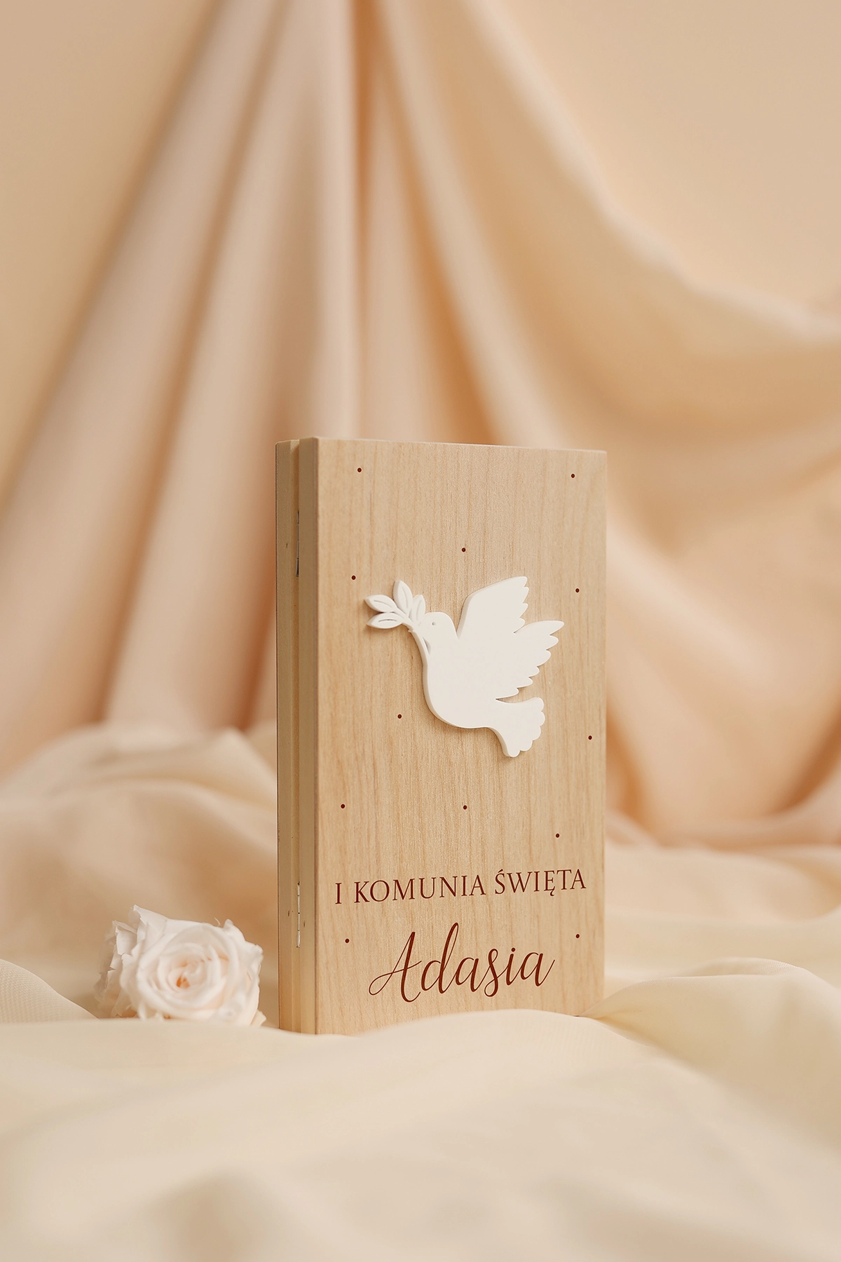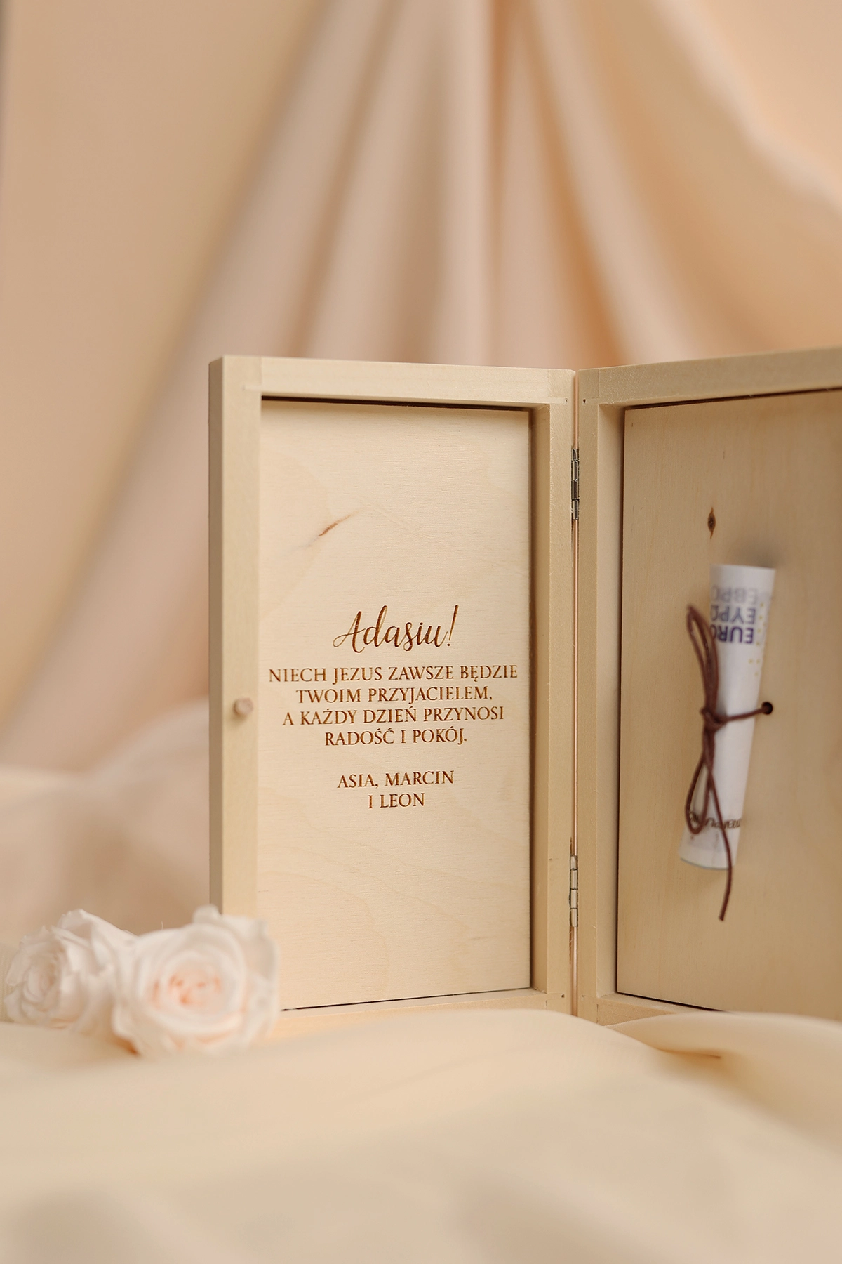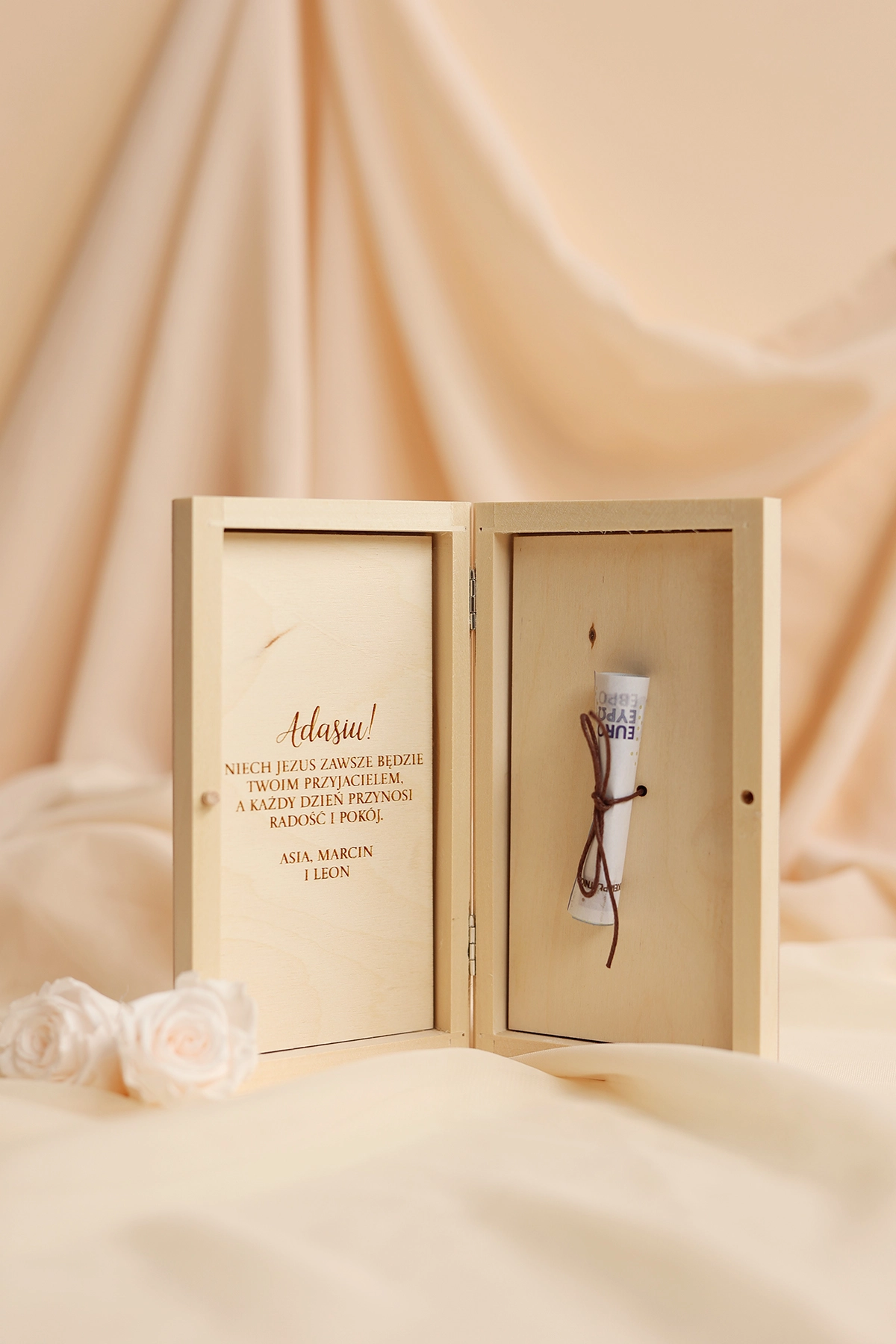 Wyjątkowe i oryginalne pudełko na pieniądze - idealne do wręczenia na Komunię. Na wieczku może znajdować się dowolny tekst, a w środku wybrane życzenia oraz miejsce na przywiązanie banknotów.