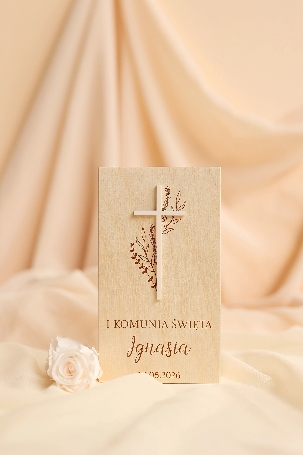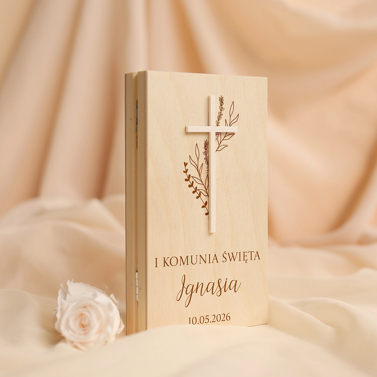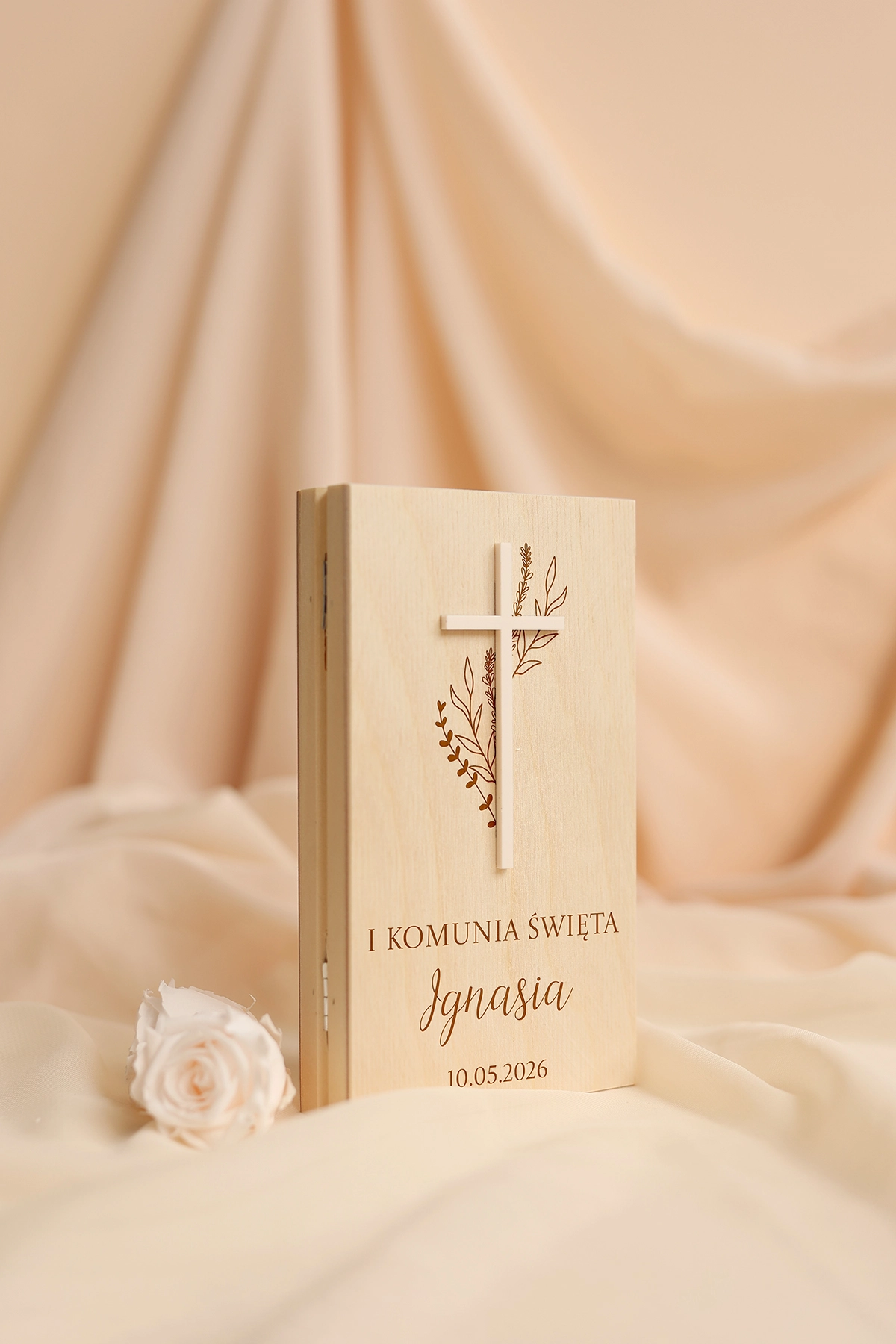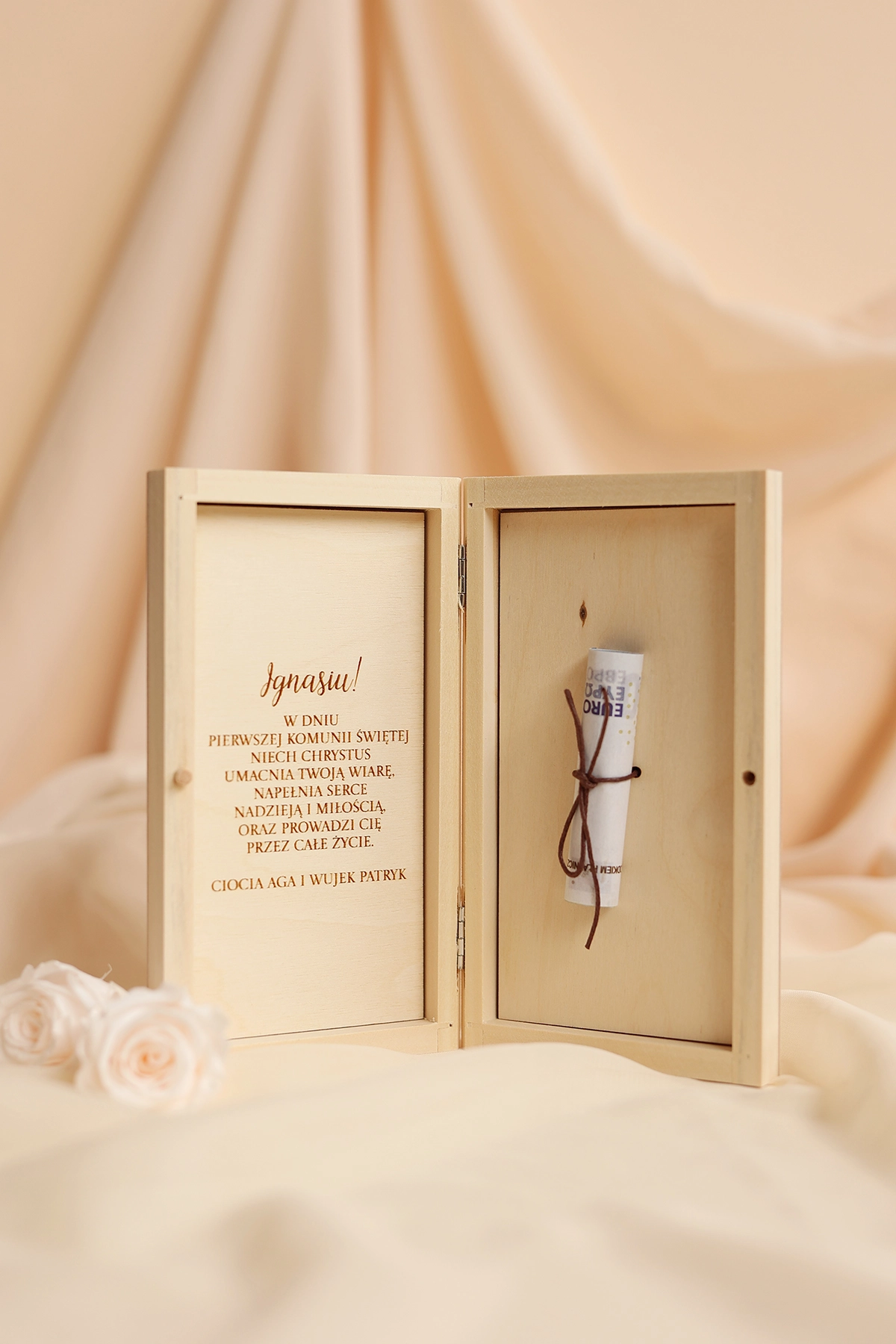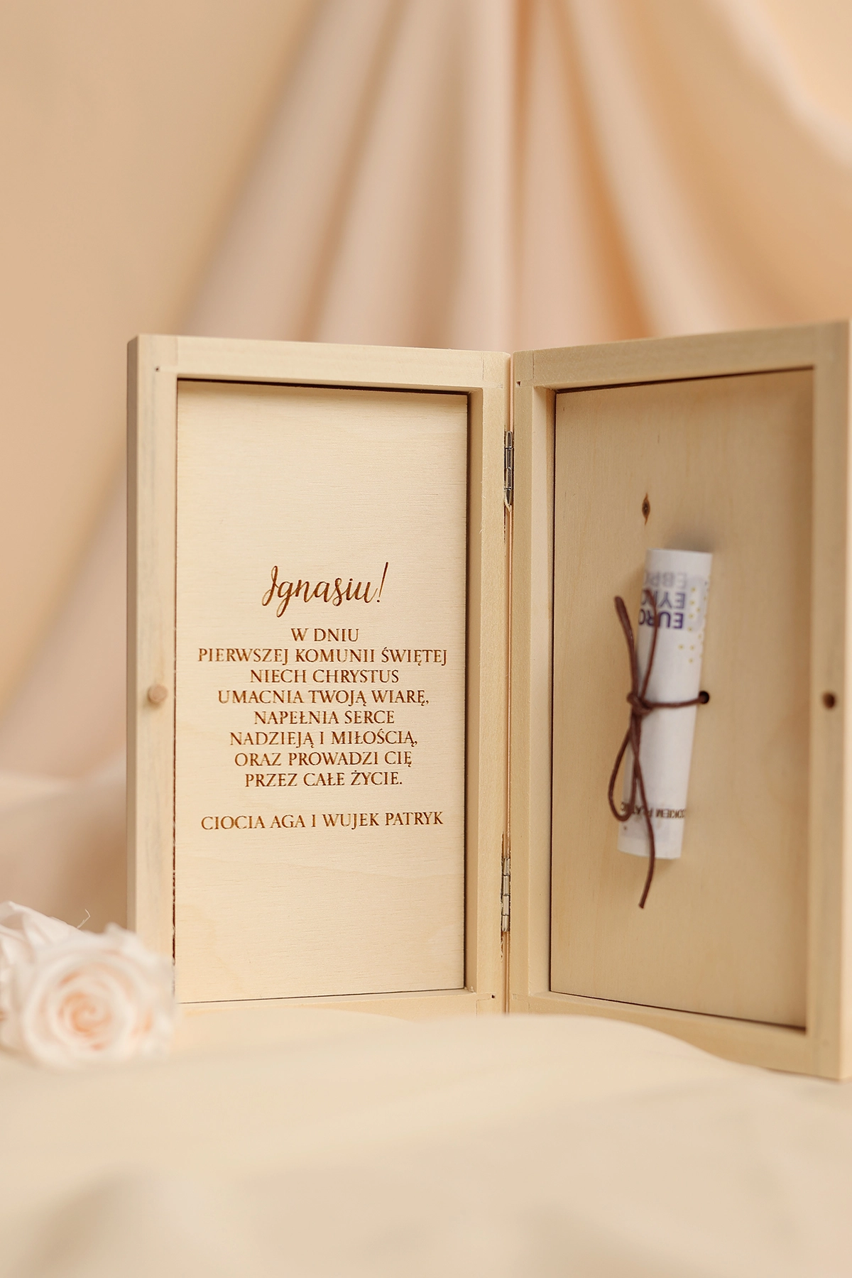 Wyjątkowe i oryginalne pudełko na pieniądze - idealne do wręczenia na Komunię. Na wieczku może znajdować się dowolny tekst, a w środku wybrane życzenia oraz miejsce na przywiązanie banknotów.