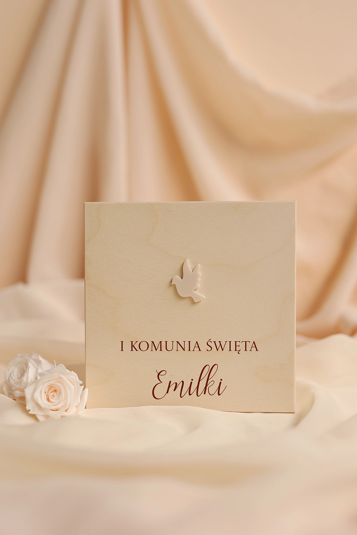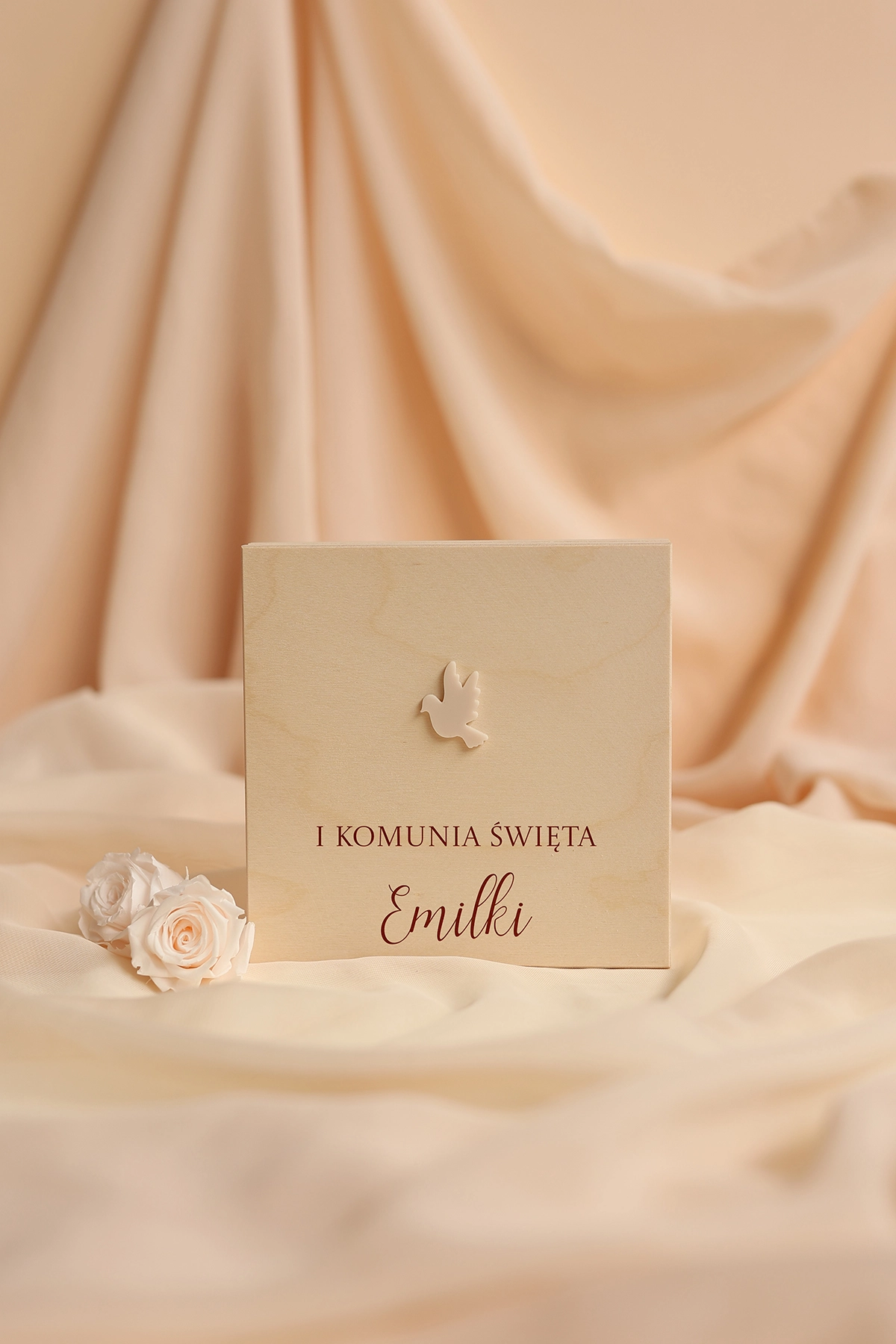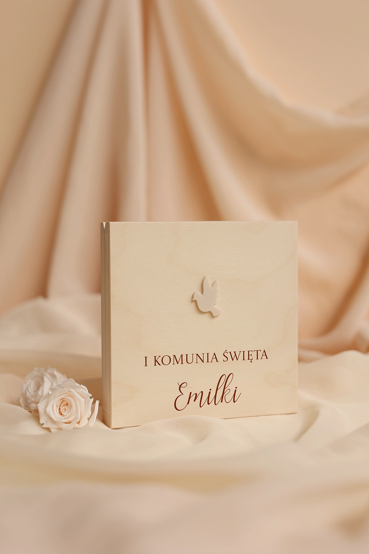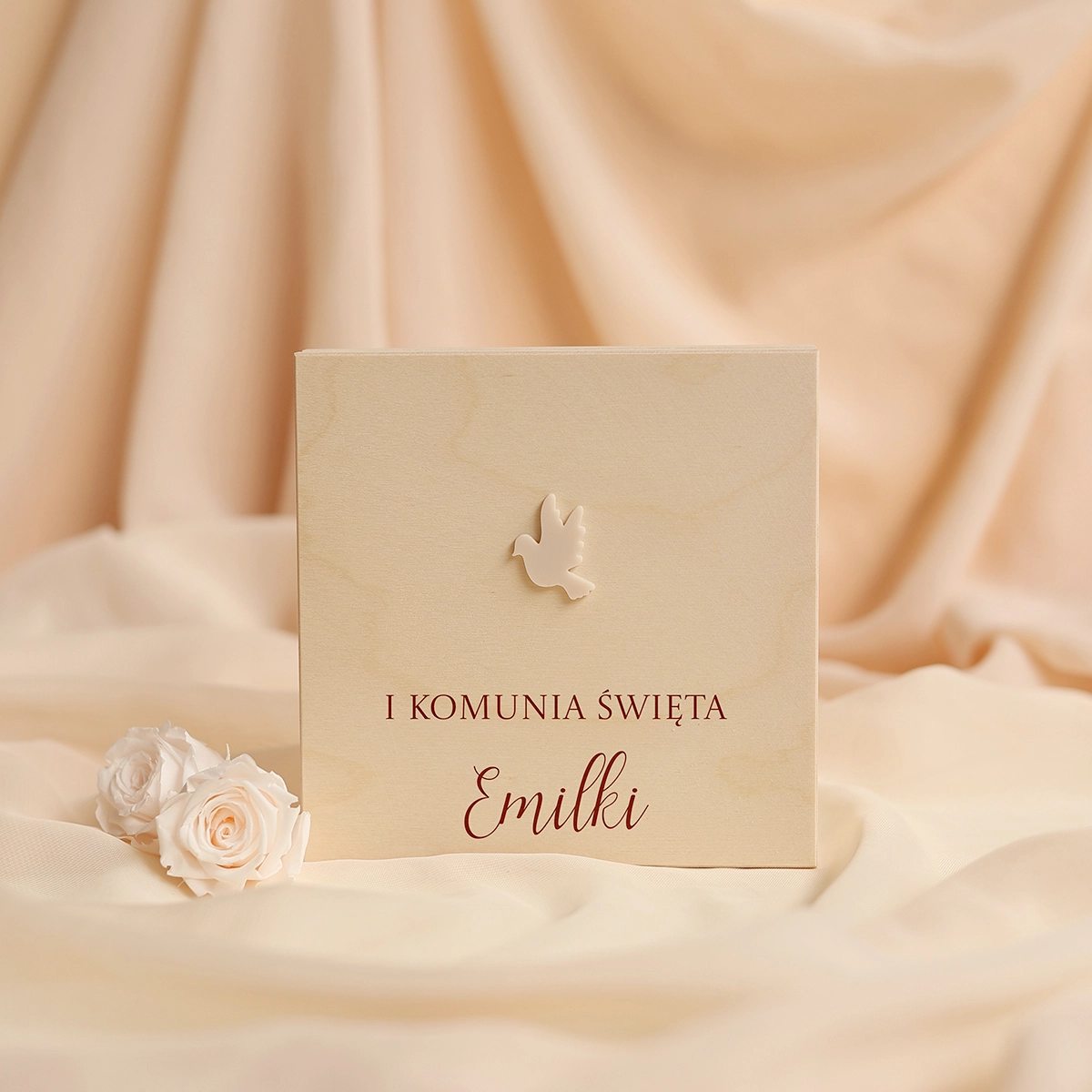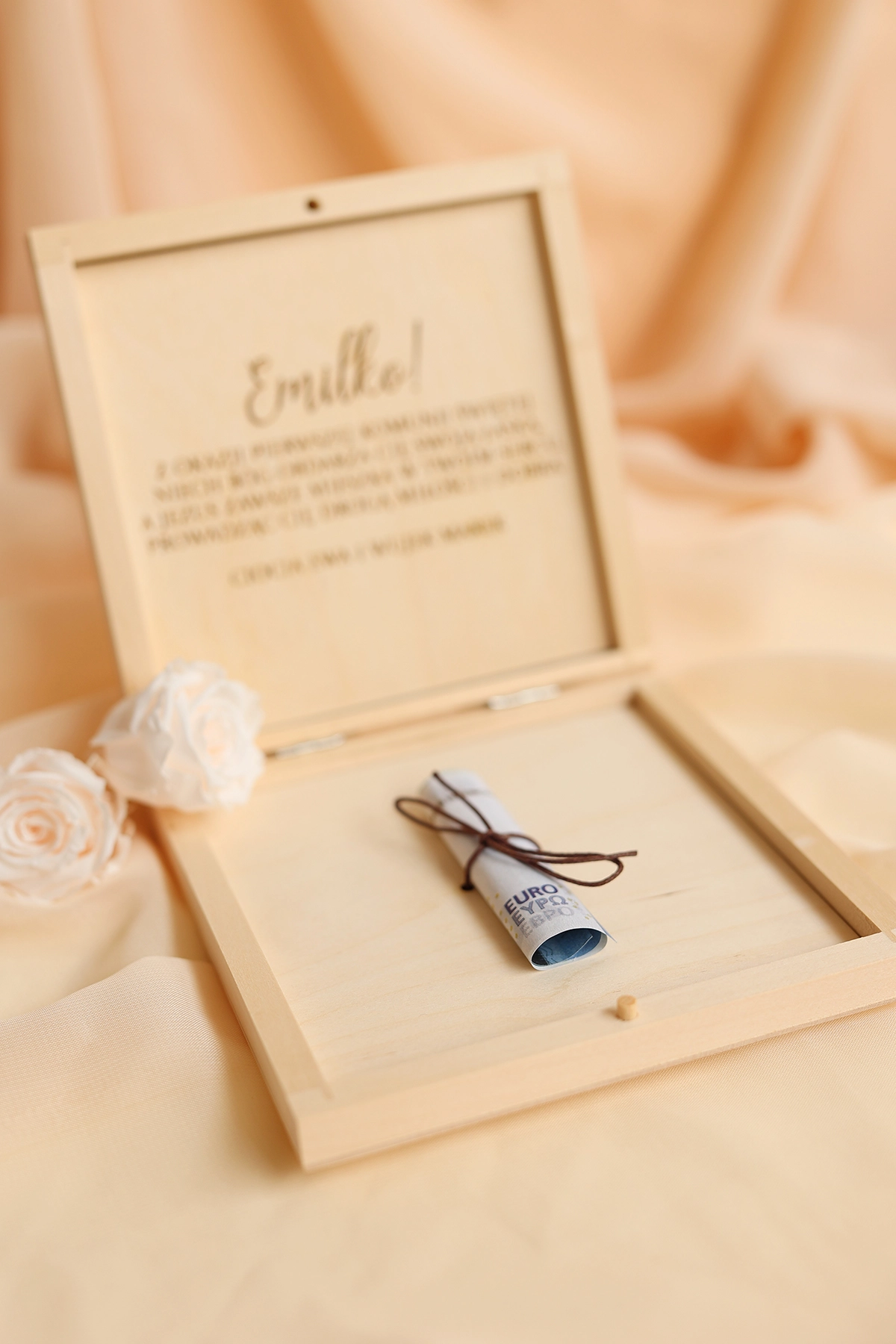 Wyjątkowe i oryginalne pudełko na pieniądze - idealne do wręczenia na Komunię. Na wieczku może znajdować się dowolny tekst, a w środku wybrane życzenia oraz miejsce na przywiązanie banknotów.