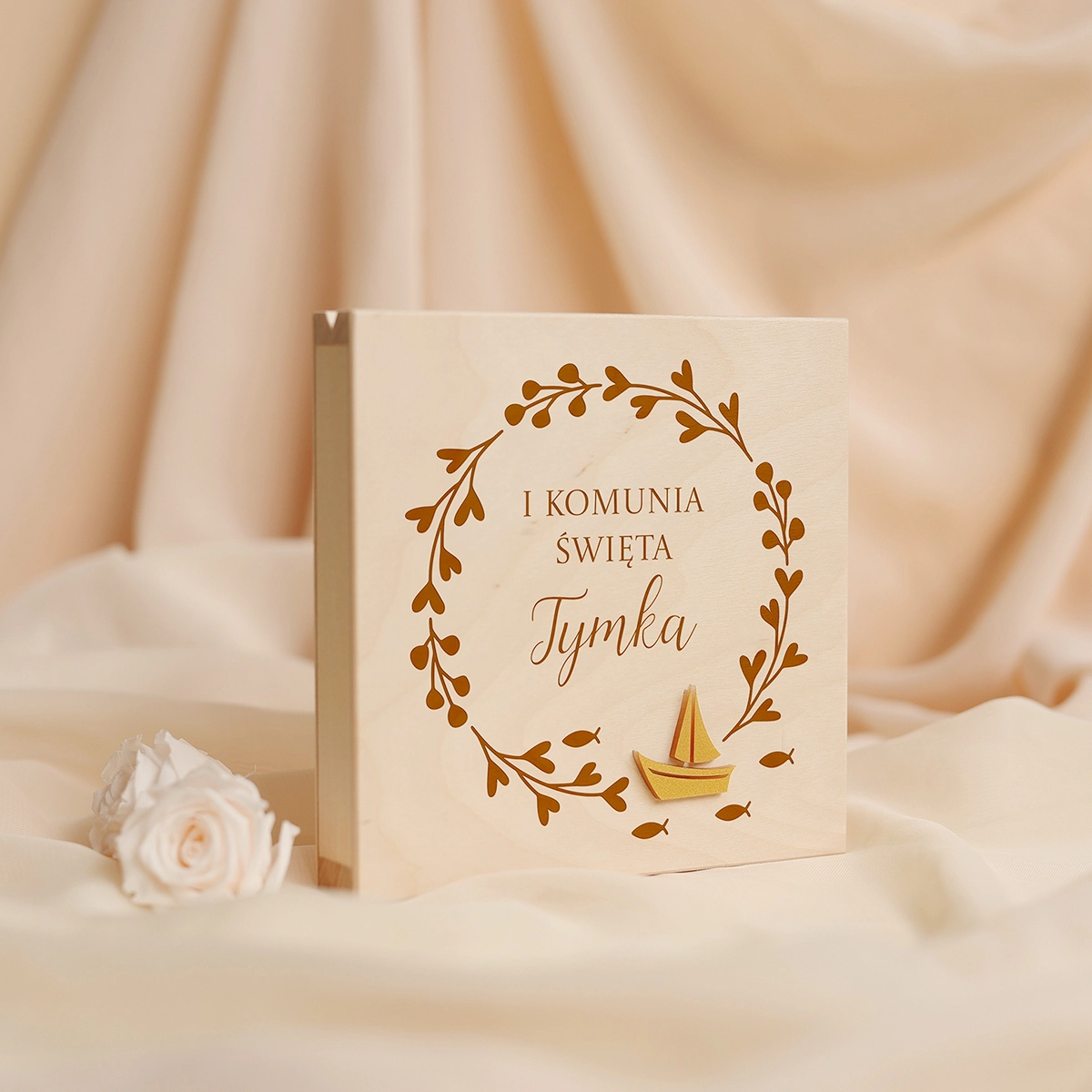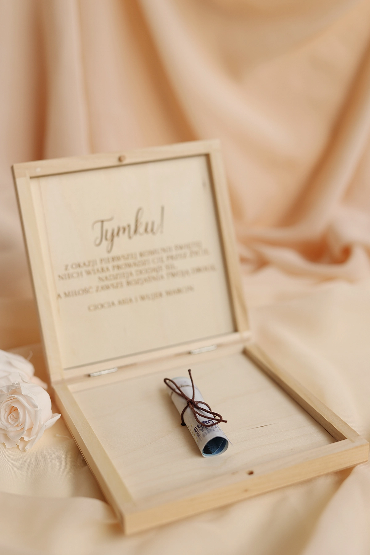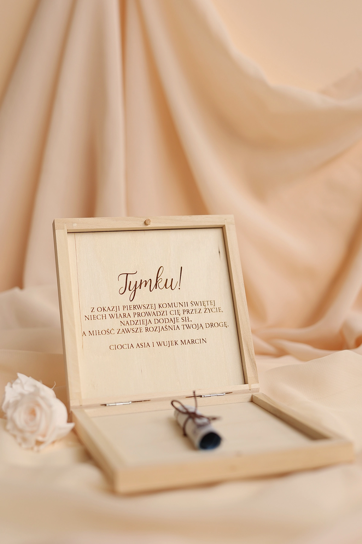 Wyjątkowe i oryginalne pudełko na pieniądze - idealne do wręczenia na Komunię. Na wieczku może znajdować się dowolny tekst, a w środku wybrane życzenia oraz miejsce na przywiązanie banknotów.