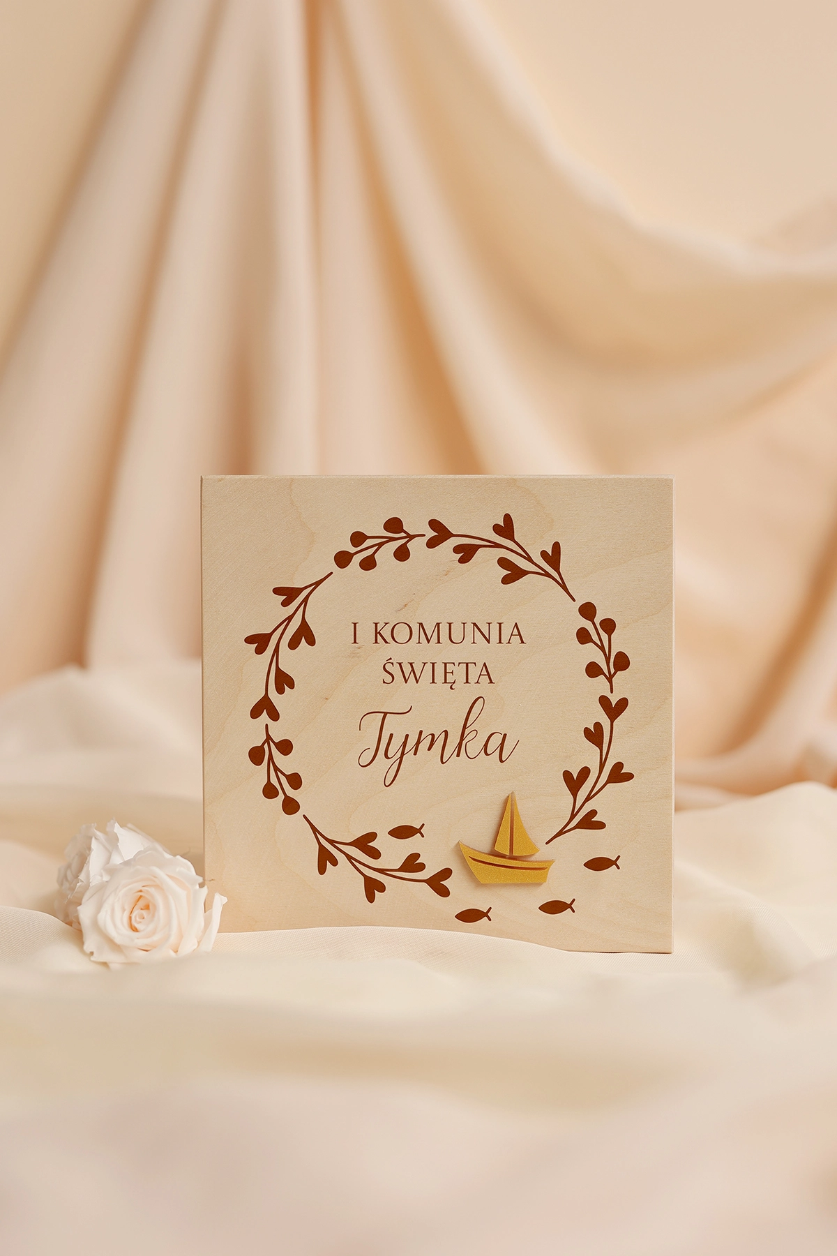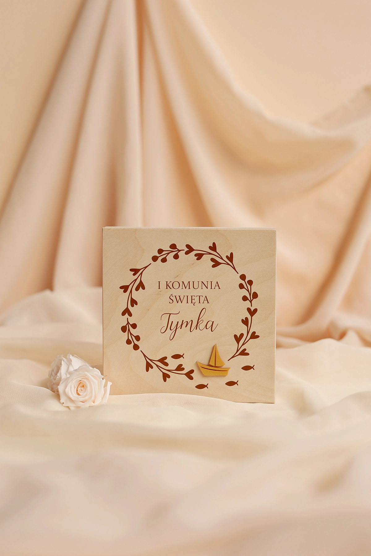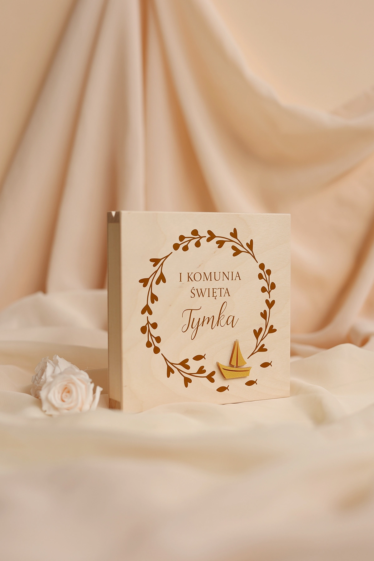 Wyjątkowe i oryginalne pudełko na pieniądze - idealne do wręczenia na Komunię. Na wieczku może znajdować się dowolny tekst, a w środku wybrane życzenia oraz miejsce na przywiązanie banknotów.
