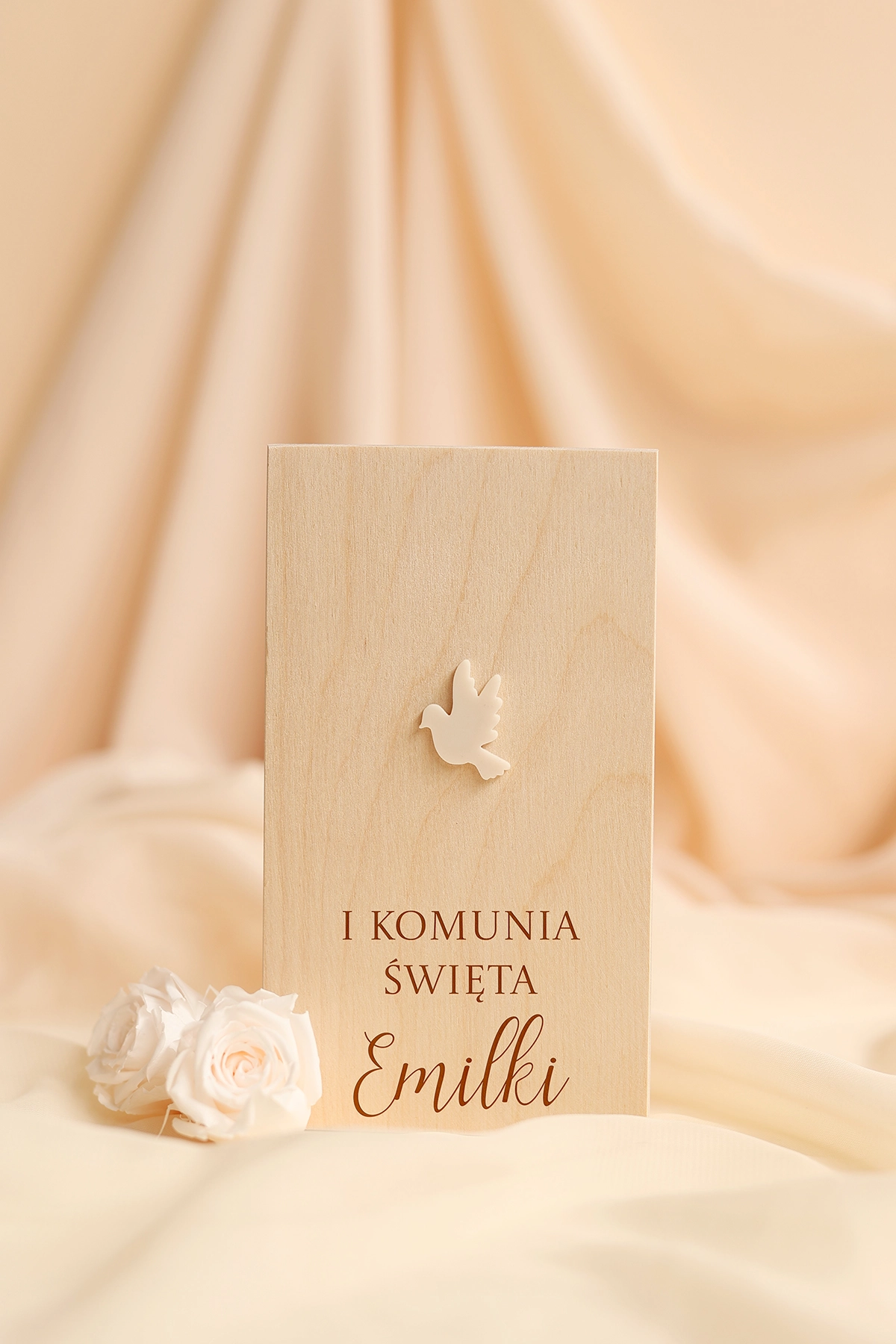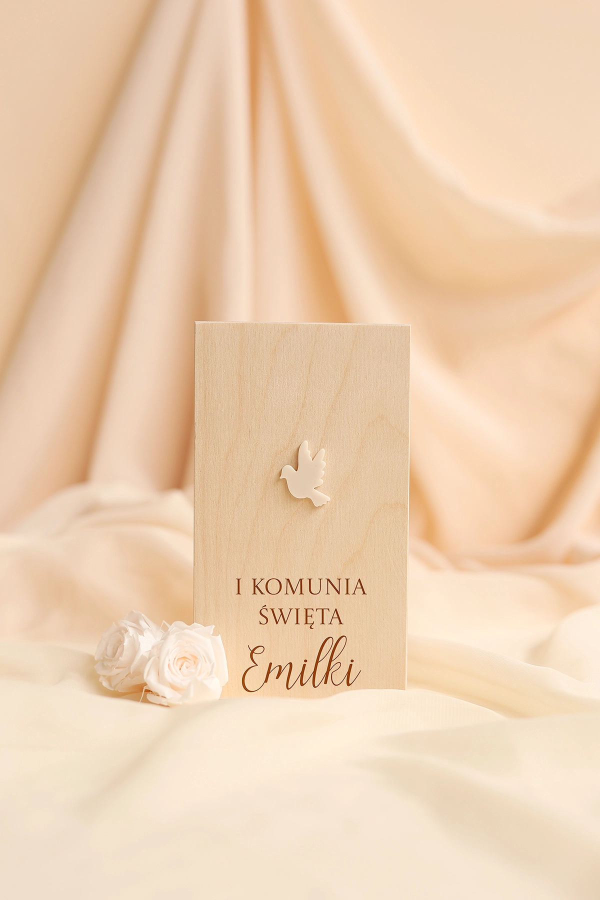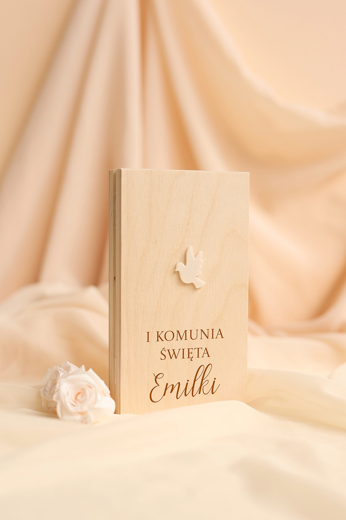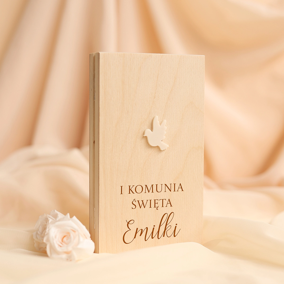 Wieczko pudełka zdobi minimalistyczny, beżowy gołąbek, który symbolizuje pokój, czystość i duchowy charakter uroczystości. Delikatna forma dekoracji sprawia, że całość prezentuje się nowocześnie, lekko i bardzo elegancko.