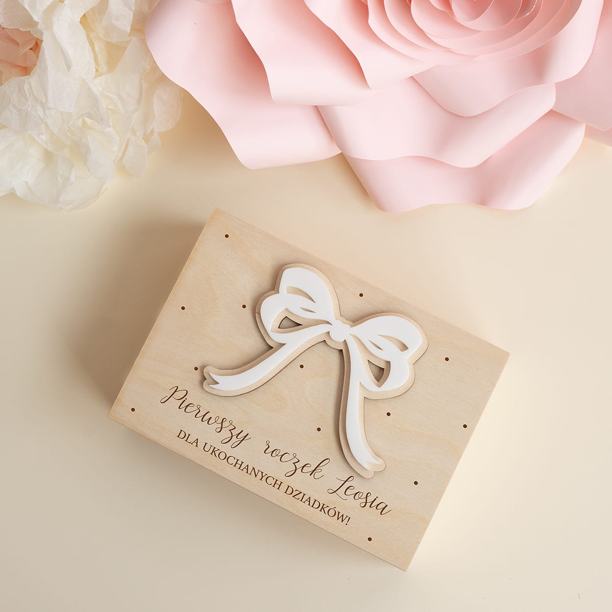 Pudełko pełne wspomnień i wzruszeń! Drewniane pudełko stworzone z myślą o przechowywaniu zdjęć w formacie 9 x 13 cm lub 10 x 15 cm. Idealnie sprawdzi się jako prezent dla Babci i Dziadka, skrywając w środku wspomnienia, na przykład z pierwszego roku życia wnuka lub wnuczki.