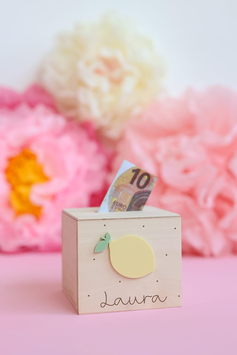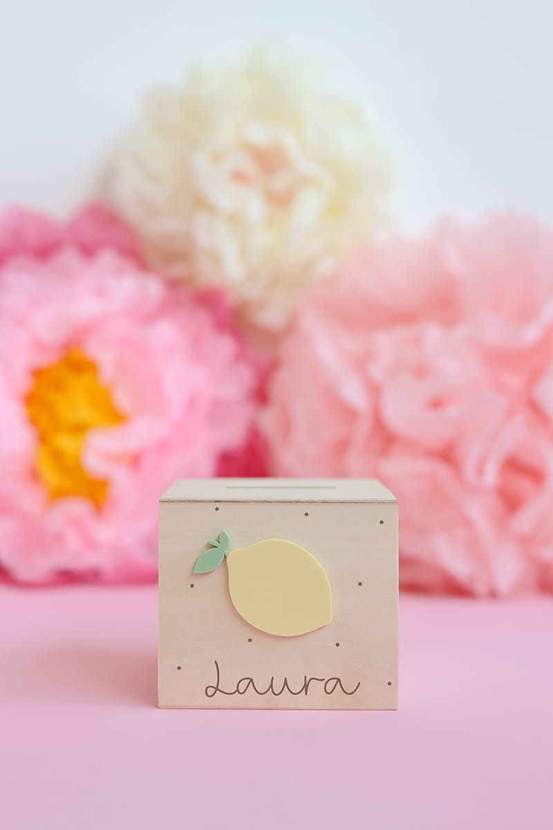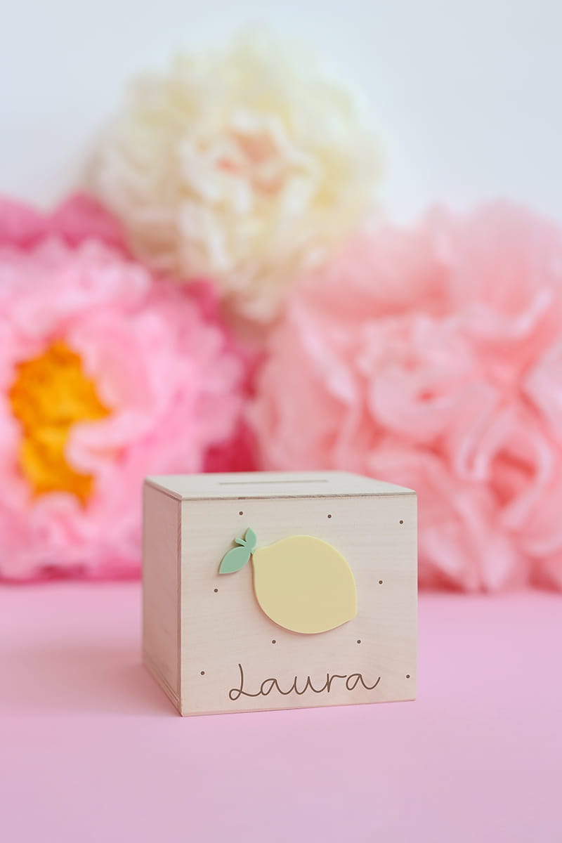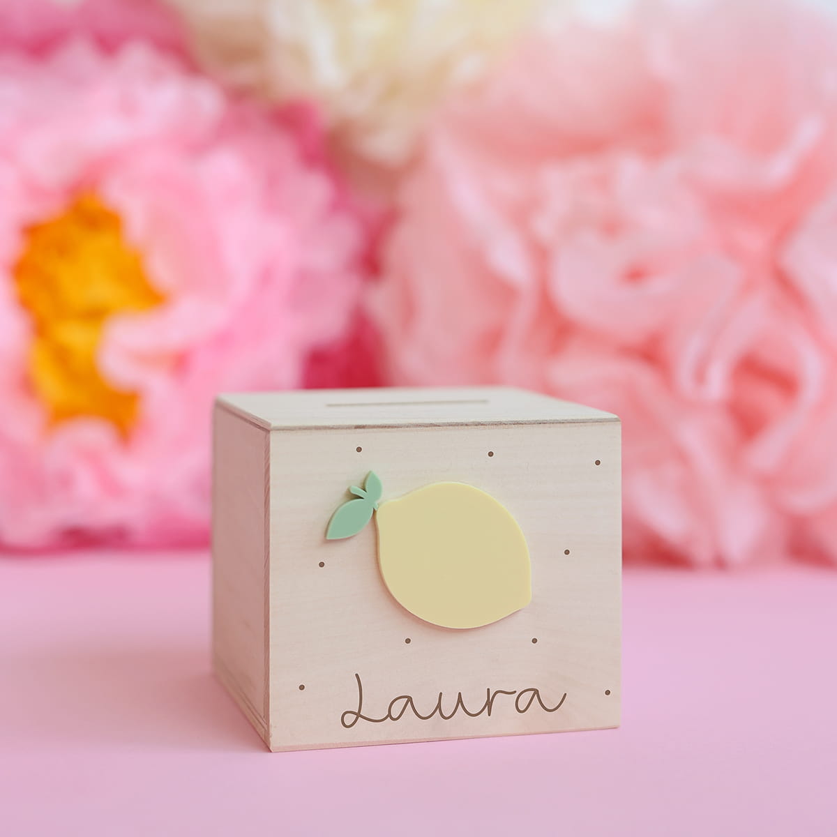 Drewniana skarbonka z motywem uroczej cytrynki i dowolnym imieniem.