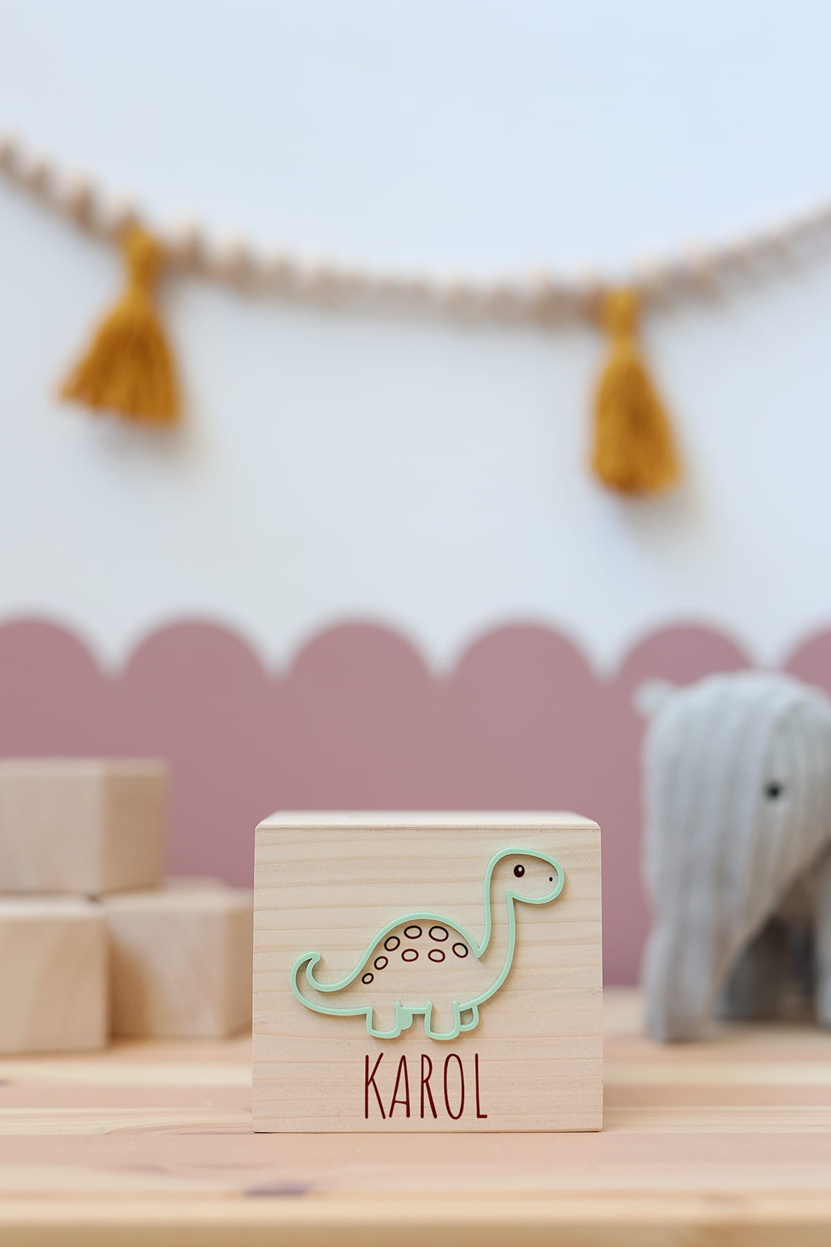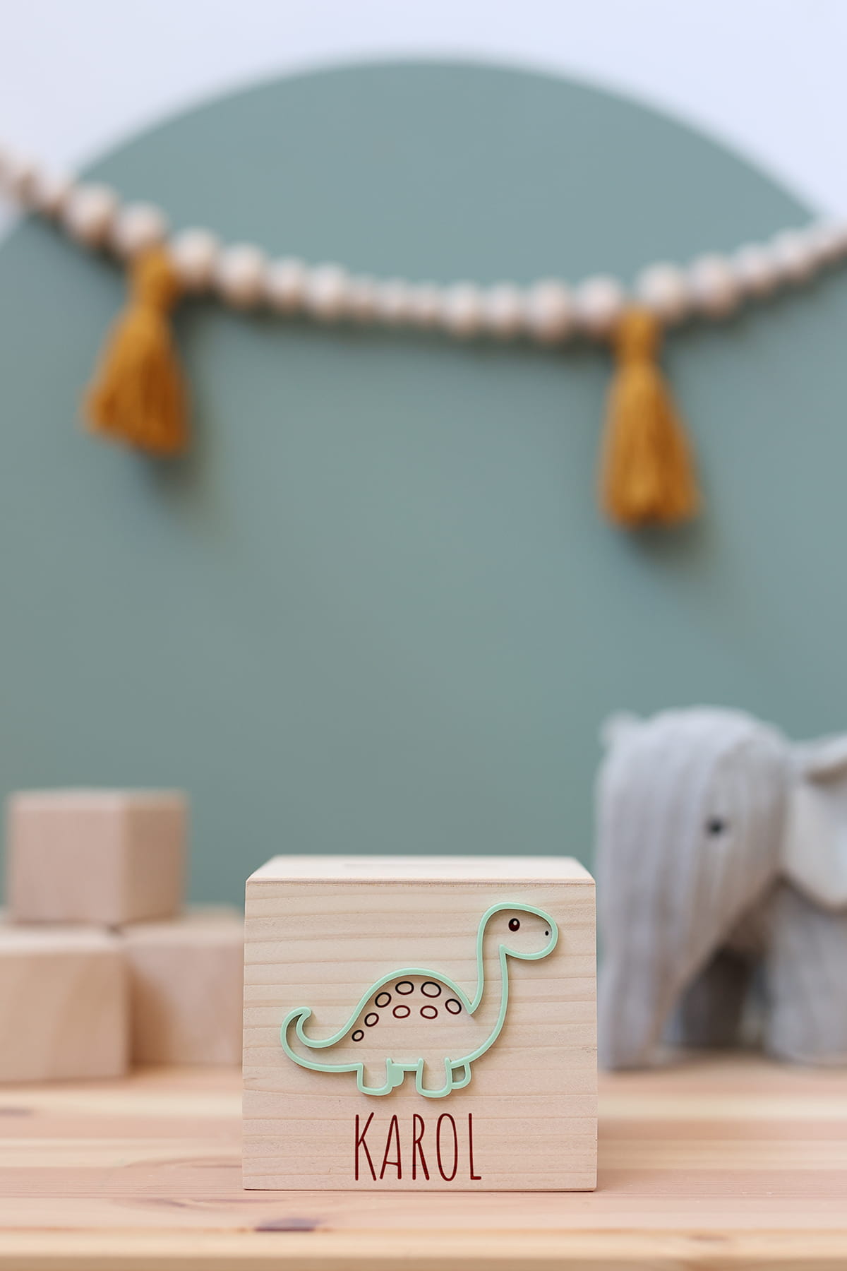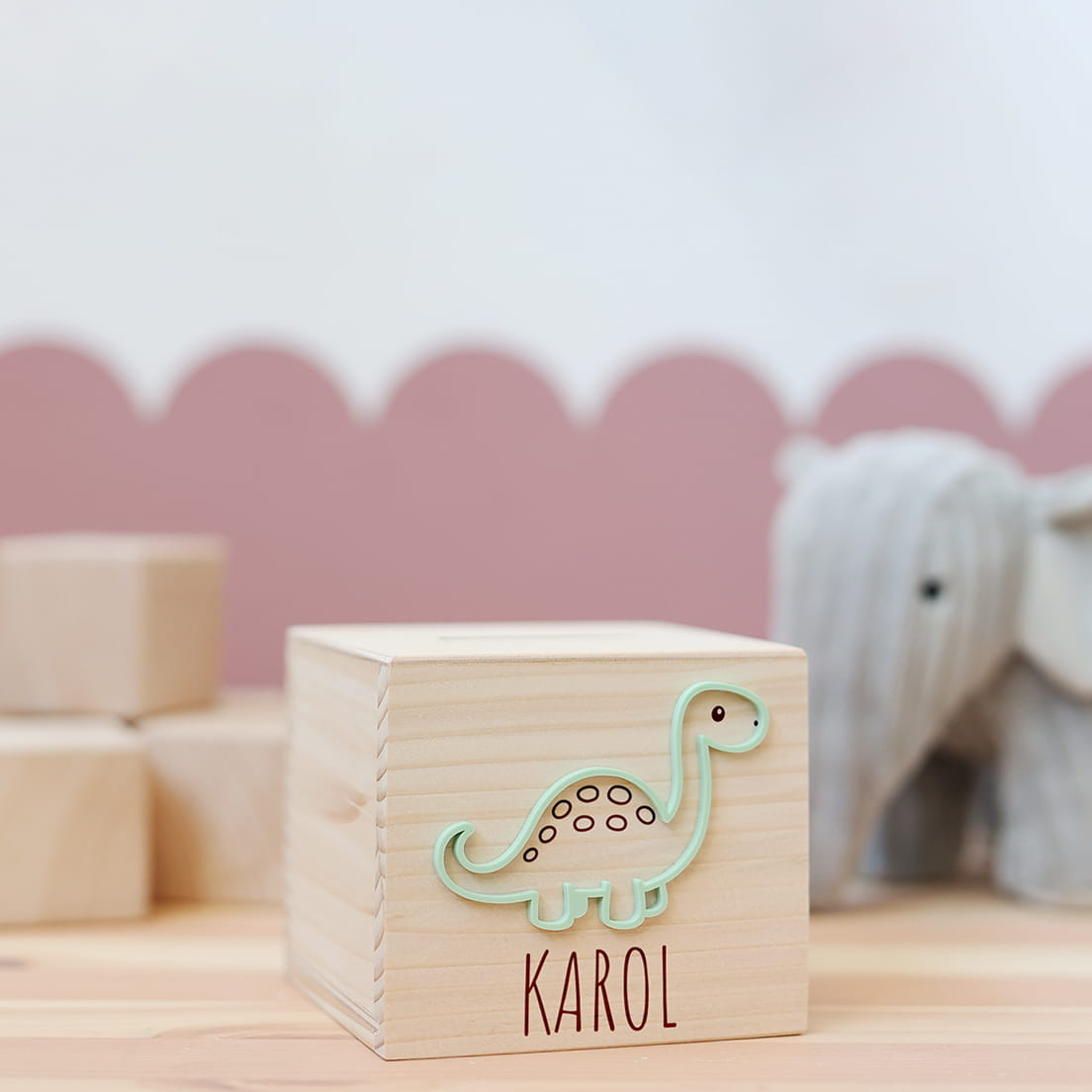 Drewniana skarbonka z motywem zielonego dinozaura i dowolnym imieniem.