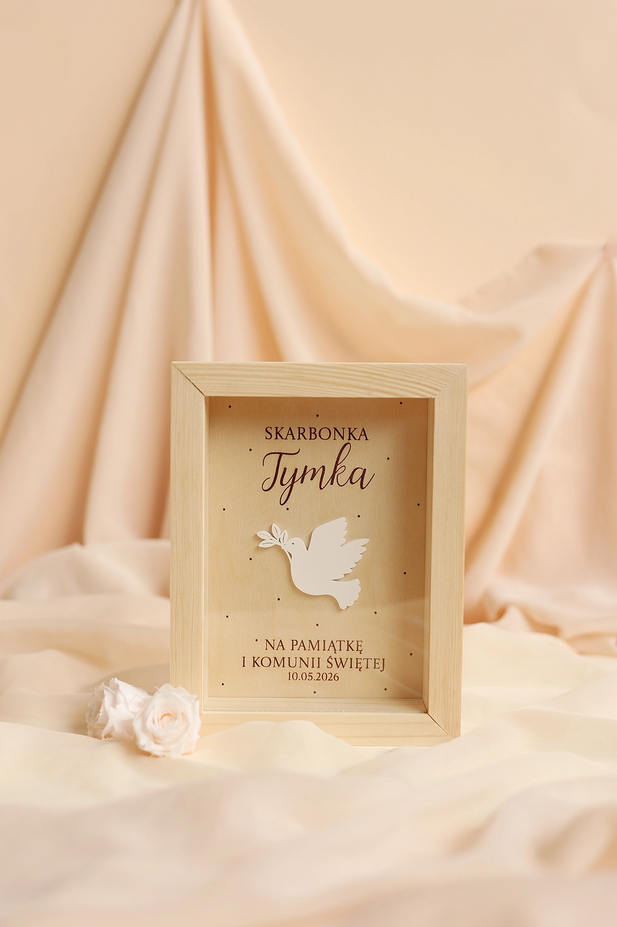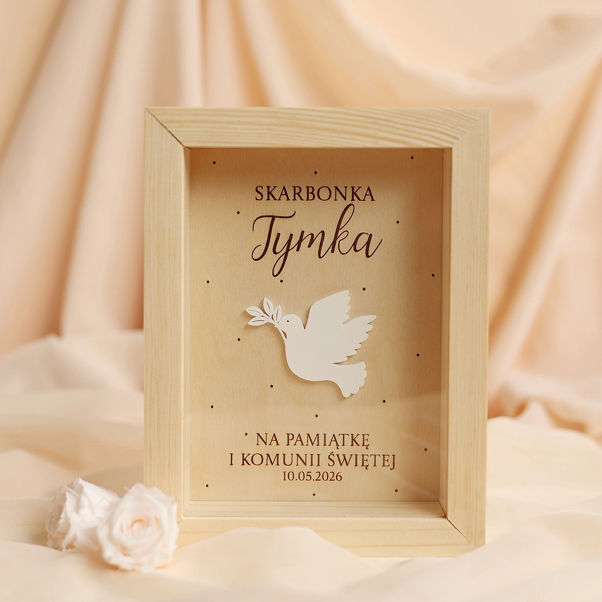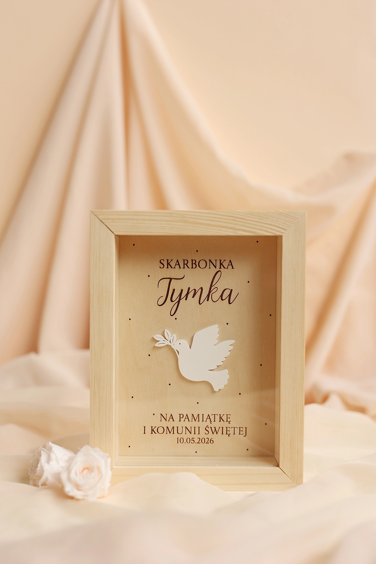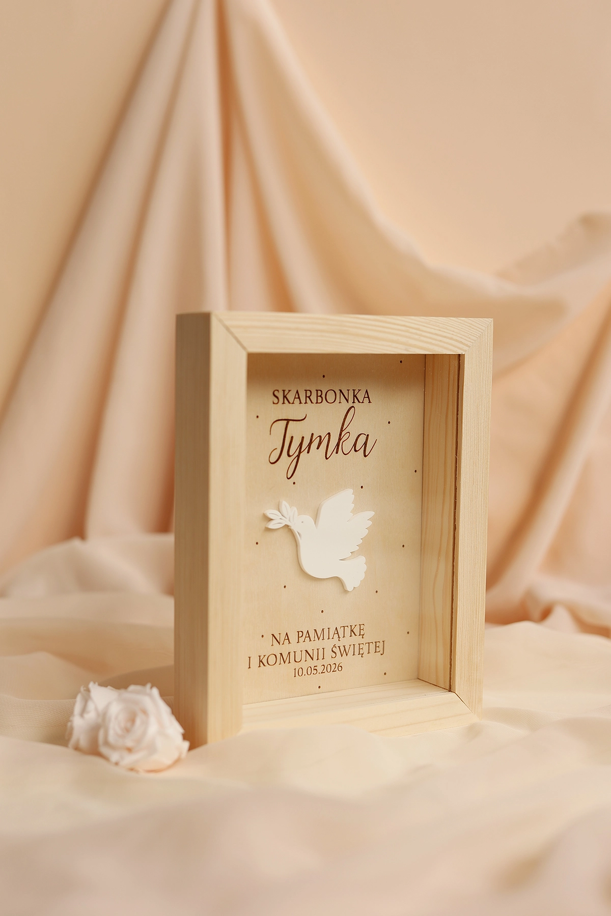 Elegancki i symboliczny prezent na komunię na pieniądze w minimalistycznym stylu. Drewniana skarbonka na Pierwszą Komunię Świętą z personalizacją to wyjątkowy sposób na wręczenie gotówki, który jednocześnie staje się piękną pamiątką komunijną na lata.