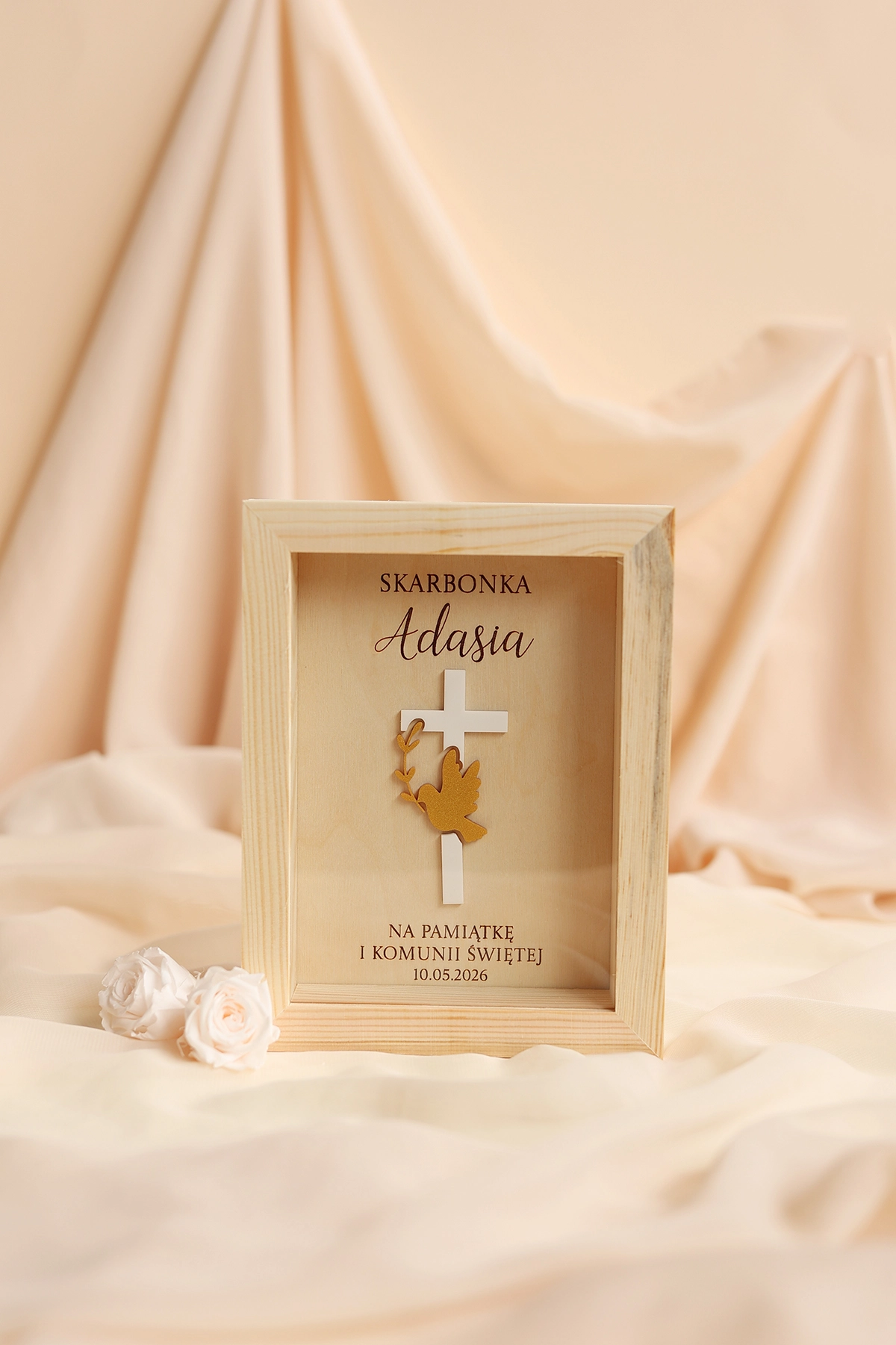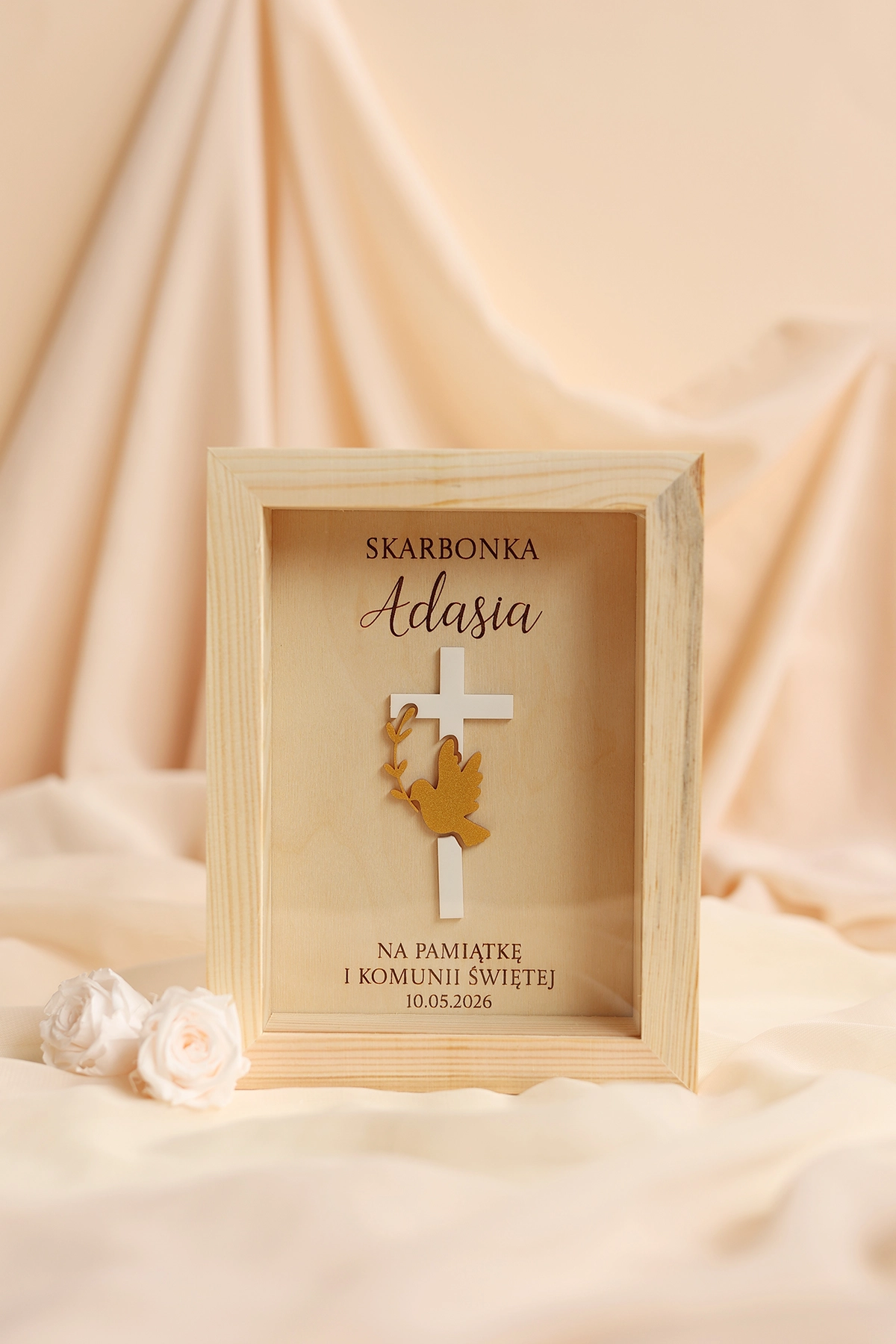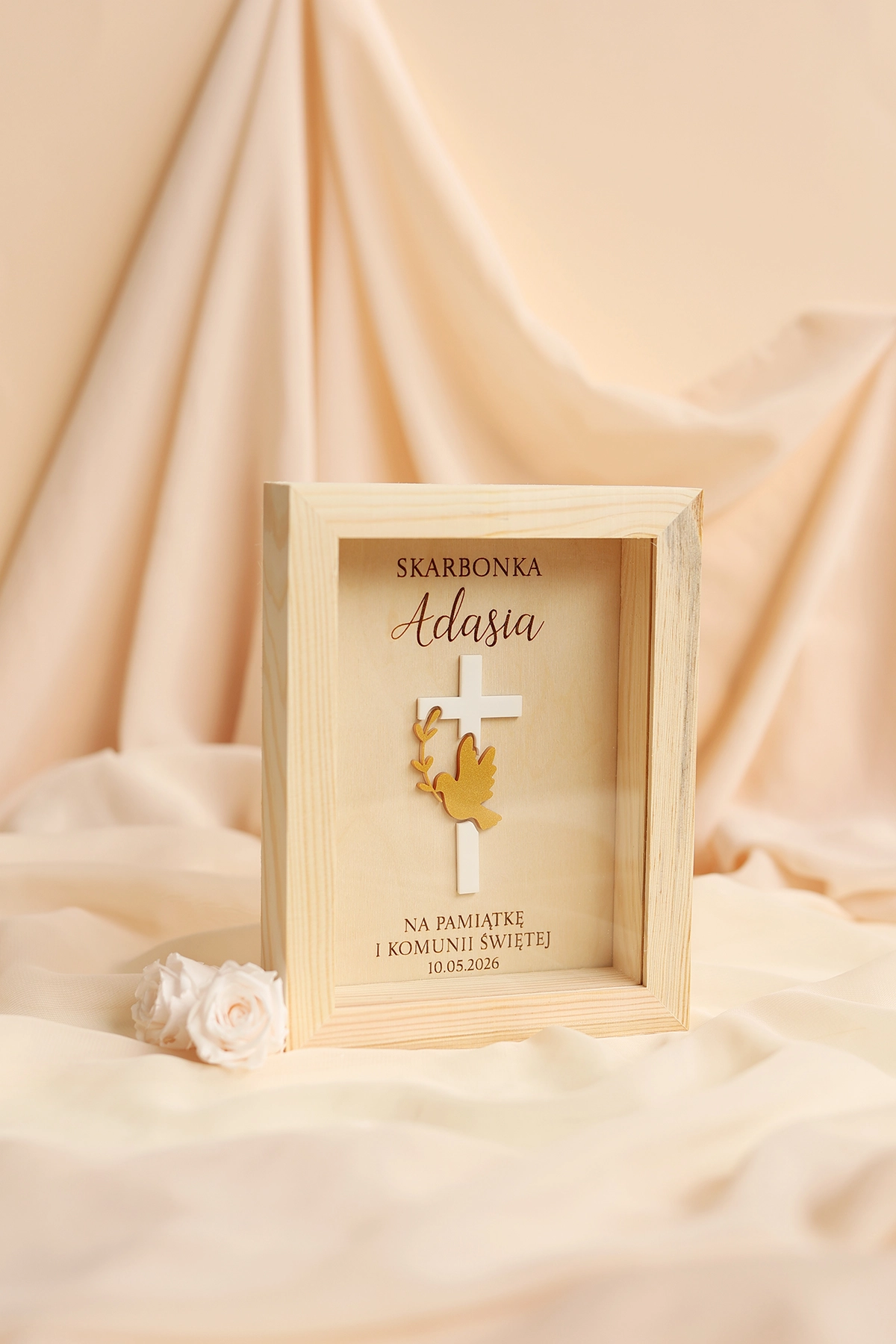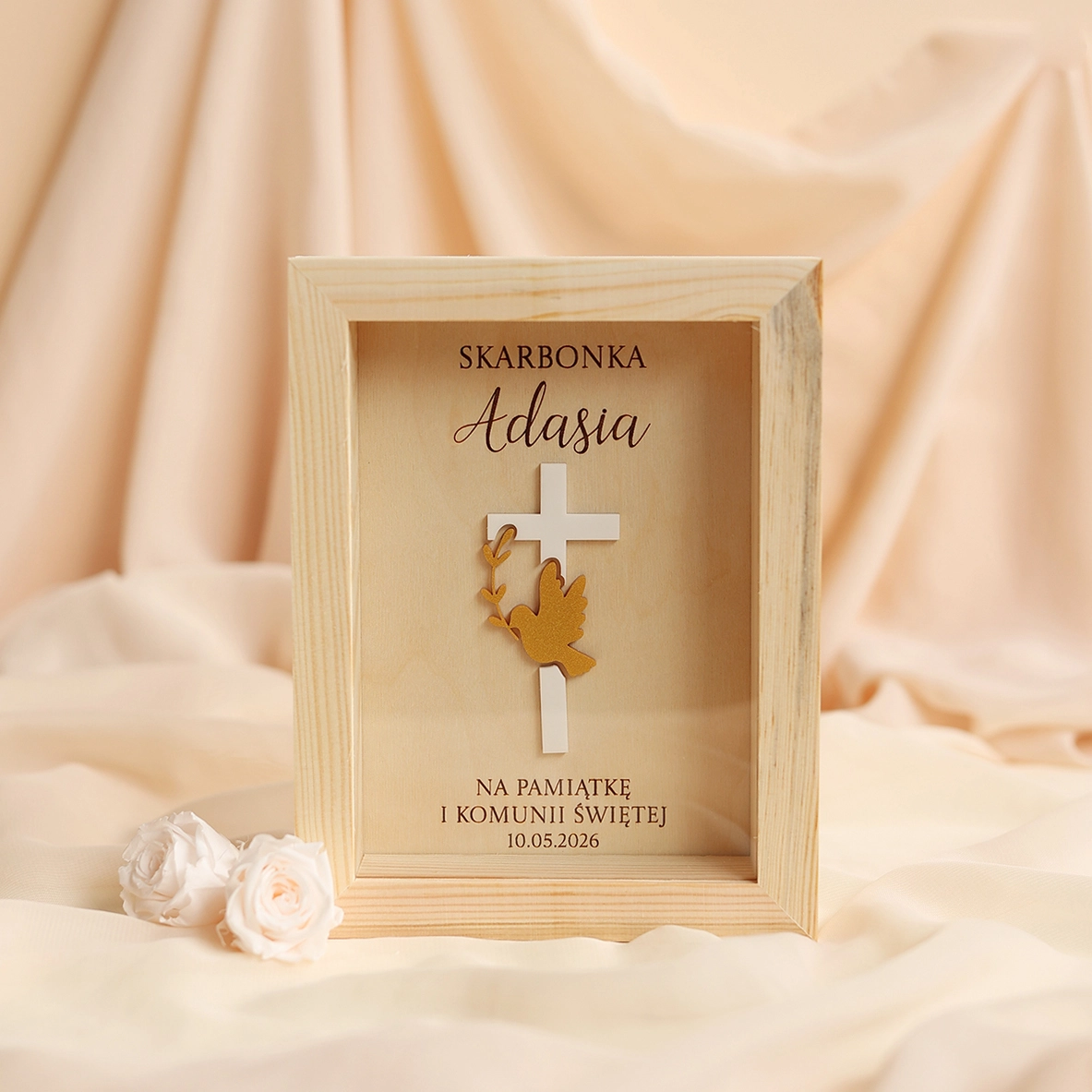 Elegancki i symboliczny prezent na komunię na pieniądze w wyjątkowym, religijnym stylu. Drewniana skarbonka na Pierwszą Komunię Świętą z personalizacją to nie tylko praktyczne opakowanie na gotówkę, ale również wyjątkowa pamiątka komunijna na długie lata.