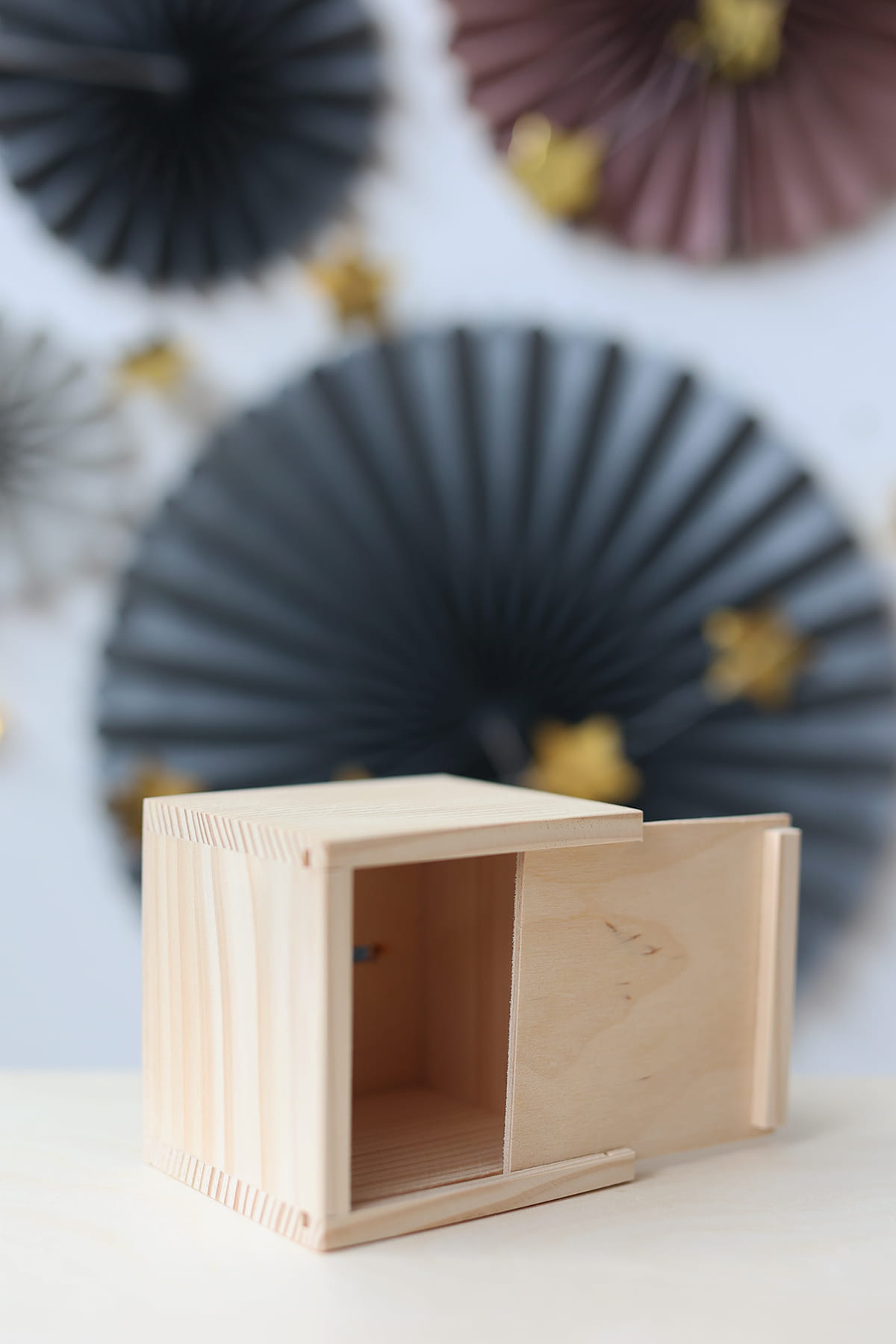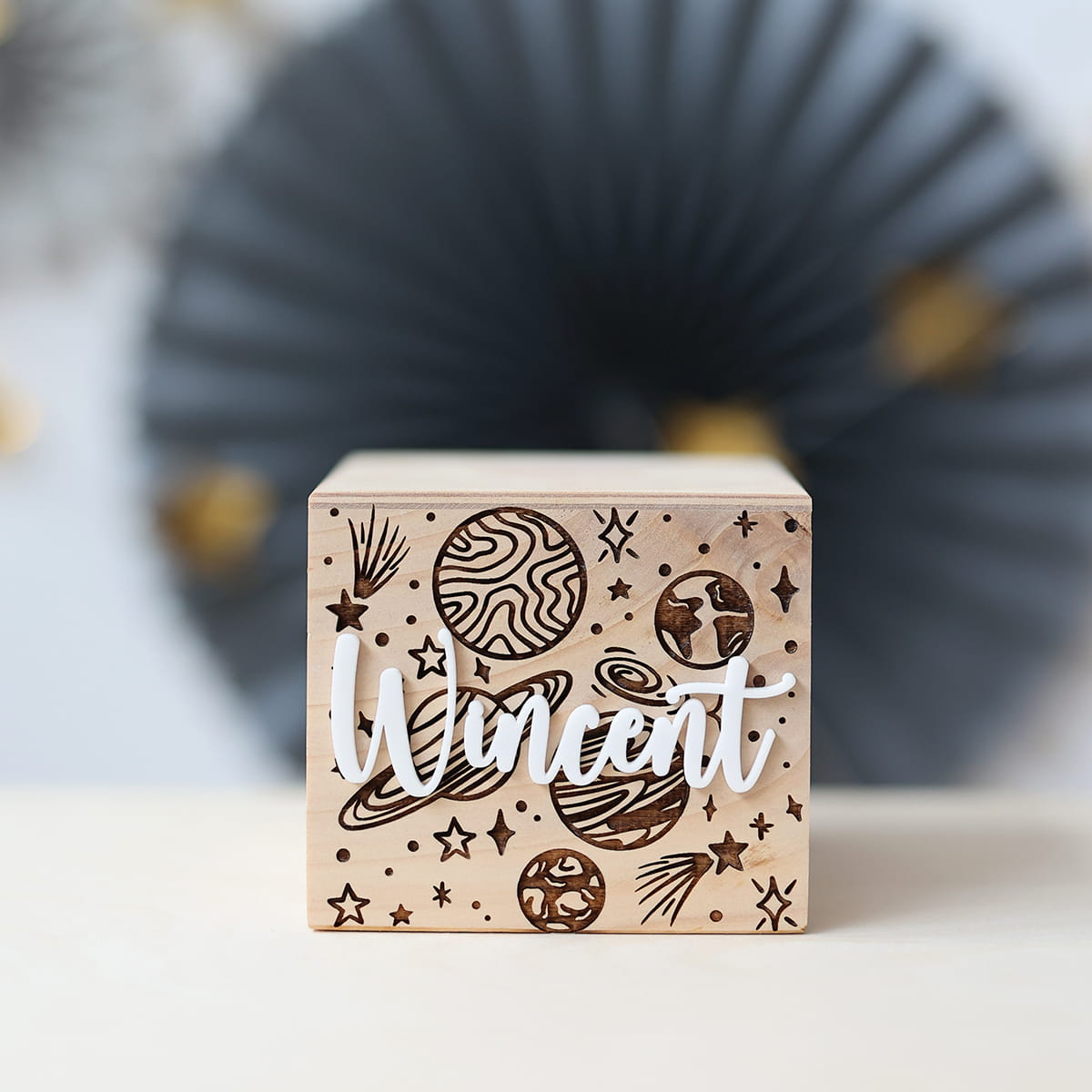 Drewniana skarbonka z motywem kosmicznym, personalizowana białym imieniem.