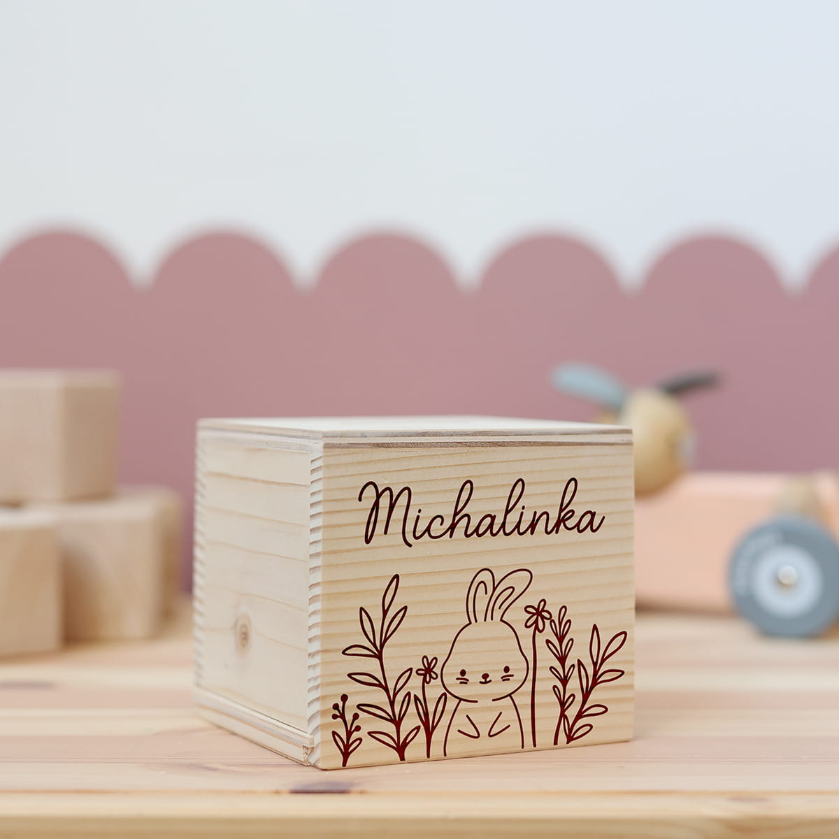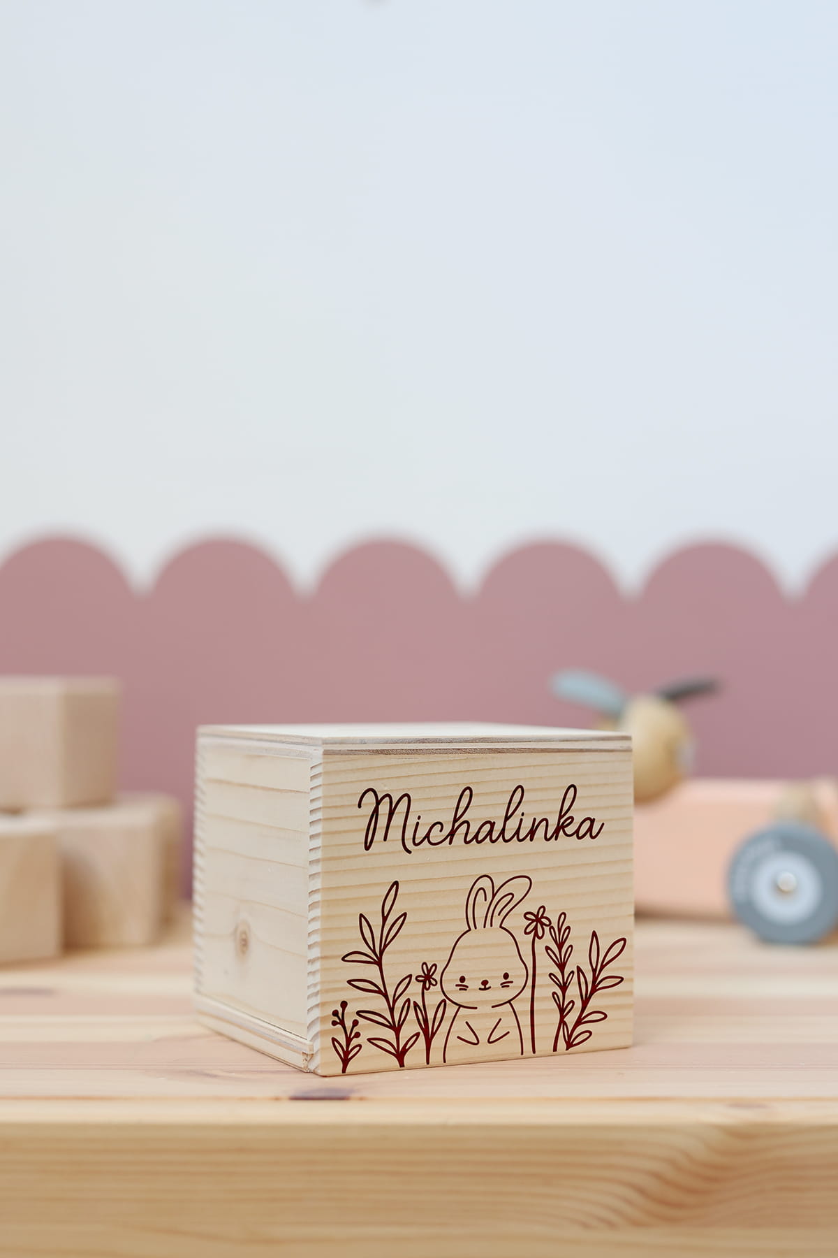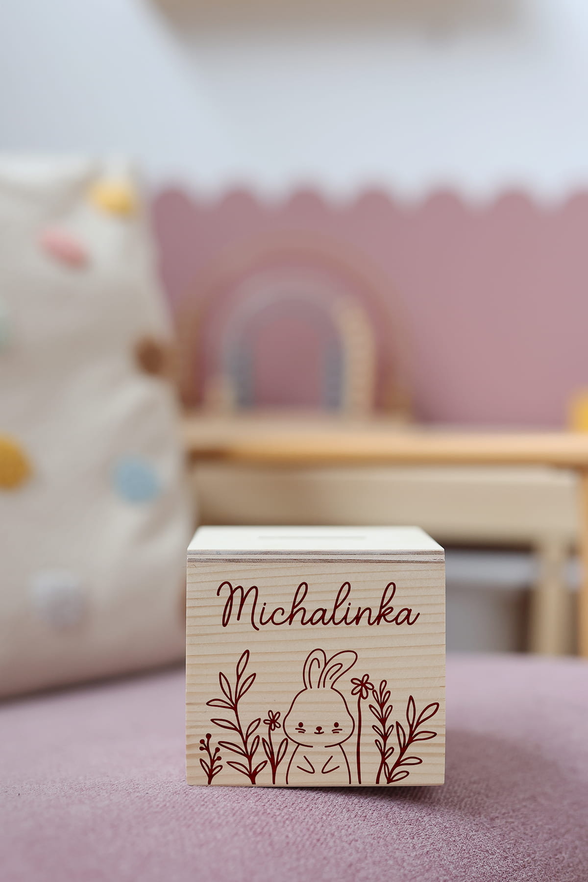 Drewniana skarbonka z motywem króliczka i dowolnym imieniem.