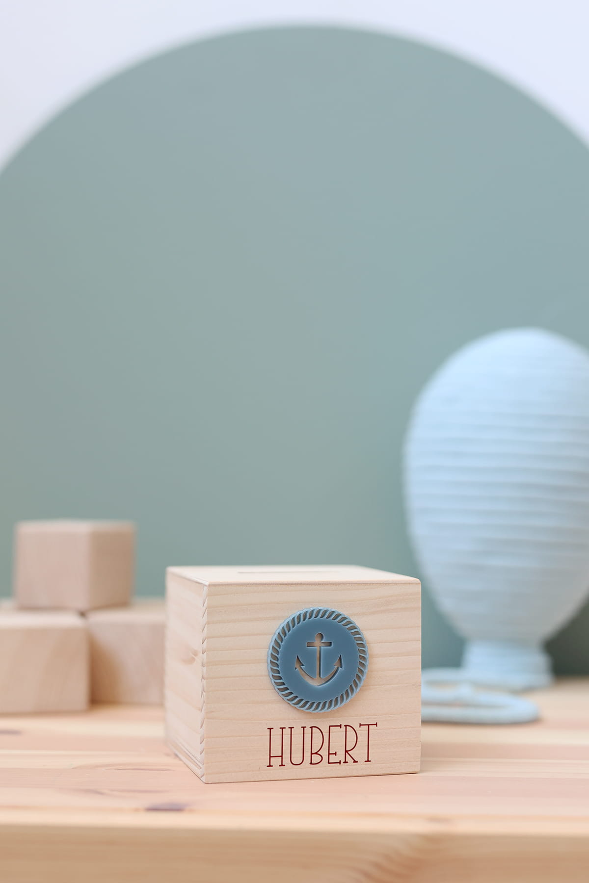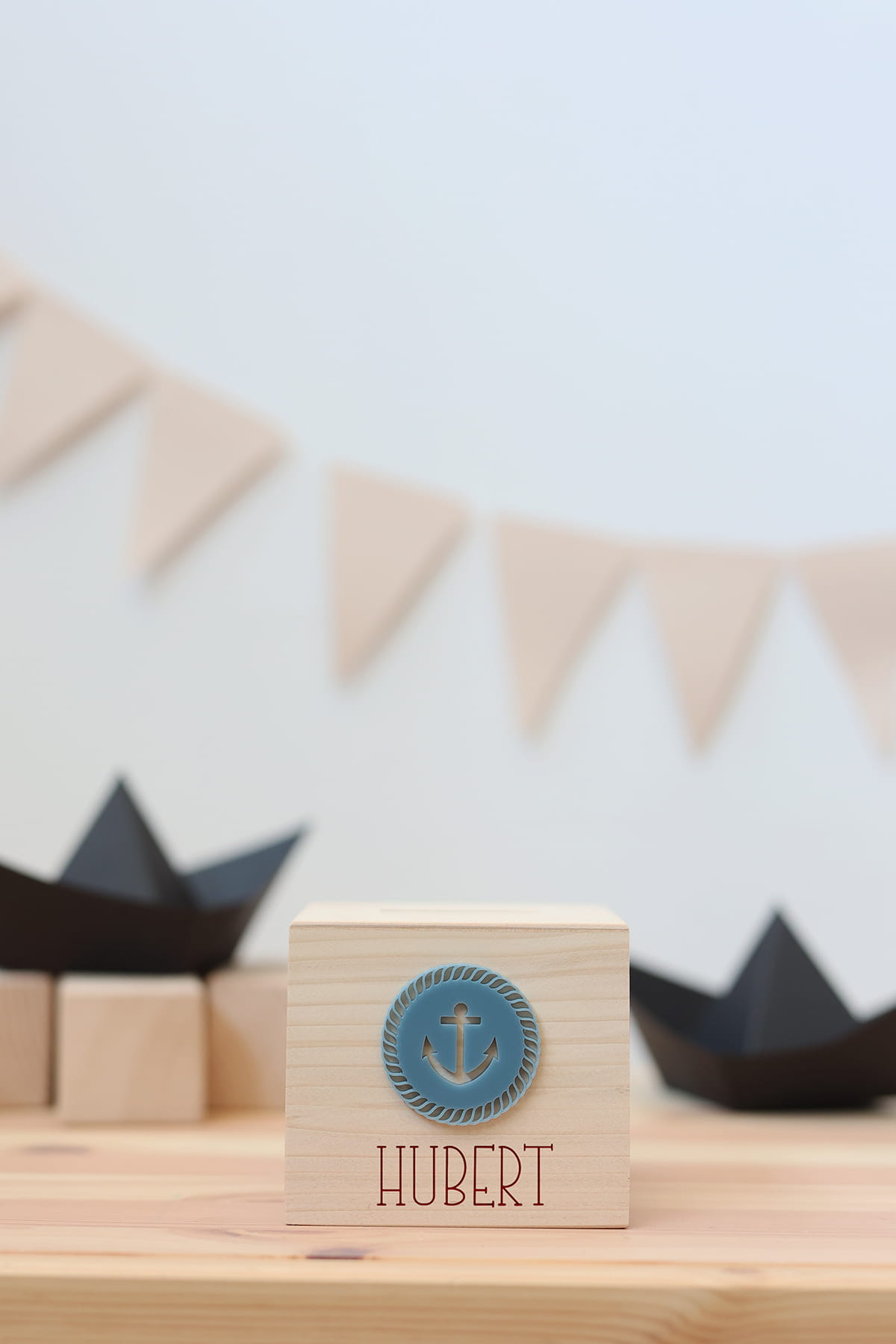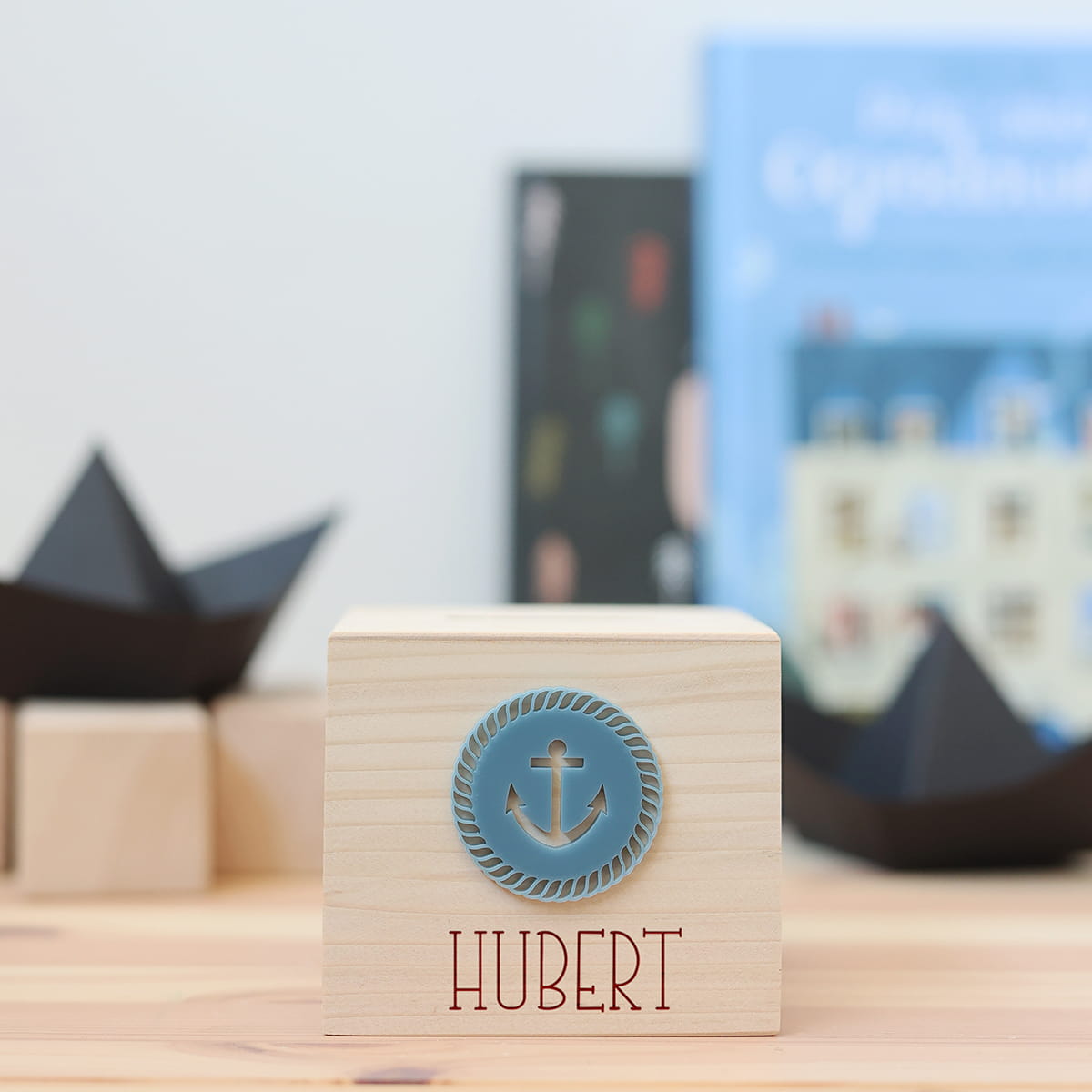 Drewniana skarbonka z motywem marynarskim i dowolnym imieniem.