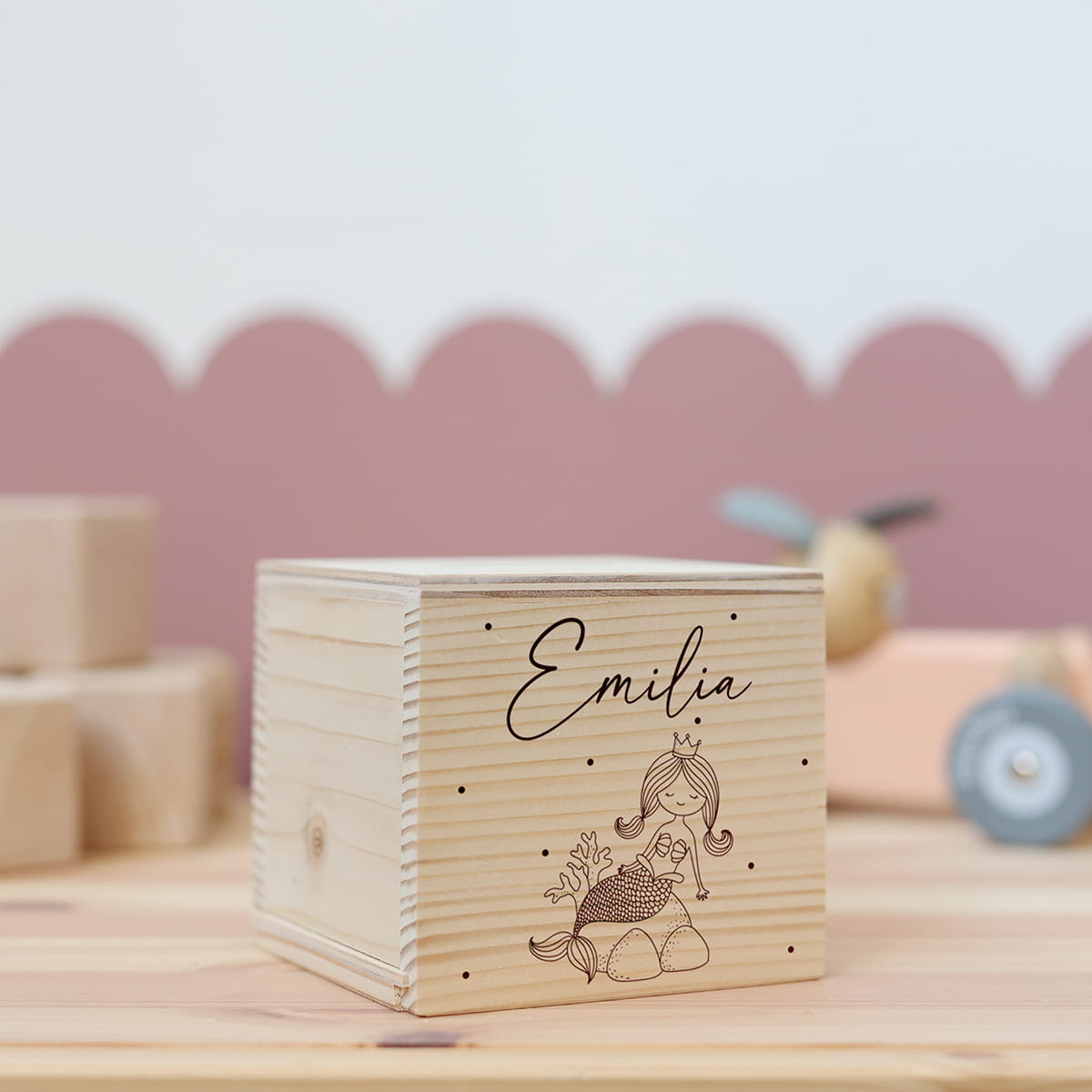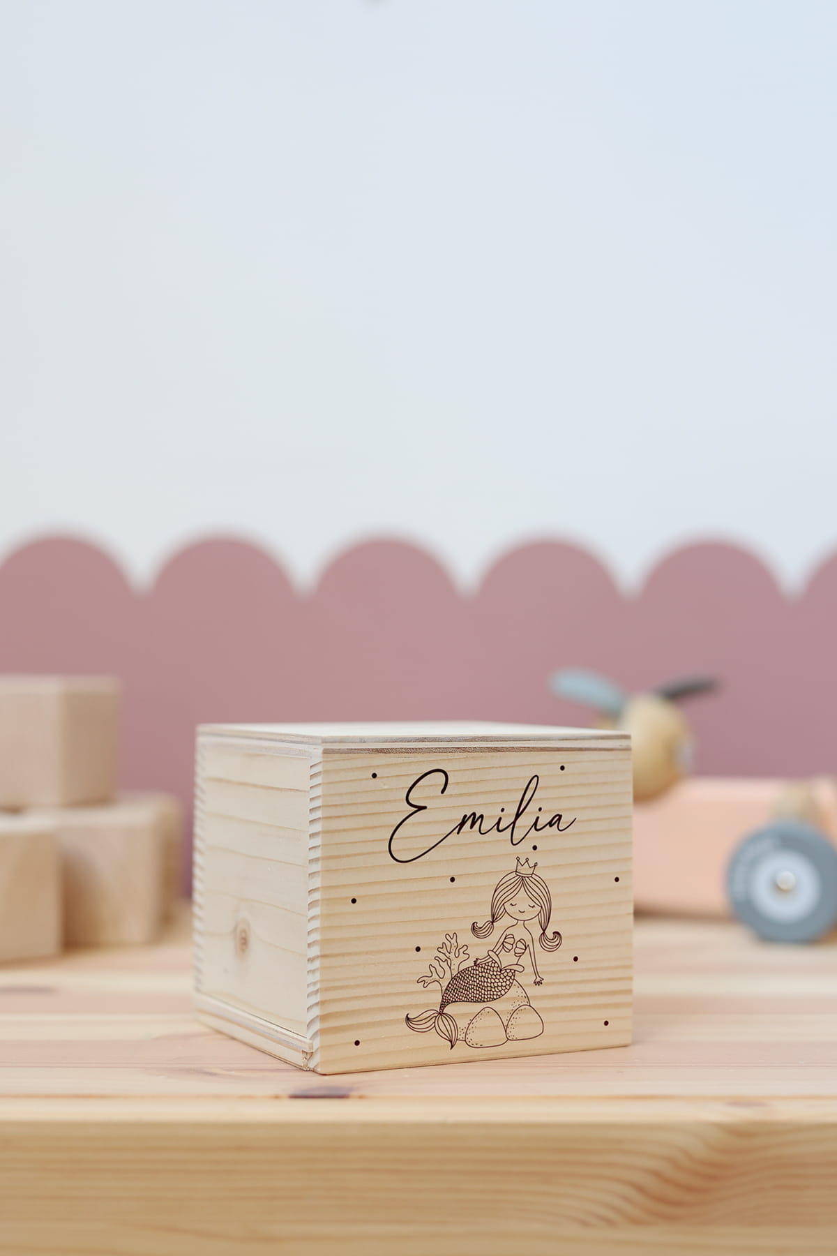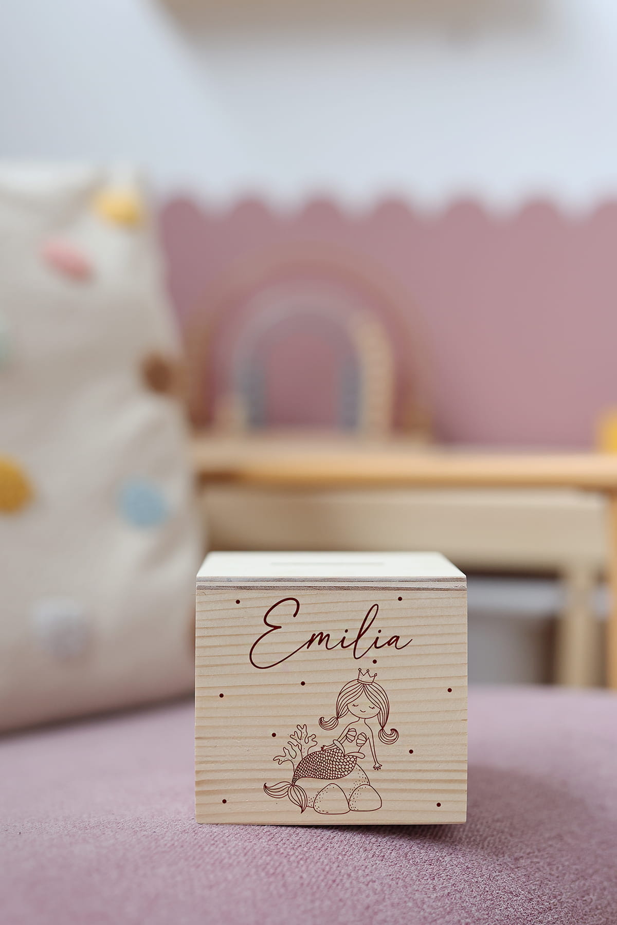 Drewniana skarbonka z motywem syrenki i dowolnym imieniem.