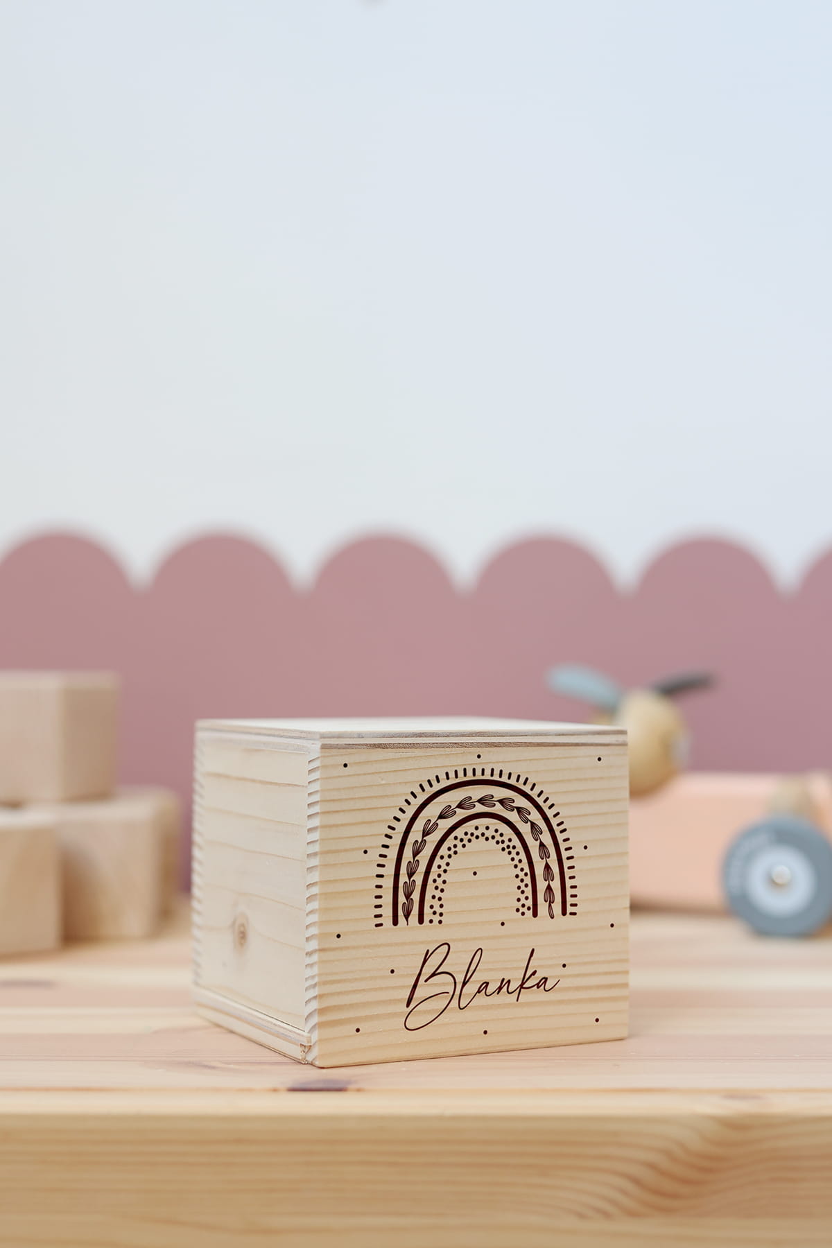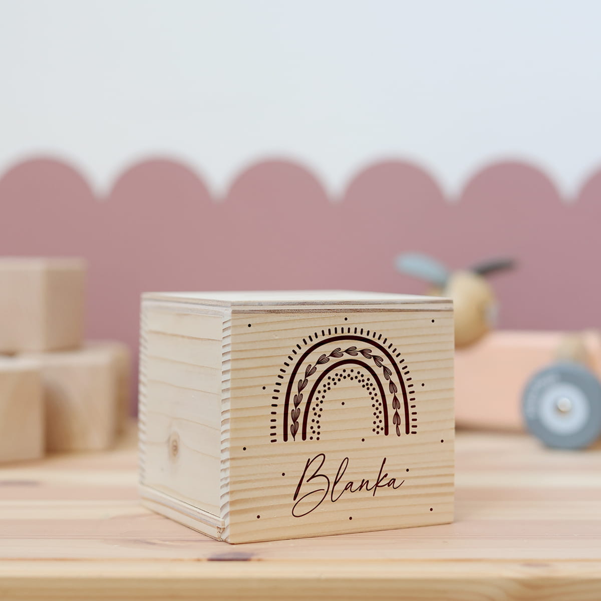 Drewniana skarbonka z motywem tęczy i dowolnym imieniem.