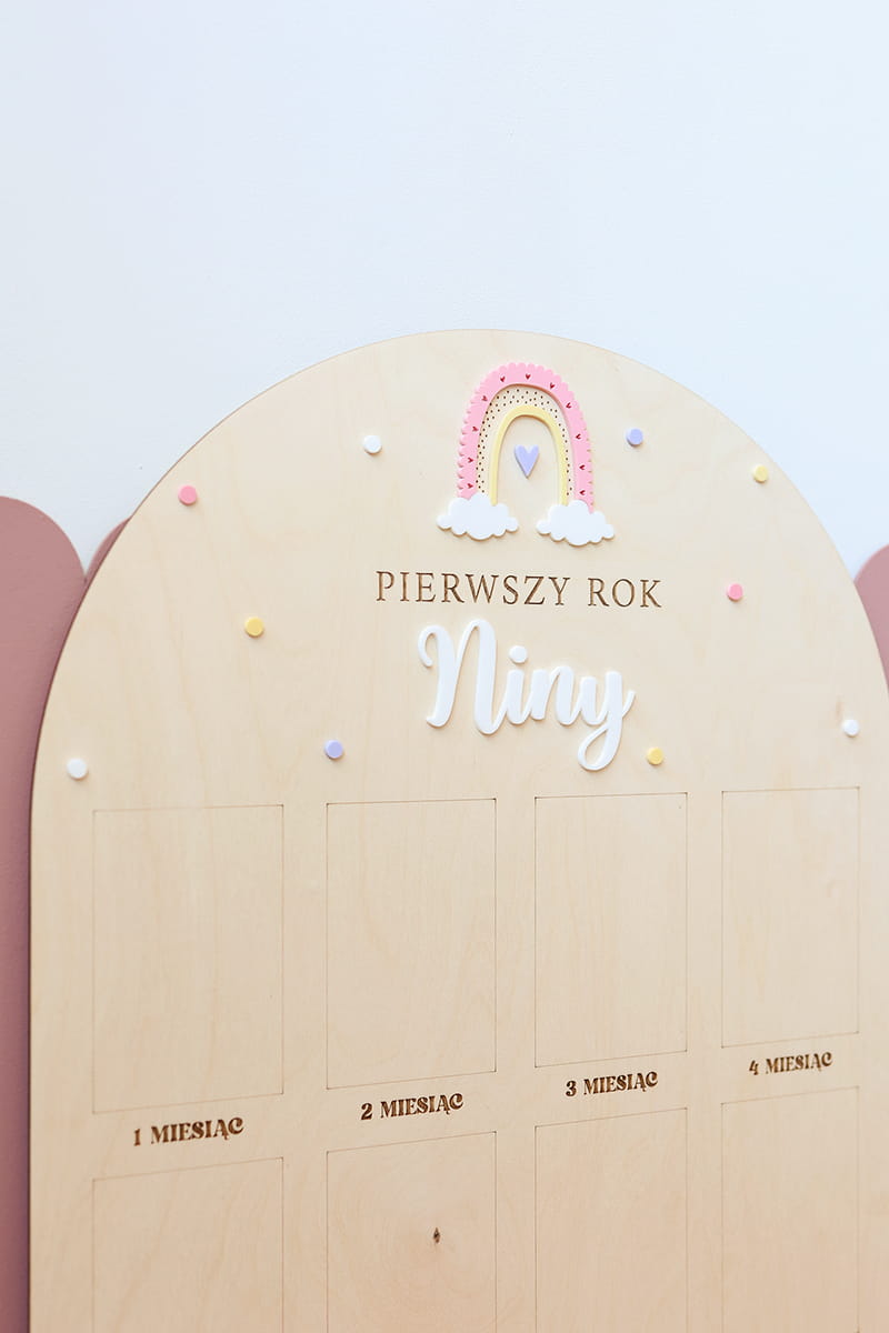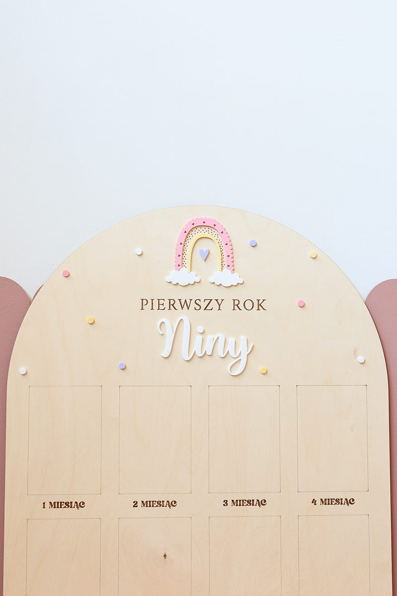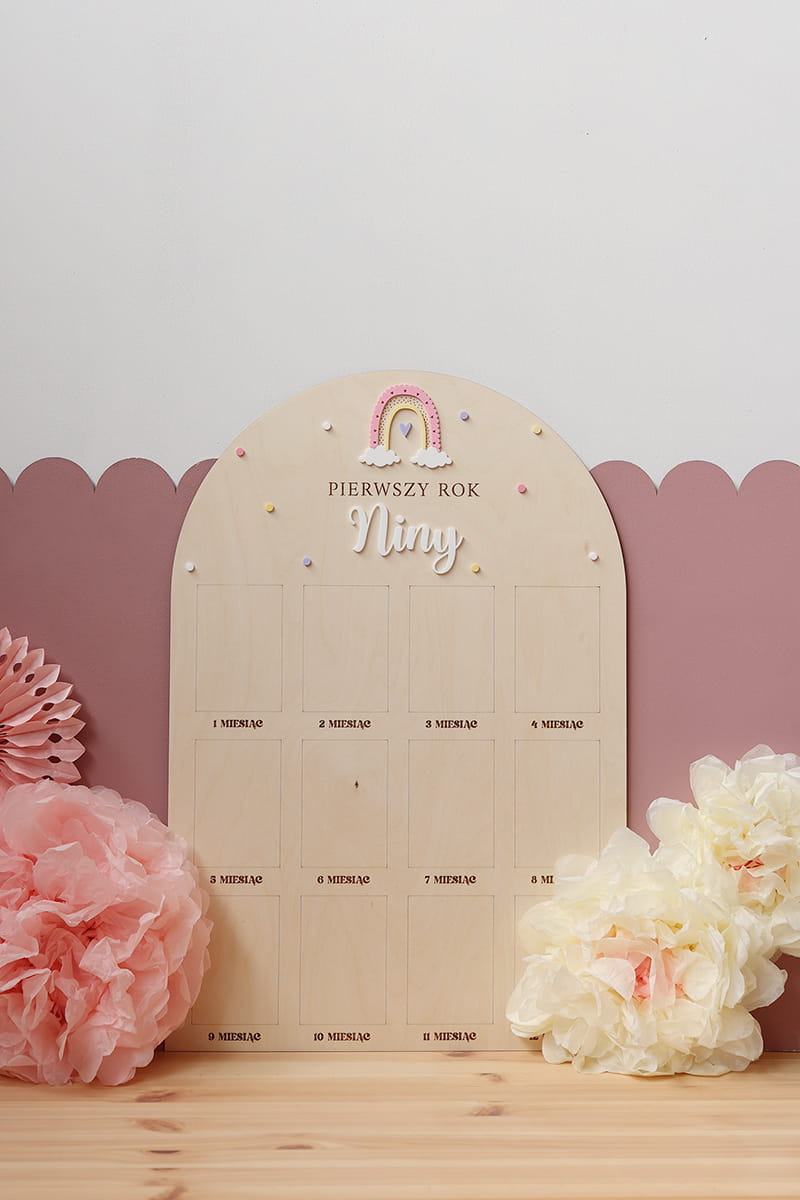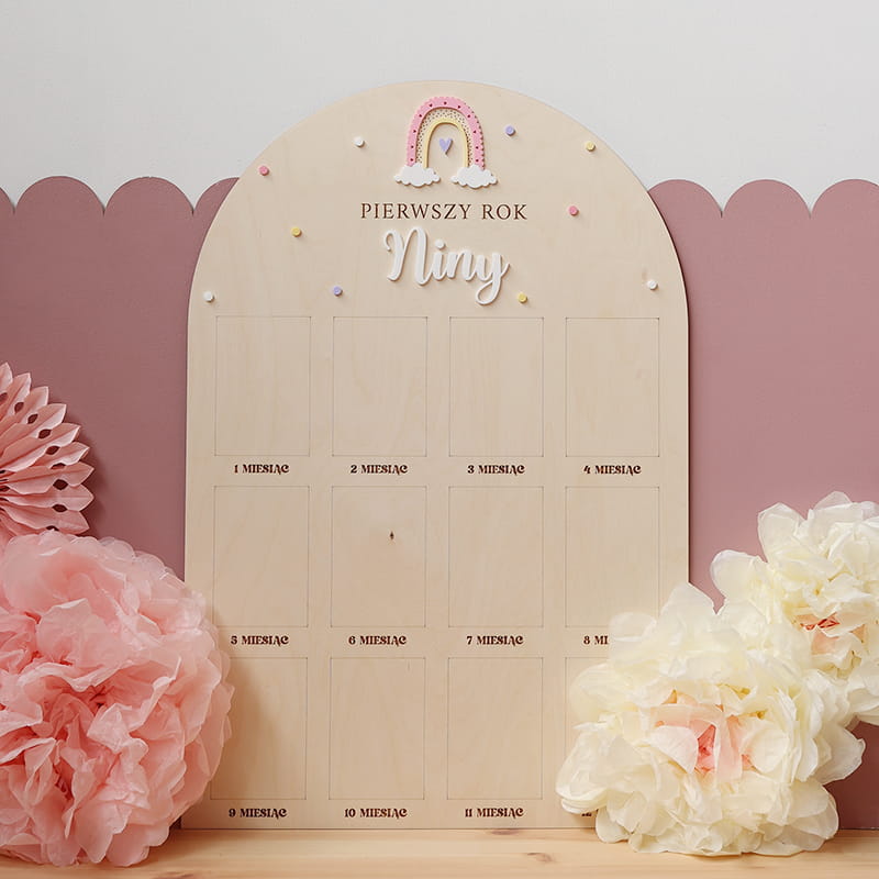 Zachowaj najpiękniejsze wspomnienia z pierwszego roku życia swojego dziecka dzięki wyjątkowej drewnianej tablicy. To doskonała pamiątka, która pozwala na wyeksponowanie 12 zdjęć podczas przyjęcia urodzinowego – po jednym z każdego miesiąca, by w piękny sposób uwiecznić niezwykłą podróż, jaką jest dorastanie maluszka.