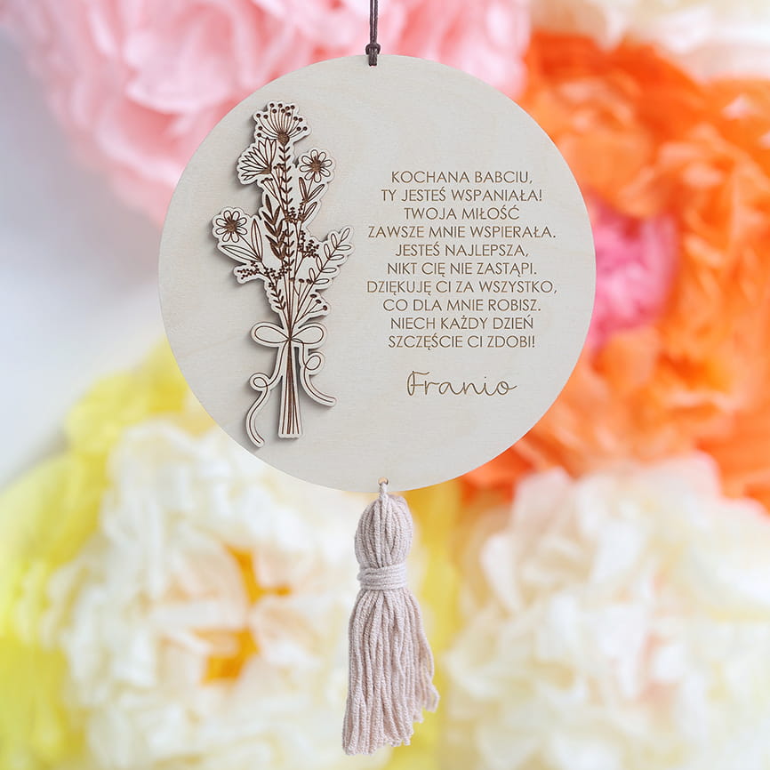 Wyjątkowa tabliczka dedykowana Babci, którą zdobi motyw polnych kwiatów oraz ręcznie wykonany, kolorowy chwost.