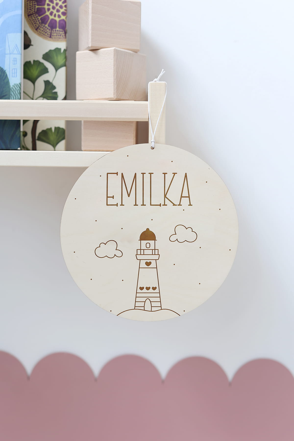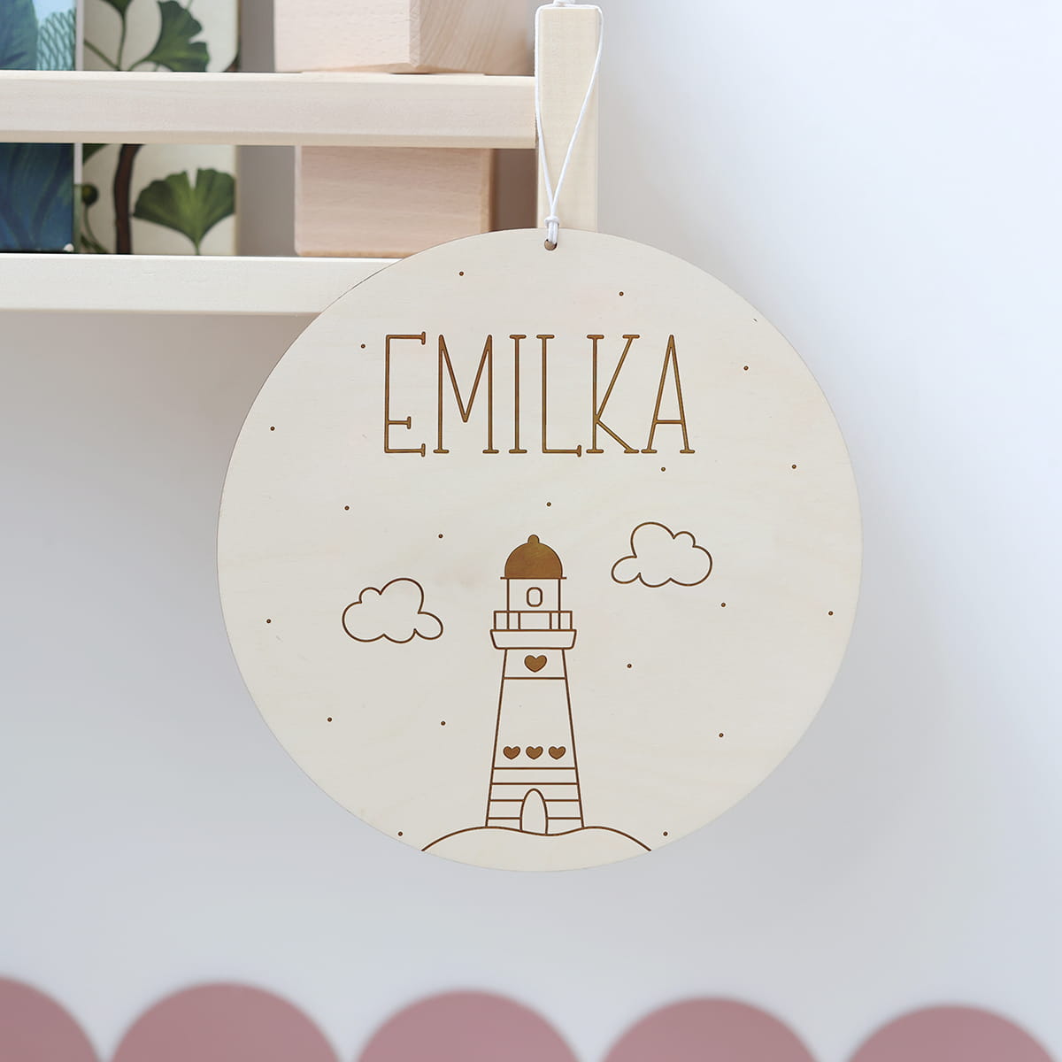 Grawerowana tabliczka z motywem latarni morskiej i dowolnym imieniem lub imieniem i metryczką urodzenia.