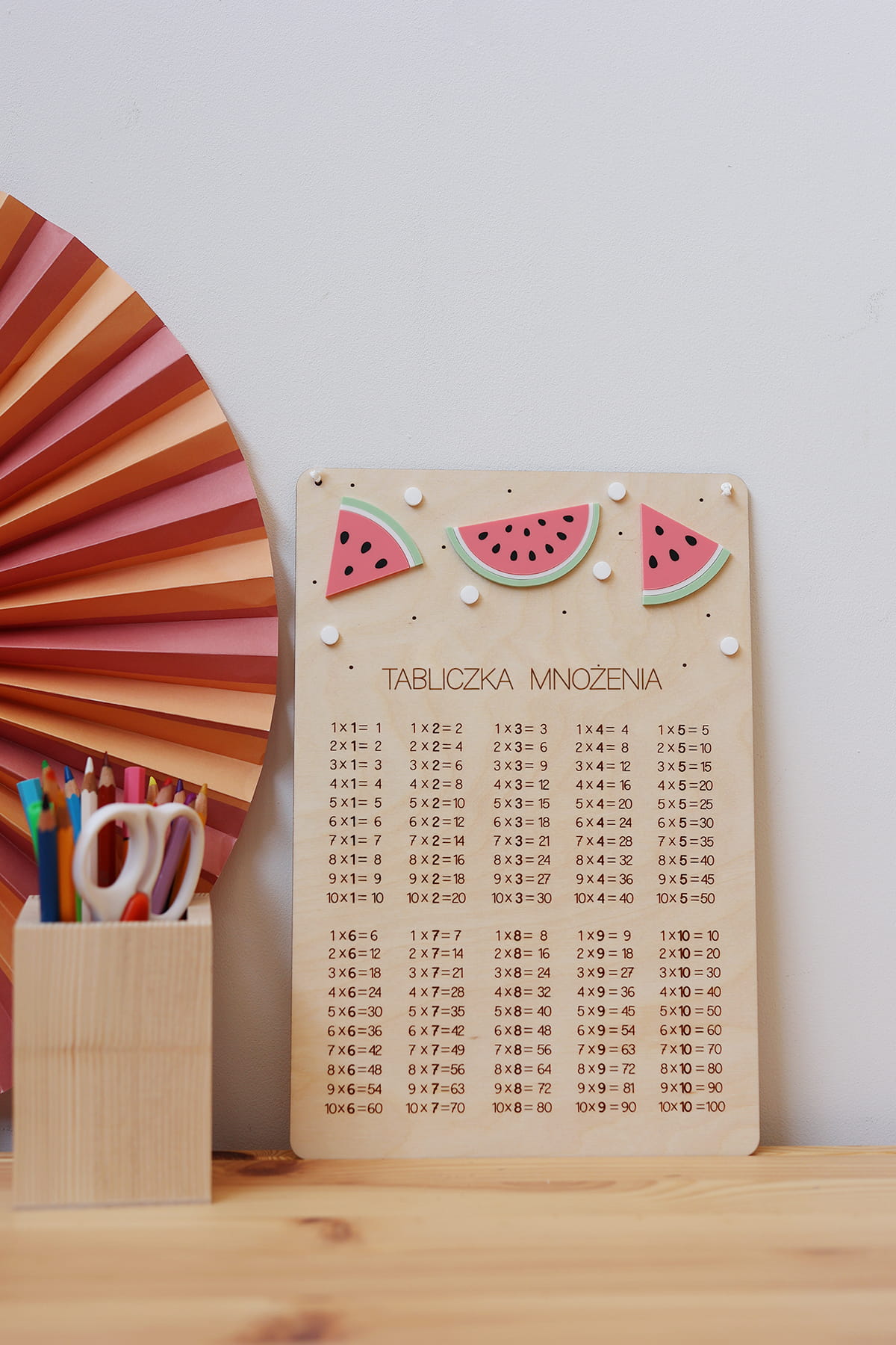 Drewniana pomoc edukacyjna z grawerowaną tabliczką mnożenia. Ułatwia naukę matematyki i stanowi kolorową dekorację pokoju dziecięcego. Na tabliczce może się znaleźć dowolne imię lub hasło "Tabliczka mnożenia"