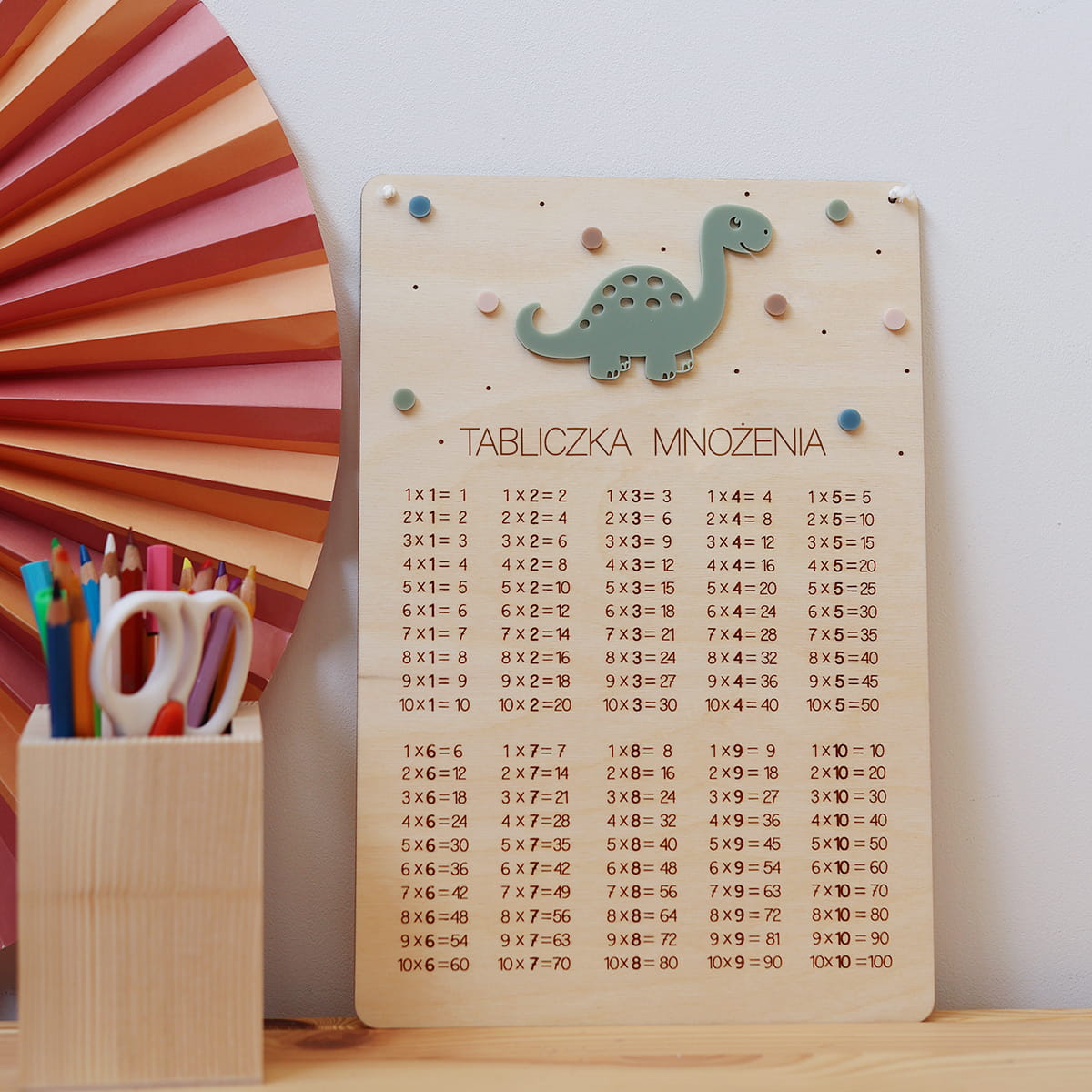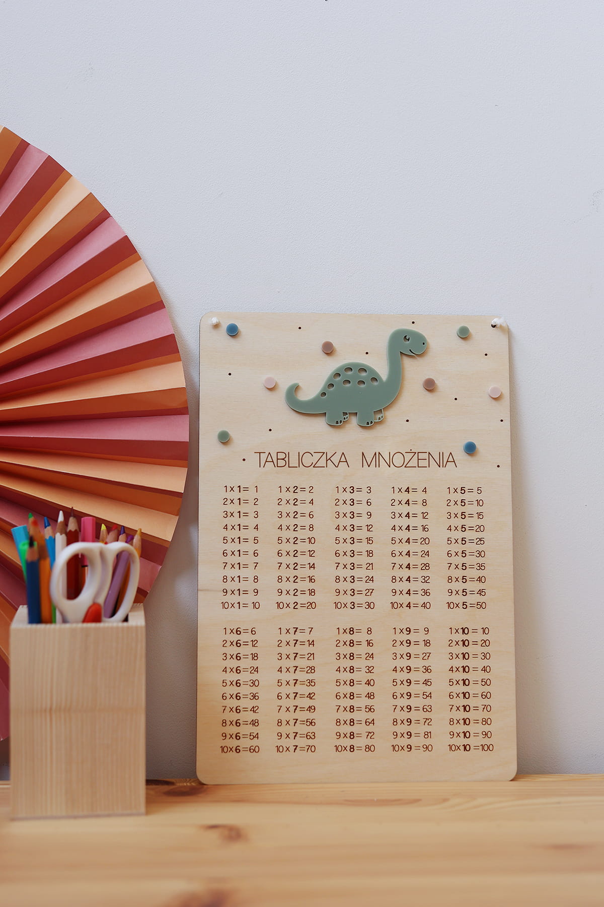 Drewniana pomoc edukacyjna z grawerowaną tabliczką mnożenia. Ułatwia naukę matematyki i stanowi kolorową dekorację pokoju dziecięcego. Na tabliczce może się znaleźć dowolne imię lub hasło "Tabliczka mnożenia"