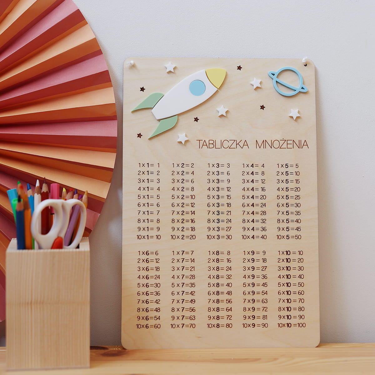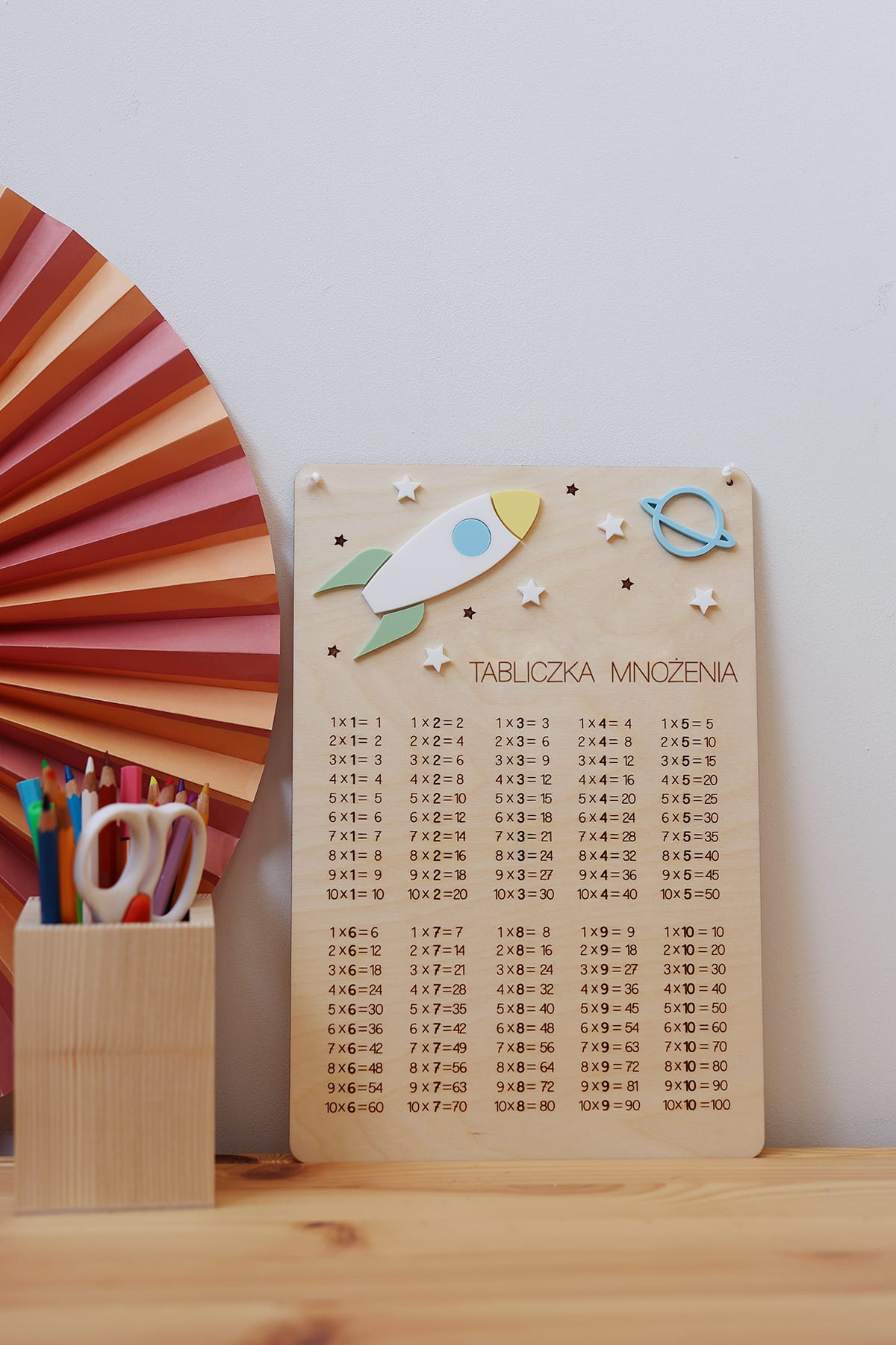 Drewniana pomoc edukacyjna z grawerowaną tabliczką mnożenia. Ułatwia naukę matematyki i stanowi kolorową dekorację pokoju dziecięcego. Na tabliczce może się znaleźć dowolne imię lub hasło "Tabliczka mnożenia"
