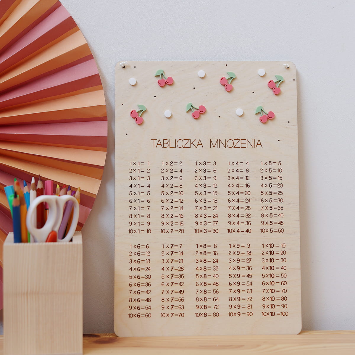 Drewniana pomoc edukacyjna z grawerowaną tabliczką mnożenia. Ułatwia naukę matematyki i stanowi kolorową dekorację pokoju dziecięcego. Na tabliczce może się znaleźć dowolne imię lub hasło "Tabliczka mnożenia"