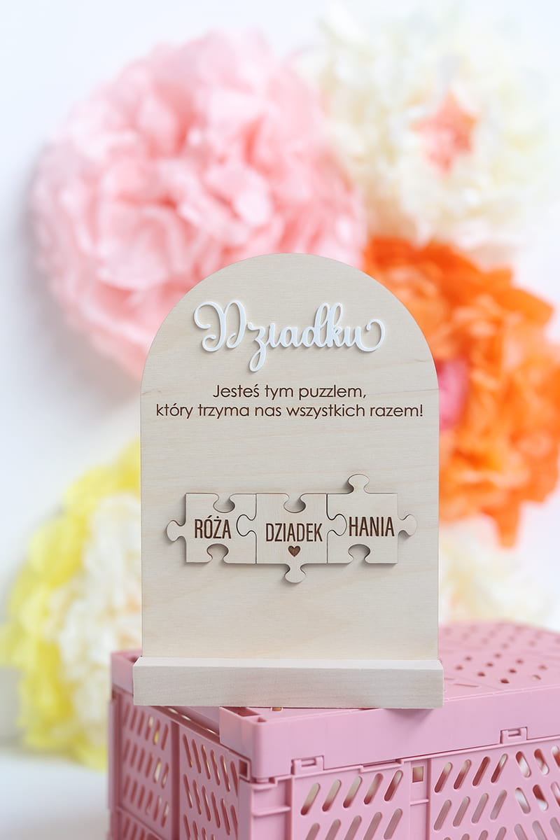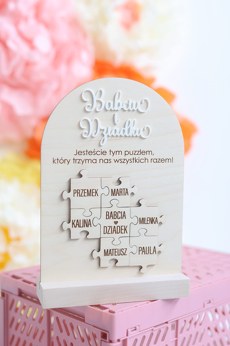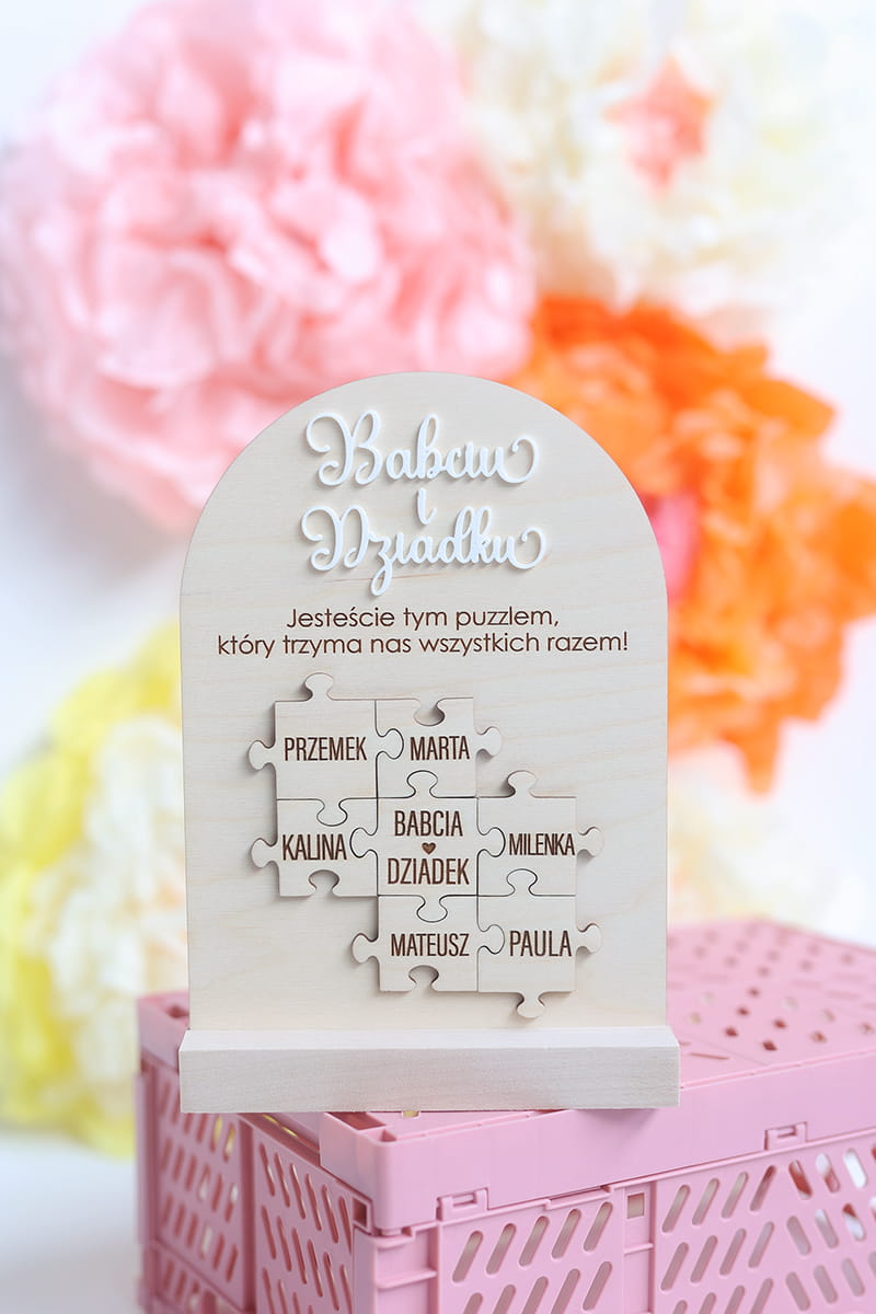 Wzruszająca tabliczka z motywem puzzli. Dedykowana Babci, Dziadkowi lub obojgu. Do tabliczki dołączona jest solidna, bukowa podstawka.